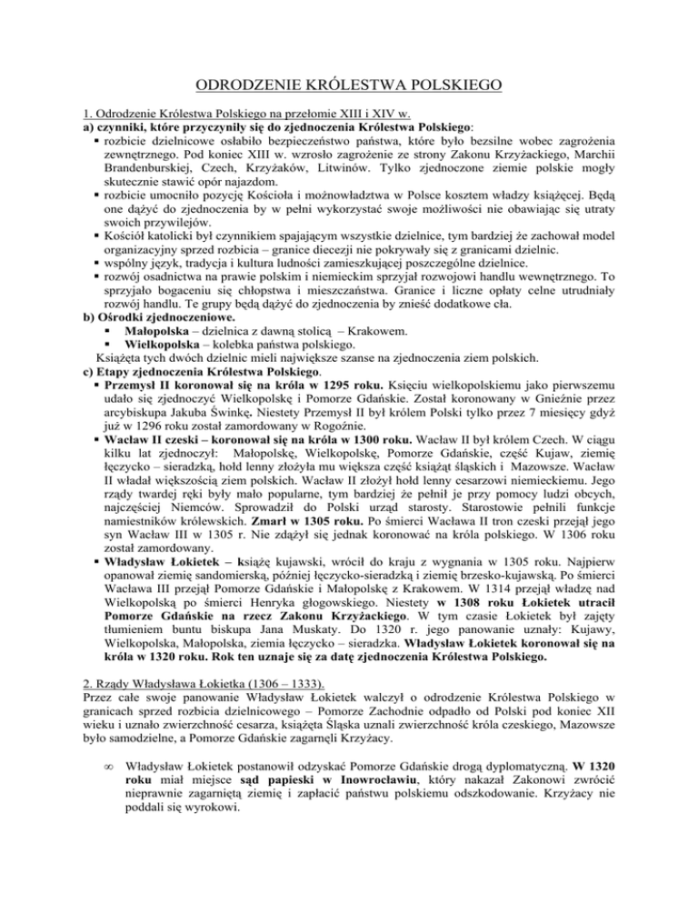ODRODZENIE KRÓLESTWA POLSKIEGO 1. Odrodzenie Królestwa Polskiego na przełomie XIII i XIV w. a) czynniki, które przyczyniły się do zjednoczenia Królestwa Polskiego: rozbicie dzielnicowe osłabiło bezpieczeństwo państwa, które było bezsilne wobec zagrożenia zewnętrznego. Pod koniec XIII w. wzrosło zagrożenie ze strony Zakonu Krzyżackiego, Marchii Brandenburskiej, Czech, Krzyżaków, Litwinów. Tylko zjednoczone ziemie polskie mogły skutecznie stawić opór najazdom. rozbicie umocniło pozycję Kościoła i możnowładztwa w Polsce kosztem władzy książęcej. Będą one dążyć do zjednoczenia by w pełni wykorzystać swoje możliwości nie obawiając się utraty swoich przywilejów. Kościół katolicki był czynnikiem spajającym wszystkie dzielnice, tym bardziej że zachował model organizacyjny sprzed rozbicia – granice diecezji nie pokrywały się z granicami dzielnic. wspólny język, tradycja i kultura ludności zamieszkującej poszczególne dzielnice. rozwój osadnictwa na prawie polskim i niemieckim sprzyjał rozwojowi handlu wewnętrznego. To sprzyjało bogaceniu się chłopstwa i mieszczaństwa. Granice i liczne opłaty celne utrudniały rozwój handlu. Te grupy będą dążyć do zjednoczenia by znieść dodatkowe cła. b) Ośrodki zjednoczeniowe. Małopolska – dzielnica z dawną stolicą – Krakowem. Wielkopolska – kolebka państwa polskiego. Książęta tych dwóch dzielnic mieli największe szanse na zjednoczenia ziem polskich. c) Etapy zjednoczenia Królestwa Polskiego. Przemysł II koronował się na króla w 1295 roku. Księciu wielkopolskiemu jako pierwszemu udało się zjednoczyć Wielkopolskę i Pomorze Gdańskie. Został koronowany w Gnieźnie przez arcybiskupa Jakuba Świnkę. Niestety Przemysł II był królem Polski tylko przez 7 miesięcy gdyż już w 1296 roku został zamordowany w Rogoźnie. Wacław II czeski – koronował się na króla w 1300 roku. Wacław II był królem Czech. W ciągu kilku lat zjednoczył: Małopolskę, Wielkopolskę, Pomorze Gdańskie, część Kujaw, ziemię łęczycko – sieradzką, hołd lenny złożyła mu większa część książąt śląskich i Mazowsze. Wacław II władał większością ziem polskich. Wacław II złożył hołd lenny cesarzowi niemieckiemu. Jego rządy twardej ręki były mało popularne, tym bardziej że pełnił je przy pomocy ludzi obcych, najczęściej Niemców. Sprowadził do Polski urząd starosty. Starostowie pełnili funkcje namiestników królewskich. Zmarł w 1305 roku. Po śmierci Wacława II tron czeski przejął jego syn Wacław III w 1305 r. Nie zdążył się jednak koronować na króla polskiego. W 1306 roku został zamordowany. Władysław Łokietek – książę kujawski, wrócił do kraju z wygnania w 1305 roku. Najpierw opanował ziemię sandomierską, później łęczycko-sieradzką i ziemię brzesko-kujawską. Po śmierci Wacława III przejął Pomorze Gdańskie i Małopolskę z Krakowem. W 1314 przejął władzę nad Wielkopolską po śmierci Henryka głogowskiego. Niestety w 1308 roku Łokietek utracił Pomorze Gdańskie na rzecz Zakonu Krzyżackiego. W tym czasie Łokietek był zajęty tłumieniem buntu biskupa Jana Muskaty. Do 1320 r. jego panowanie uznały: Kujawy, Wielkopolska, Małopolska, ziemia łęczycko – sieradzka. Władysław Łokietek koronował się na króla w 1320 roku. Rok ten uznaje się za datę zjednoczenia Królestwa Polskiego. 2. Rządy Władysława Łokietka (1306 – 1333). Przez całe swoje panowanie Władysław Łokietek walczył o odrodzenie Królestwa Polskiego w granicach sprzed rozbicia dzielnicowego – Pomorze Zachodnie odpadło od Polski pod koniec XII wieku i uznało zwierzchność cesarza, książęta Śląska uznali zwierzchność króla czeskiego, Mazowsze było samodzielne, a Pomorze Gdańskie zagarnęli Krzyżacy. • Władysław Łokietek postanowił odzyskać Pomorze Gdańskie drogą dyplomatyczną. W 1320 roku miał miejsce sąd papieski w Inowrocławiu, który nakazał Zakonowi zwrócić nieprawnie zagarniętą ziemię i zapłacić państwu polskiemu odszkodowanie. Krzyżacy nie poddali się wyrokowi. • • W 1326 Krzyżacy najechali na Wielkopolskę, a następnie na Kujawy. Wojna polskokrzyżacka z lat 1329 – 1332 (lub 1327-1332) nie była dla Polski korzystna. Krzyżacy zajęli ziemie dobrzyńską (1329) i Kujawy (1332) mimo zwycięskiej dla Łokietka bitwy pod Płowcami (1332). Tuż przed śmiercią Władysław Łokietek władał Wielkopolską i Małopolską.