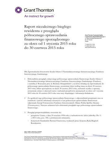 Raport niezależnego biegłego rewidenta z przeglądu półrocznego sprawozdania finansowego sporządzonego za okres od 1 stycznia 2015 roku do 30 czerwca 2015 roku Grant Thornton Frąckowiak Spółka z ograniczoną odpowiedzialnością sp. k. ul. Abpa Antoniego Baraniaka 88 E 61-131 Poznań Polska T +48 61 62 51 100 F +48 61 62 51 101 www.GrantThornton.pl Dla Zgromadzenia Inwestorów Kredyt Inkaso I Niestandaryzowanego Sekurytyzacyjnego Funduszu Inwestycyjnego Zamkniętego 1 Dokonaliśmy przeglądu załączonego półrocznego sprawozdania finansowego Kredyt Inkaso I Niestandaryzowanego Sekurytyzacyjnego Funduszu Inwestycyjnego Zamkniętego (Fundusz), z siedzibą w Warszawie przy ul. Rodziny Hiszpańskich 1, na które składają się wprowadzenie do półrocznego sprawozdania finansowego, zestawienie lokat według stanu na dzień 30 czerwca 2015 roku, bilans sporządzony na dzień 30 czerwca 2015 roku, rachunek wyniku z operacji, zestawienie zmian w aktywach netto i rachunek przepływów pieniężnych za okres od 1 stycznia 2015 roku do 30 czerwca 2015 roku oraz noty objaśniające i informacja dodatkowa. 2 Za zgodność tego półrocznego sprawozdania finansowego z odpowiednimi przepisami oraz za rzetelność i jasność informacji zawartych w tym półrocznym sprawozdaniu finansowym odpowiada Zarząd Towarzystwa Funduszy Inwestycyjnych Allianz Polska Spółka Akcyjna (Towarzystwo). Naszym zadaniem było dokonanie przeglądu tego półrocznego sprawozdania finansowego. 3 Przegląd przeprowadziliśmy stosownie do: przepisów Ustawy z dnia 29 września 1994 roku o rachunkowości (tekst jednolity: Dz. U. z 2013 roku, poz. 330, z późniejszymi zmianami), Krajowych Standardów Rewizji Finansowej, wydanych przez Krajową Radę Biegłych Rewidentów. Audyt – Podatki – Outsourcing – Doradztwo Member of Grant Thornton International Ltd Grant Thornton Frąckowiak Spółka z ograniczoną odpowiedzialnością sp. k. Podmiot uprawniony do badania sprawozdań finansowych nr 3654. Komplementariusz: Grant Thornton Frąckowiak Sp. z o.o. Zarząd komplementariusza: Cecylia Pol – Prezes Zarządu, Tomasz Wróblewski – Wiceprezes Zarządu. Adres siedziby: 61-131 Poznań, ul. Abpa Antoniego Baraniaka 88 E. NIP: 778-14-76-013, REGON: 301591100. Rachunek bankowy: 18 1750 1019 0000 0000 0098 2229. Sąd Rejonowy Poznań – Nowe Miasto i Wilda w Poznaniu, VIII Wydział Gospodarczy, nr KRS 0000369868. 2 Wskazane wyżej standardy nakładają na nas obowiązek zaplanowania i przeprowadzenia przeglądu w taki sposób, aby uzyskać umiarkowaną pewność, że sprawozdanie finansowe nie zawiera istotnych nieprawidłowości. Przeglądu dokonaliśmy głównie drogą analizy danych półrocznego sprawozdania finansowego, wglądu w księgi rachunkowe oraz wykorzystania informacji uzyskanych od Zarządu Towarzystwa oraz personelu odpowiedzialnego za finanse i księgowość Funduszu. Zakres i metoda przeglądu sprawozdania finansowego istotnie różnią się od badań leżących u podstaw opinii wyrażanej o zgodności z wymagającymi zastosowania zasadami (polityką) rachunkowości rocznego sprawozdania finansowego oraz o jego rzetelności i jasności, dlatego nie możemy wydać takiej opinii o załączonym półrocznym sprawozdaniu finansowym. 4 Dokonany przez nas przegląd nie wykazał niczego, co nie pozwoliłoby stwierdzić, że załączone półroczne sprawozdanie finansowe jest zgodne z wymagającymi zastosowania zasadami rachunkowości oraz że rzetelnie i jasno przedstawia, we wszystkich istotnych aspektach, sytuację majątkową i finansową Funduszu na dzień 30 czerwca 2015 roku oraz jego wynik z operacji za okres od 1 stycznia 2015 roku do 30 czerwca 2015 roku, zgodnie z zasadami rachunkowości określonymi w Ustawie z dnia 29 września 1994 roku o rachunkowości i wydanymi na jej podstawie przepisami, a w szczególności w Rozporządzeniu Ministra Finansów z dnia 24 grudnia 2007 roku w sprawie szczególnych zasad rachunkowości funduszy inwestycyjnych (Dz. U. Nr 249 poz. 1859). 5 Do załączonego półrocznego sprawozdania finansowego dołączono list Zarządu Towarzystwa oraz oświadczenie depozytariusza. Elżbieta Grześkowiak Biegły Rewident nr 5014 Kluczowy biegły rewident przeprowadzający przegląd w imieniu Grant Thornton Frąckowiak Spółka z ograniczoną odpowiedzialnością sp. k., Poznań, ul. Abpa Antoniego Baraniaka 88 E, podmiot uprawniony do badania sprawozdań finansowych, numer ewidencyjny 3654 Poznań, dnia 7 sierpnia 2015 roku. © 2015 Grant Thornton Frąckowiak Spółka z ograniczoną odpowiedzialnością sp. k. Wszelkie prawa zastrzeżone.
