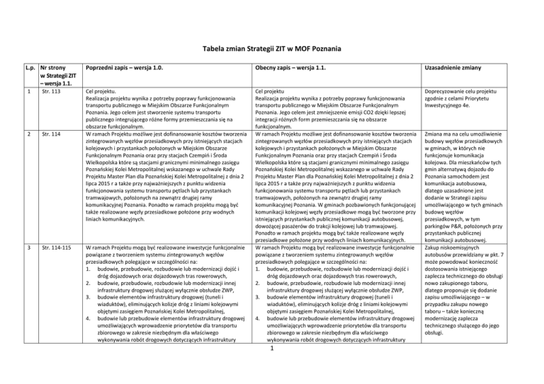 Tabela zmian Strategii ZIT w MOF Poznania L.p. Nr strony w Strategii ZIT – wersja 1.1. 1 Str. 113 2 Str. 114 3 Str. 114-115 Poprzedni zapis – wersja 1.0. Obecny zapis – wersja 1.1. Uzasadnienie zmiany Cel projektu. Realizacja projektu wynika z potrzeby poprawy funkcjonowania transportu publicznego w Miejskim Obszarze Funkcjonalnym Poznania. Jego celem jest stworzenie systemu transportu publicznego integrującego różne formy przemieszczania się na obszarze funkcjonalnym. W ramach Projektu możliwe jest dofinansowanie kosztów tworzenia zintegrowanych węzłów przesiadkowych przy istniejących stacjach kolejowych i przystankach położonych w Miejskim Obszarze Funkcjonalnym Poznania oraz przy stacjach Czempiń i Środa Wielkopolska które są stacjami granicznymi minimalnego zasięgu Poznańskiej Kolei Metropolitalnej wskazanego w uchwale Rady Projektu Master Plan dla Poznańskiej Kolei Metropolitalnej z dnia 2 lipca 2015 r a także przy najważniejszych z punktu widzenia funkcjonowania systemu transportu pętlach lub przystankach tramwajowych, położonych na zewnątrz drugiej ramy komunikacyjnej Poznania. Ponadto w ramach projektu mogą być także realizowane węzły przesiadkowe położone przy wodnych liniach komunikacyjnych. Cel projektu Realizacja projektu wynika z potrzeby poprawy funkcjonowania transportu publicznego w Miejskim Obszarze Funkcjonalnym Poznania. Jego celem jest zmniejszenie emisji CO2 dzięki lepszej integracji różnych form przemieszczania się na obszarze funkcjonalnym. W ramach Projektu możliwe jest dofinansowanie kosztów tworzenia zintegrowanych węzłów przesiadkowych przy istniejących stacjach kolejowych i przystankach położonych w Miejskim Obszarze Funkcjonalnym Poznania oraz przy stacjach Czempiń i Środa Wielkopolska które są stacjami granicznymi minimalnego zasięgu Poznańskiej Kolei Metropolitalnej wskazanego w uchwale Rady Projektu Master Plan dla Poznańskiej Kolei Metropolitalnej z dnia 2 lipca 2015 r a także przy najważniejszych z punktu widzenia funkcjonowania systemu transportu pętlach lub przystankach tramwajowych, położonych na zewnątrz drugiej ramy komunikacyjnej Poznania. W gminach pozbawionych funkcjonującej komunikacji kolejowej węzły przesiadkowe mogą być tworzone przy istniejących przystankach publicznej komunikacji autobusowej, dowożącej pasażerów do trakcji kolejowej lub tramwajowej. Ponadto w ramach projektu mogą być także realizowane węzły przesiadkowe położone przy wodnych liniach komunikacyjnych. W ramach Projektu mogą być realizowane inwestycje funkcjonalnie powiązane z tworzeniem systemu zintegrowanych węzłów przesiadkowych polegające w szczególności na: 1. budowie, przebudowie, rozbudowie lub modernizacji dojść i dróg dojazdowych oraz dojazdowych tras rowerowych, 2. budowie, przebudowie, rozbudowie lub modernizacji innej infrastruktury drogowej służącej wyłącznie obsłudze ZWP, 3. budowie elementów infrastruktury drogowej (tuneli i wiaduktów), eliminujących kolizje dróg z liniami kolejowymi objętymi zasięgiem Poznańskiej Kolei Metropolitalnej, 4. budowie lub przebudowie elementów infrastruktury drogowej umożliwiających wprowadzenie priorytetów dla transportu zbiorowego w zakresie niezbędnym dla właściwego wykonywania robót drogowych dotyczących infrastruktury Doprecyzowanie celu projektu zgodnie z celami Priorytetu Inwestycyjnego 4e. W ramach Projektu mogą być realizowane inwestycje funkcjonalnie powiązane z tworzeniem systemu zintegrowanych węzłów przesiadkowych polegające w szczególności na: 1. budowie, przebudowie, rozbudowie lub modernizacji dojść i dróg dojazdowych oraz dojazdowych tras rowerowych, 2. budowie, przebudowie, rozbudowie lub modernizacji innej infrastruktury drogowej służącej wyłącznie obsłudze ZWP, 3. budowie elementów infrastruktury drogowej (tuneli i wiaduktów), eliminujących kolizje dróg z liniami kolejowymi objętymi zasięgiem Poznańskiej Kolei Metropolitalnej, 4. budowie lub przebudowie elementów infrastruktury drogowej umożliwiających wprowadzenie priorytetów dla transportu zbiorowego w zakresie niezbędnym dla właściwego wykonywania robót drogowych dotyczących infrastruktury 1 Zmiana ma na celu umożliwienie budowy węzłów przesiadkowych w gminach, w których nie funkcjonuje komunikacja kolejowa. Dla mieszkańców tych gmin alternatywą dojazdu do Poznania samochodem jest komunikacja autobusowa, dlatego uzasadnione jest dodanie w Strategii zapisu umożliwiającego w tych gminach budowę węzłów przesiadkowych, w tym parkingów P&R, położonych przy przystankach publicznej komunikacji autobusowej. Zakup niskoemisyjnych autobusów przewidziany w pkt. 7 może powodować konieczność dostosowania istniejącego zaplecza technicznego do obsługi nowo zakupionego taboru, dlatego proponuje się dodanie zapisu umożliwiającego – w przypadku zakupu nowego taboru – także konieczną modernizację zaplecza technicznego służącego do jego obsługi. transportu zbiorowego i uzasadnionych z punktu widzenia technologicznego, 5. budowie systemów zarządzania i organizacji ruchu (w tym systemów oznakowania i informacji pasażerskiej, gromadzenia i przetwarzania danych, dystrybucji i identyfikacji biletów, wspólny bilet i inne), 6. budowie, przebudowie, rozbudowie lub modernizacji parkingów typu P&R, B&R, K&R wraz z urządzeniami towarzyszącymi (np. system monitorowania, zarządzania), a także budowli i budynków stanowiących infrastrukturę niezbędną do obsługi podróżnych, 7. zakupie autobusów niskoemisyjnych służących do dowożenia pasażerów do ZWP, 8. inwestycjach związanych z przygotowaniem miejsc leżących w obrębie ZWP, przeznaczonych na towarzyszące usługi transportowe (np. wypożyczalnia samochodów elektrycznych, wypożyczalnia rowerów publicznych/miejskich), 9. działaniach informacyjno-promocyjnych zachęcających do korzystania z niskoemisyjnych form mobilności miejskie