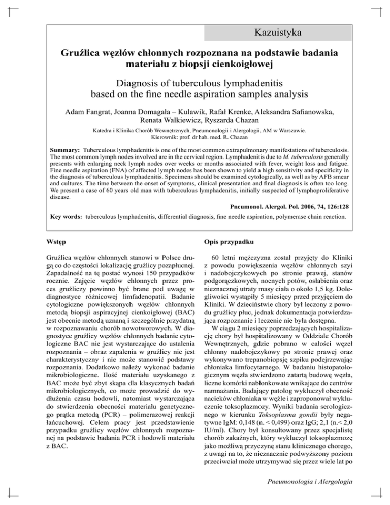 Kazuistyka Gruźlica węzłów chłonnych rozpoznana na podstawie badania materiału z biopsji cienkoigłowej Diagnosis of tuberculous lymphadenitis based on the fine needle aspiration samples analysis Adam Fangrat, Joanna Domagała – Kulawik, Rafał Krenke, Aleksandra Safianowska, Renata Walkiewicz, Ryszarda Chazan Katedra i Klinika Chorób Wewnętrznych, Pneumonologii i Alergologii, AM w Warszawie. Kierownik: prof. dr hab. med. R. Chazan Summary: Tuberculous lymphadenitis is one of the most common extrapulmonary manifestations of tuberculosis. The most common lymph nodes involved are in the cervical region. Lymphadenitis due to M. tuberculosis generally presents with enlarging neck lymph nodes over weeks or months associated with fever, weight loss and fatigue. Fine needle aspiration (FNA) of affected lymph nodes has been shown to yield a high sensitivity and specificity in the diagnosis of tuberculous lymphadenitis. Specimens should be examined cytologically, as well as by AFB smear and cultures. The time between the onset of symptoms, clinical presentation and final diagnosis is often too long. We present a case of 60 years old man with tuberculous lymphadenitis, initially suspected of lymphoproliferative disease. Pneumonol. Alergol. Pol. 2006, 74, 126:128 Key words: tuberculous lymphadenitis, differential diagnosis, fine needle aspiration, polymerase chain reaction. Wstęp Opis przypadku Gruźlica węzłów chłonnych stanowi w Polsce drugą co do częstości lokalizację gruźlicy pozapłucnej. Zapadalność na tę postać wynosi 150 przypadków rocznie. Zajęcie węzłów chłonnych przez proces gruźliczy powinno być brane pod uwagę w diagnostyce różnicowej limfadenopatii. Badanie cytologiczne powiększonych węzłów chłonnych metodą biopsji aspiracyjnej cienkoigłowej (BAC) jest obecnie metodą uznaną i szczególnie przydatną w rozpoznawaniu chorób nowotworowych. W diagnostyce gruźlicy węzłów chłonnych badanie cytologiczne BAC nie jest wystarczające do ustalenia rozpoznania – obraz zapalenia w gruźlicy nie jest charakterystyczny i nie może stanowić podstawy rozpoznania. Dodatkowo należy wykonać badanie mikrobiologiczne. Ilość materiału uzyskanego z BAC może być zbyt skąpa dla klasycznych badań mikrobiologicznych, co może prowadzić do wydłużenia czasu hodowli, natomiast wystarczająca do stwierdzenia obecności materiału genetycznego prątka metodą (PCR) – polimerazowej reakcji łańcuchowej. Celem pracy jest przedstawienie przypadku gruźlicy węzłów chłonnych rozpoznanej na podstawie badania PCR i hodowli materiału z BAC. 60 letni mężczyzna został przyjęty do Kliniki z powodu powiększenia węzłów chłonnych szyi i nadobojczykowych po stronie prawej, stanów podgorączkowych, nocnych potów, osłabienia oraz nieznacznej utraty masy ciała o około 1,5 kg. Dolegliwości wystąpiły 5 miesięcy przed przyjęciem do Kliniki. W dzieciństwie chory był leczony z powodu gruźlicy płuc, jednak dokumentacja potwierdzająca rozpoznanie i leczenie nie była dostępna. W ciągu 2 miesięcy poprzedzających hospitalizację chory był hospitalizowany w Oddziale Chorób Wewnętrznych, gdzie pobrano w całości węzeł chłonny nadobojczykowy po stronie prawej oraz wykonywano trepanobiopsję szpiku podejrzewając chłoniaka limfocytarnego. W badaniu histopatologicznym węzła stwierdzono zatartą budowę węzła, liczne komórki nabłonkowate wnikające do centrów namnażania. Badający patolog wykluczył obecność nacieków chłoniaka w węźle i zaproponował wykluczenie toksoplazmozy. Wyniki badania serologicznego w kierunku Toksoplasma gondii były negatywne IgM: 0,148 (n. < 0,499) oraz IgG; 2,1 (n.< 2,0 IU/ml). Chory był konsultowany przez specjalistę chorób zakaźnych, który wykluczył toksoplazmozę jako możliwą przyczynę stanu klinicznego chorego, z uwagi na to, że nieznacznie podwyższony poziom przeciwciał może utrzymywać się przez wiele lat po Pneumonologia i Alergologia Gruźłica węzłów chłonnych – rozpoznanie BAC zakażeniu. Badania w kierunku zakażenia wirusem HIV również były negatywne. W badaniu szpiku stwierdzono odmłodzenie układu granulocytarnego do linii promielocytów (20%), co zostało zinterpretowane jako reakcja odczynowa na możliwe zakażenie oraz zwiększenie odsetka limfocytów do 33% (w tym 3% prolimfocytów) i skłoniło patologa do wysunięcia podejrzenia chłoniaka limfocytarnego. Chory został wypisany z Oddziału i skierowany do Poradni Hematologicznej w celu dalszej diagnostyki. W Poradni Hematologicznej chory miał jeszcze dwukrotnie pobrane węzły chłonne szyjne prawe. W pierwszym pobraniu stwierdzono obecność drobnych węzłów odczynowo zmienionych. W drugim badaniu stwierdzono w całości martwiczo zmieniony węzeł chłonny (martwica skrzepowa). W barwieniu auraminą nie stwierdzono obecności prątków. Badający patolog zasugerował wykonanie badań w kierunku zakażenia prątkami gruźlicy. Ponownie wykluczono obecność nacieków chłoniaka. Z powodu utrzymywania się dolegliwości ogólnych chory został skierowany do naszej Kliniki w celu dalszej diagnostyki. Przy przyjęciu chory był w dobrym stanie ogólnym, na szyi widoczny był obrzęk i naciek tkanek miękkich oraz sącząca rana w miejscu pobrania węzłów chłonnych. Obraz przypominał przetoki węzłowe. Palpacyjnie wyczuwalne były powiększone węzły chłonne po stronie prawej. Zanik prawego mięśnia naramiennego, prawdopodobnie wtórny do porażenia nerwów dodatkowych po pobraniach węzłów chłonnych. Poza tym bez innych istotnych odchyleń w badaniu przedmiotowym. W badaniach krwi: OB. 12mm/1godz., CRP 9,8 mg/l (n.< 10 mg/l), morfologia: Ht 35,8 %, Hb 11,3 g/dl; Erytrocyty 3,58 mln/mm3, MCHC 31,7 g/dl, MCV 100,0 fl; leukocyty 4,73 tyś/mm3. Rozmaz: pałki 1%, granulocyty obojętnochłonne 48%; limfocyty 38%; granulocyty kwasochłonne 7%; monocyty 6%. W rentgenogramie klatki piersiowej w szczycie 