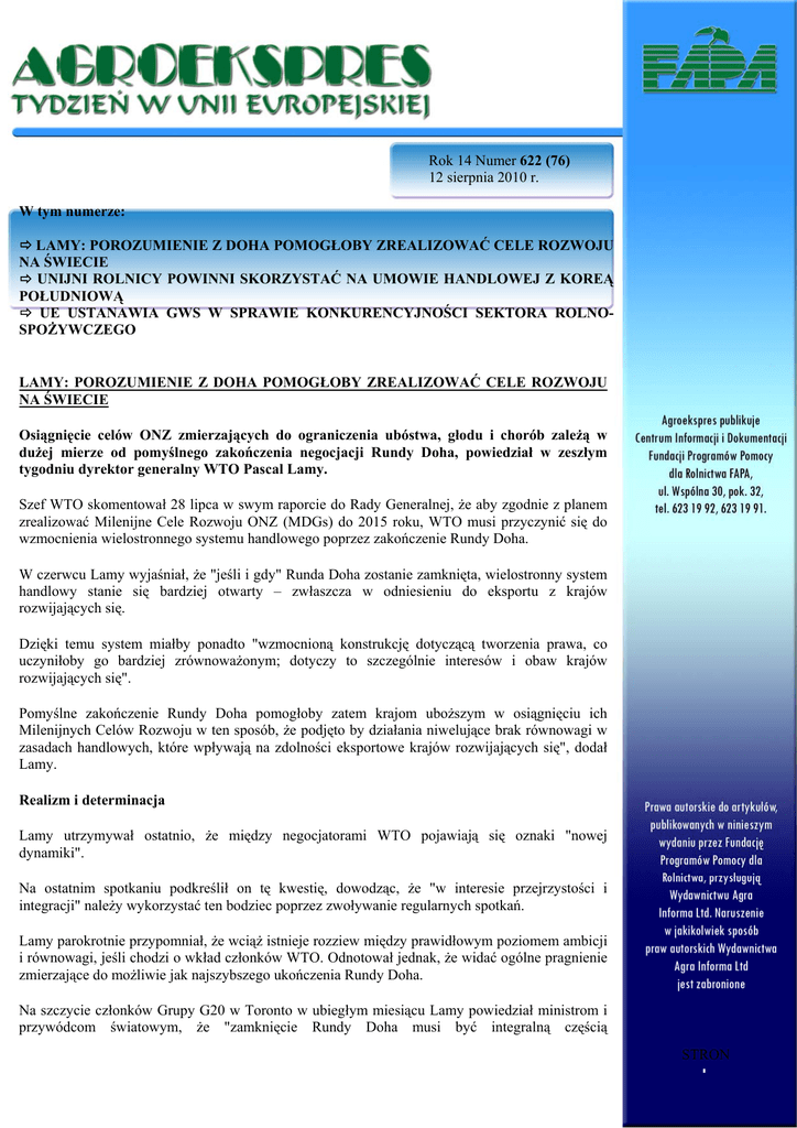 Rok 14 Numer 622 (76) 12 sierpnia 2010 r. W tym numerze: Ö LAMY: POROZUMIENIE Z DOHA POMOGŁOBY ZREALIZOWAĆ CELE ROZWOJU NA ŚWIECIE Ö UNIJNI ROLNICY POWINNI SKORZYSTAĆ NA UMOWIE HANDLOWEJ Z KOREĄ POŁUDNIOWĄ Ö UE USTANAWIA GWS W SPRAWIE KONKURENCYJNOŚCI SEKTORA ROLNOSPOŻYWCZEGO LAMY: POROZUMIENIE Z DOHA POMOGŁOBY ZREALIZOWAĆ CELE ROZWOJU NA ŚWIECIE Osiągnięcie celów ONZ zmierzających do ograniczenia ubóstwa, głodu i chorób zależą w dużej mierze od pomyślnego zakończenia negocjacji Rundy Doha, powiedział w zeszłym tygodniu dyrektor generalny WTO Pascal Lamy. Szef WTO skomentował 28 lipca w swym raporcie do Rady Generalnej, że aby zgodnie z planem zrealizować Milenijne Cele Rozwoju ONZ (MDGs) do 2015 roku, WTO musi przyczynić się do wzmocnienia wielostronnego systemu handlowego poprzez zakończenie Rundy Doha. W czerwcu Lamy wyjaśniał, że "jeśli i gdy" Runda Doha zostanie zamknięta, wielostronny system handlowy stanie się bardziej otwarty – zwłaszcza w odniesieniu do eksportu z krajów rozwijających się. Dzięki temu system miałby ponadto "wzmocnioną konstrukcję dotyczącą tworzenia prawa, co uczyniłoby go bardziej zrównoważonym; dotyczy to szczególnie interesów i obaw krajów rozwijających się". Pomyślne zakończenie Rundy Doha pomogłoby zatem krajom uboższym w osiągnięciu ich Milenijnych Celów Rozwoju w ten sposób, że podjęto by działania niwelujące brak równowagi w zasadach handlowych, które wpływają na zdolności eksportowe krajów rozwijających się", dodał Lamy. Realizm i determinacja Lamy utrzymywał ostatnio, że między negocjatorami WTO pojawiają się oznaki "nowej dynamiki". Na ostatnim spotkaniu podkreślił on tę kwestię, dowodząc, że "w interesie przejrzystości i integracji" należy wykorzystać ten bodziec poprzez zwoływanie regularnych spotkań. Lamy parokrotnie przypomniał, że wciąż istnieje rozziew między prawidłowym poziomem ambicji i równowagi, jeśli chodzi o wkład członków WTO. Odnotował jednak, że widać ogólne pragnienie zmierzające do możliwie jak najszybszego ukończenia Rundy Doha. Na szczycie członków Grupy G20 w Toronto w ubiegłym miesiącu Lamy powiedział ministrom i przywódcom światowym, że "zamknięcie Rundy Doha musi być integralną częścią STRON 1 skoordynowanej strategii G20 w kierunku rozwoju". Przywódcy wzbraniali się jednak przed zobowiązaniem się do wyznaczenia definitywnego harmonogramu zmian, powtarzając jedynie słowa o potrzebie "pomyślnego zakończenia" negocjacji handlowych. Tymczasem przewodniczący WTO David Walker ogłosił, że następne spotkanie członków WTO w pełnym składzie odbędzie się 27 września i w razie potrzeby przeciągnie się na kolejny dzień. Kolejne spotkanie członków WTO w pełnym składzie zorganizowane zostanie w późniejszym terminie i poświęcone zostanie omówieniu pewnych modeli – nie podano jednak na razie daty. Wrześniowy szczyt dot. Milenijnych Celów Rozwoju w Nowym Jorku zajmie się postępem osiągniętym w zwalczaniu ubóstwa. Źródło: Agra Europe Weekly z 6 sierpnia 2010 r. “Lamy: Doha deal would help meet world development goals” UNIJNI ROLNICY POWINNI SKORZYSTAĆ NA UMOWIE HANDLOWEJ Z KOREĄ POŁUDNIOWĄ Podczas gdy świat czeka na udane zakończenie bardzo opóźnionej Agendy Rozwoju z Doha, nabierają tempa ważne negocjacje dwustronne w sprawie handlu rolno-spożywczego pomiędzy Koreą Południową a Unią Europejską. Korea Południowa jest 14. co do wielkości gospodarką świata, liczącą niemal 50 mln konsumentów. Do końca tego roku spodziewana jest ratyfikacja umowy o wolnym handlu między Koreą a Unią Europejską, przedstawiająca pomyślne perspektywy zwiększonego eksportu – na czym skorzystać mają obie strony. UE jest dla Korei drugim partnerem handlowym po Chinach, natomiast Korea jest dla UE ósmym rynkiem eksportowym. Porozumienie wyeliminuje 97% wszystkich taryf w ciągu trzech lat – przy czym wiele z nich natychmiast, a tym samym uwolni unijnych eksporterów od konieczność opłacania cła o wartości 1,6 mld euro rocznie. Umowa o wolnym handlu UE z Koreą została podpisana w październiku ub. roku, ale wciąż trwają negocjacje w sprawie ostatecznych szczegółów. Na początku lipca rozmowy przyśpieszyły, co zwiększyło nadzieje na ratyfikowanie umowy przed szczytem G20 w Seulu, który ma zostać zorganizowany w listopadzie br., pomimo rosnącej presji ze strony europejskiego przemysłu motoryzacyjnego. "Europejscy producenci samochodów wydreptują wciąż ścieżki na schodach i w salach parlamentu", skomentował szef unijnej delegacji Christian Ehler. "Ale wśród liderów głównych ugrupowań politycznych jest gotowość do przeforsowania Umowy o wolnym handlu w parlamencie do końca tego roku. Myślę, że zdążymy to zrobić w tym terminie". Umowa wciąż wymaga jednak zgody parlamentu z obydwu stron, a europosłowie apelują o solidne klauzule ochronne. Ehler wyjaśnił, że wszelkie opóźnienia wynikają przede wszystkim z mozolnych wysiłków tłumaczenia umowy na 16 urzędowych języków Wspólnoty. Oczekuje on, że tłumaczenia zostaną ukończone do sierpnia, przed pierwszym czytaniem dokumentu w Parlamencie Europejskim, które ma rozpocząć się we wrześniu. STRON 2 Mimo tej zwłoki, główną zaletą dla europejskich eksporterów z punktu widzenia konkurencyjności jest fakt, że wejście w życie umowy o wolnym handlu jest spodziewane na długo przed podobnym porozumieniem z USA. Rozmowy z tym partnerem utknęły w martwym punkcie na trzy lata z powodu kontrowersji dotyczących samochodów, artykułów rolno-spożywczych i innych kluczowych kwestii. Podobne porozumienia z Kanadą, Australią, Nową Zelandią i Kolumbią są w trakcie negocjacji, ale ich zakończenie jest dopiero melodią przyszłości. Oczekuje się, że korzyści z tytułu umowy dla firm brytyjskich wyniosą około 500 mln funtów (604 mln euro) rocznie, bio