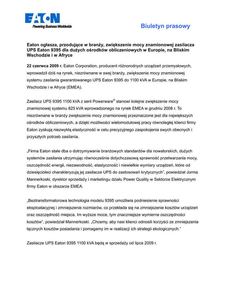 Biuletyn prasowy Eaton ogłasza, przodujące w branży, zwiększenie mocy znamionowej zasilacza UPS Eaton 9395 dla dużych ośrodków obliczeniowych w Europie, na Bliskim Wschodzie i w Afryce 22 czerwca 2009 r. Eaton Corporation, producent różnorodnych urządzeń przemysłowych, wprowadził dziś na rynek, niezrównane w swej branży, zwiększenie mocy znamionowej systemu zasilania gwarantowanego UPS Eaton 9395 do 1100 kVA w Europie, na Bliskim Wschodzie i w Afryce (EMEA). Zasilacz UPS 9395 1100 kVA z serii Powerware® stanowi kolejne zwiększenie mocy znamionowej systemu 825 kVA wprowadzonego na rynek EMEA w grudniu 2008 r. To niezrównane w branży zwiększenie mocy znamionowej przeznaczone jest dla największych ośrodków obliczeniowych, a dzięki możliwości wielomodułowej pracy równoległej klienci firmy Eaton zyskują niezwykłą elastyczność w celu precyzyjnego zaspokojenia swych obecnych i przyszłych potrzeb zasilania. „Firma Eaton stale dba o dotrzymywanie branżowych standardów dla nowatorskich, dużych systemów zasilania utrzymując równocześnie dotychczasową sprawność przetwarzania mocy, oszczędność energii, niezawodność, elastyczność i niewielkie wymiary urządzeń, które od dziesięcioleci charakteryzują jej zasilacze UPS do zastosowań krytycznych”, powiedział Jorma Mannerkoski, dyrektor sprzedaży i marketingu działu Power Quality w Sektorze Elektrycznym firmy Eaton w obszarze EMEA. „Beztransformatorowa technologia modelu 9395 umożliwia podniesienie sprawności eksploatacyjnej i zmniejszenie rozmiarów, co przekłada się na zmniejszenie kosztów urządzeń oraz oszczędność miejsca. Im wyższe moce, tym znaczniejsze wymierne oszczędności kosztów”, powiedział Mannerkoski. „Chcemy, aby nasi klienci odnosili korzyści ze zmniejszenia łącznych kosztów posiadania i pomagamy im w realizacji ich strategii ekologicznych.” Zasilacze UPS Eaton 9395 1100 kVA będą w sprzedaży od lipca 2009 r. Dodatkowe informacje o zasilaczu 9395 można znaleźć pod adresem www.eaton.com/9395. Więcej o pełnym asortymencie wyrobów i usług firmy Eaton można dowiedzieć się z jej witryny internetowej www.eaton.com/powerquality. Dział elektryczny firmy Eaton przoduje na świecie pod względem wyrobów i usług w dziedzinach dystrybucji zasilania, jakości zasilania, sterowania i automatyki przemysłowej. Asortymenty wyrobów elektrycznych firmy Eaton, takie jak Cutler-Hammer®, Moeller®, Powerware®, Holec®, MEM®, Santak®, oraz MGE Office Protection Systems™ zapewniają nastawione na korzyści klientów rozwiązania zarządzania łańcuchem zasilania PowerChain Management® dla potrzeb zasilania w sektorach ośrodków obliczeniowych, przemysłowym, instytucjonalnym, administracji państwowej, użyteczności publicznej, komercyjnym, mieszkaniowym i OEM na całym świecie. Eaton Corporation oferuje różnorodne rozwiązania gospodarki energetycznej, jej obroty w r. 2008 wyniosły 15,4 mld. USD. Firma Eaton jest światowym liderem technologii komponentów i systemów elektrycznych dla urządzeń zasilania, dystrybucji zasilania i sterowania; komponentów hydraulicznych, systemów i usług dla urządzeń ruchomych i przemysłowych; systemów paliwowych, hydraulicznych i pneumatycznych komercyjnych i wojskowych, statków kosmicznych oraz dla systemów napędowych samochodów ciężarowych i osobowych charakteryzujących się wysoką sprawnością, oszczędnością zużycia paliwa oraz bezpieczeństwem. Firma Eaton zatrudnia ok. 75 000 pracowników i sprzedaje swe wyroby klientom w ponad 150 krajach. Więcej informacji można uzyskać pod adresem www.eaton.com