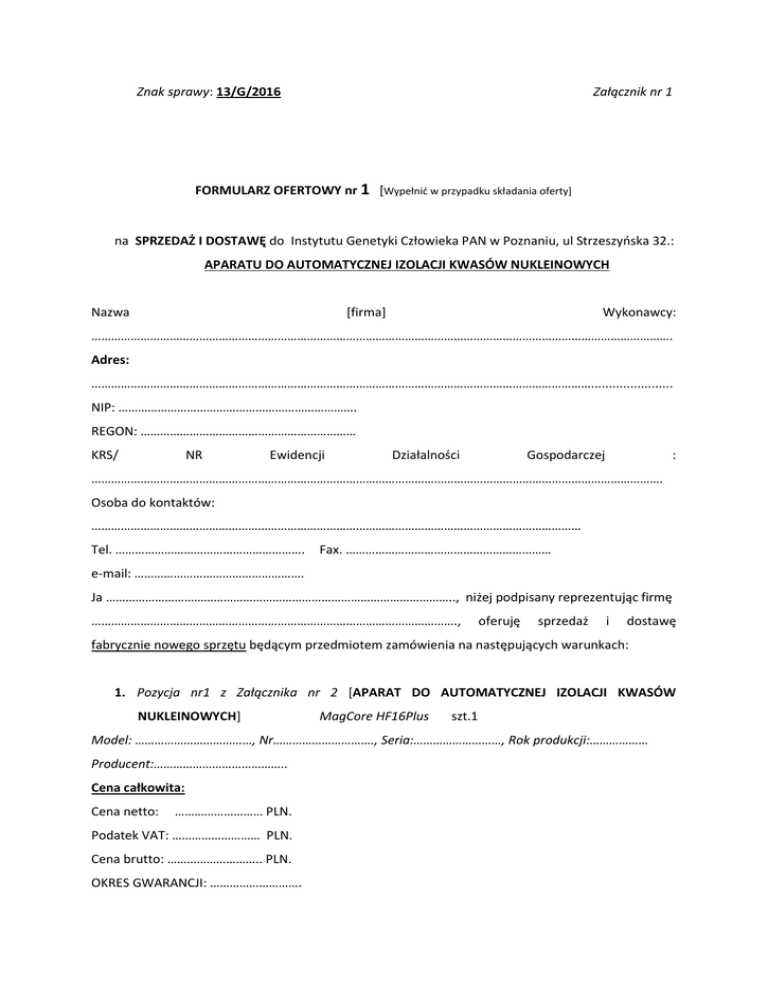 Znak sprawy: 13/G/2016 Załącznik nr 1 FORMULARZ OFERTOWY nr 1 [Wypełnić w przypadku składania oferty] na SPRZEDAŻ I DOSTAWĘ do Instytutu Genetyki Człowieka PAN w Poznaniu, ul Strzeszyńska 32.: APARATU DO AUTOMATYCZNEJ IZOLACJI KWASÓW NUKLEINOWYCH Nazwa [firma] Wykonawcy: ……………………………………………………………………………………………………………………………………………………………. Adres: ………………………………………………………………………………………………………………………………………....................... NIP: ………………………………………………………………. REGON: ………………………………………………………… KRS/ NR Ewidencji Działalności Gospodarczej : …………………………………………………………………………………………………………………………………………………………. Osoba do kontaktów: …………………………………………………………………………………………………………………………………… Tel. …………………………………………………. Fax. ……………………………………………………… e-mail: ……………………………………………. Ja …………………………………………………………………………………………….., niżej podpisany reprezentując firmę …………………………………………………………………………………………………., oferuję sprzedaż i dostawę fabrycznie nowego sprzętu będącym przedmiotem zamówienia na następujących warunkach: 1. Pozycja nr1 z Załącznika nr 2 [APARAT DO AUTOMATYCZNEJ IZOLACJI KWASÓW NUKLEINOWYCH] MagCore HF16Plus szt.1 Model: ………………………………, Nr…………………………., Seria:………………………, Rok produkcji:……………… Producent:………………………………….. Cena całkowita: Cena netto: ……………………… PLN. Podatek VAT: ……………………… PLN. Cena brutto: ……………………….. PLN. OKRES GWARANCJI: ………………………. MIEJSCE I ADRES SERWIEU: ………………………………………………………………………………………..………………………… TERMIN realizacji zamówienia licząc od dnia podpisania umowy: ………………………………………… . Oświadczenie Oświadczam, że nie jestem podmiotem powiązanym z Zamawiającym [Załącznik nr 3]. Oferowane przez nas urządzenie posiada wszystkie wymagane przez Zamawiającego parametry techniczne i spełnia wymagane przez Zamawiającego warunki. Zaoferowana cena zawiera wszystkie koszty niezbędne do należytego wykonania zamówienia. W przypadku wybrania naszej oferty, zobowiązujemy się zrealizować przedmiot zamówienia zgodnie z wymogami zapytania ofertowego. Integralną część niniejszego formularza ofertowego stanowi Załącznik nr 2 z WYMAGANYMI parametrami technicznymi i ilościowymi przedmiotu niniejszego postępowania. ……………………………………………………………………………. [data, pieczęć Wykonawcy lub osoby upoważnionej] Znak sprawy: 13/G/2016 Załącznik nr 1 FORMULARZ OFERTOWY nr 2 [Wypełnić w przypadku składania oferty] na SPRZEDAŻ I DOSTAWA do Instytutu Genetyki Człowieka PAN w Poznaniu, ul Strzeszyńska 32. : ZESTAWU DO ANALIZY Western blot – aparatu do elektrotransferu Nazwa [firma] Wykonawcy: ……………………………………………………………………………………………………………………………………………………………. Adres: ………………………………………………………………………………………………………………………………………....................... ......... NIP: ………………………………………………………………. REGON: ………………………………………………………… KRS/ NR Ewidencji Działalności Gospodarczej : …………………………………………………………………………………………….. Osoba do kontaktów: …………………………………………………………………………………………………………………………………… Tel. …………………………………………………. Fax. ……………………………………………………… e-mail: ……………………………………………. Ja …………………………………………………………………………………………….., niżej podpisany reprezentując firmę …………………………………………………………………………………………………., oferuję sprzedaż i dostawę fabrycznie nowego sprzętu będącym przedmiotem zamówienia na następujących warunkach: Pozycja nr 2 z Załącznika nr2 [ZESTAW DO ANALIZY Western blot – aparat do elektrotransferu] szt.1 2.1 Trans Blot Turbo Transfer System Nr kat. 1704155SP Model: ………………………………, Nr…………………………., Seria:………………………, Rok produkcji:……………… Producent:………………………………….. Cena całkowita: Cena netto: ……………………… PLN. Podatek VAT: ……………………… PLN. Cena brutto: ……………………….. PLN. OKRES GWARANCJI: ………………………. MIEJSCE ADRES SERWISU: ……………………………………………………………………………………………………………………….. TERMIN realizacji zamówienia licząc od dnia podpisania umowy: ……………………………………………. 2.2 Mini Trans Blot Electrophoretic Transfer Cell Nr kat. 1703930SP Model: ……………