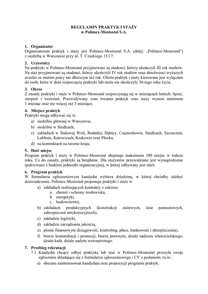 REGULAMIN PRAKTYK I STAśY w Polimex-Mostostal S.A. 1. Organizator Organizatorem praktyk i staŜy jest Polimex-Mostostal S.A. (dalej: „Polimex-Mostostal”) z siedzibą w Warszawie przy ul. T. Czackiego 15/17. 2. Uczestnicy Na praktyki w Polimex-Mostostal przyjmowani są studenci, którzy ukończyli III rok studiów. Na staŜ przyjmowani są studenci, którzy ukończyli IV rok studiów oraz absolwenci wyŜszych uczelni ze staŜem pracy nie dłuŜszym niŜ rok. Oferta praktyk i staŜy kierowana jest wyłącznie do osób, które w dniu rozpoczęcia praktyki lub staŜu nie ukończyły 30-tego roku Ŝycia. 3. Okres Z zasady praktyki i staŜe w Polimex-Mostostal rozpoczynają się w miesiącach letnich: lipiec, sierpień i wrzesień. Przewidywany czas trwania praktyk oraz staŜy wynosi minimum 1 miesiąc oraz nie więcej niŜ 3 miesiące. 4. Miejsce praktyk Praktyki mogą odbywać się w: a) siedzibie głównej w Warszawie, b) siedzibie w Siedlcach, c) zakładach w Stalowej Woli, Rudniku, Dębicy, Częstochowie, Siedlcach, Szczecinie, Lublinie, Katowicach, Krakowie oraz Płocku, d) na kontraktach na terenie kraju. 5. Ilość miejsc Program praktyk i staŜy w Polimex-Mostostal obejmuje maksimum 100 miejsc w trakcie roku. Co do zasady, praktyki są bezpłatne. Dla staŜystów przewidziane jest wynagrodzenie (pokrywane z budŜetu jednostki organizacyjnej, w której odbywany jest staŜ). 6. Program praktyk W formularzu zgłoszeniowym kandydat wybiera dziedzinę, w której chciałby zdobyć doświadczenie. Polimex-Mostostal proponuje praktyki i staŜe w: a) zakładach realizujących kontrakty z zakresu: a. chemii i ochrony środowiska, b. energetyki, c. budownictwa, b) zakładach produkcyjnych (konstrukcji stalowych, krat pomostowych, zabezpieczeń antykorozyjnych), c) zakładzie logistyki, d) zakładzie zarządzania jakością, e) pionie finansowym (księgowość, kontroling, płace, bankowość i ubezpieczenia), f) biurze komunikacji i promocji, biurze prawnym, dziale nadzoru właścicielskiego, dziale kadr, dziale audytu wewnętrznego. 7. Przebieg rekrutacji 7.1. Kandydat chcący odbyć praktykę lub staŜ w Polimex-Mostostal przesyła swoje zgłoszenie składające się z formularza zgłoszeniowego i CV z podaniem, m.in.: a) obszaru zainteresowań kandydata oraz propozycji programu praktyk, b) preferowanego miejsca odbycia praktyk, c) informacji o uzyskanej średniej ocen w semestrze poprzedzającym zgłoszenie. 7.2. Zgłoszenia naleŜy przesyłać na adres siedziby firmy 00-950 Warszawa, ul. T. Czackiego 15/17 z dopiskiem „Praktyki i StaŜe” lub na adres e-mail: [email protected] do dnia 31 maja danego roku. 7.3. Dział Kadr przekazuje do preferowanego przez kandydata miejsca odbycia praktyk/staŜu otrzymane dokumenty, celem ich analizy. W wyniku oceny nadesłanych dokumentów w terminie do 20 czerwca danego roku zostaje podjęta decyzja o przyjęciu wybranych kandydatów na praktykę/staŜ. Zakwalifikowane osoby będą powiadamiane telefonicznie lub za pośrednictwem poczty elektronicznej o dokładnym terminie rozpoczęcia praktyk/staŜu. 7.4. W przypadku rezygnacji kandydata z podjęcia praktyki/staŜu jego miejsce moŜe być zaproponowane kandydatowi następnemu na liście ubiegających się o praktykę/staŜ w danej lokalizacji. 7.5. Dział Kadr prowadzi rejestr praktyk. 8. Przebieg praktyk/staŜy 8.1. Kierownicy jednostek organizacyjnych przyjmujący praktykantów, w oparciu o CV praktykanta/staŜysty oraz formularz zgłoszeniowy, zobowiązani są do przygotowania z odpowiednim wyprzedzeniem programu praktyk/staŜu, o ile taki program nie został zaproponowany przez kandydata. 8.2. W dniu rozpoczęcia praktyk/staŜu, uczestnik zgłasza się do jednostki personalnej właściwej dla miejsca odbycia praktyk/staŜu, otrzymuje dziennik praktyk, podpisuje zobowiązanie do zachowania tajemnicy słuŜbowej i zostaje skierowany na szkolenie BHP. 8.3. W przypadku odbywania praktyk/staŜu poza miejscowością, w której zlokalizowana jest jednostka personalna, praktykant/staŜysta przed rozpoczęciem praktyk/staŜu jest zawiadamiany o miejscu i terminie szkolenia BHP oraz miejscu rozpoczęcia pracy. Dokumenty, o których mowa w pkt 8.2 i 8.6 są wymieniane między stronami korespondencyjnie. 8.4. Po odbyciu szkolenia BHP praktykant/staŜysta zostaje skierowany do jednostki organizacyjnej, w której odbywa praktykę/staŜ. 8.5. Kierownik jednostki organizacyjnej, w której odbywa się praktyka/staŜ wyznacza osobę odpowiedzialną za przebieg praktyk/staŜu. 8.6. Praktykant/staŜysta jest zobowiązany do wypełniania na bieŜąco dziennika praktyk. Zamieszczane w dzienniku informacje na temat uzyskanych umiejętności i wiadomości winny być cykliczne (co najmniej raz na tydzień) potwierdzane podpisem przez nadzorującego praktyki/staŜ. 8.7. Po zakończeniu praktyk/staŜu i przekazaniu dziennika praktyk do jednostki personalnej właściwej dla miejsca odbywania praktyk/staŜu, uczestnik otrzymuje poświadczenie odbycia praktyk/staŜu wraz z zakresem powierzonych zadań i oceną prowadzącego praktykę/staŜ. Certyfikat odbycia praktyk/staŜu sporządza jednostka personalna właściwa dla miejsca odbycia praktyk/staŜu we współpracy z nadzorującym praktyki/staŜ. 9. Postanowienia końcowe 9.1. Polimex-Mostostal nie pokrywa kosztów dojazdu oraz zakwaterowania w miejscu odbywania praktyk/staŜu. 9.2. Informacje uzyskane od kandydatów (CV, formularz zgłoszeniowy) będą wprowadzone do bazy danych osobowych kandydatów do pracy w Polimex-Mostostal i przechowywane przez okres 1 roku. 9.3. We wszystkich sprawach nieunormowanych w niniejszym Regulaminie zastosowanie mają przepisy kodeksu cywilnego, ustawy o ochronie danych osobowych i innych prawach pokrewnych. 9.4. Regulamin praktyk i staŜy jest udostępniany do wglądu na stronie internetowej www.polimex-mostostal.pl. 9.5. Kandydaci poprzez wysłanie formularza zgłoszeniowego i CV przyjmują do wiadomości warunki niniejszego Regulaminu 