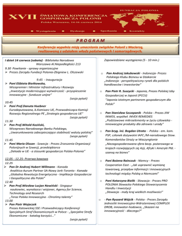Zapowiedziane wystąpienia (5 - 10 min.) I dzień 14 czerwca (sobota) - Biblioteka Narodowa Warszawa Al.Niepodległości 213 9.30 Powitanie - sprawy organizacyjne Prezes Zarządu Fundacji Polonia-Zbigniew L. Olszewski 9.45 - Inauguracja Pani Elżbieta Bieńkowska, Wicepremier i Minister Infrastruktury i Rozwoju „Inwestycje modernizujące wytwórczość - przyspieszenie innowacyjne - fundusze unijne” (sesja pytań) 10.45 Pani Prof.Danuta Huebner Eurodeputowana, b.Komisarz UE, Przewodnicząca Komisji Rozwoju Regionalnego PE „Strategia gospodarcza UE” (sesja pytań) 11.30 Pan Prof.Witold Koziński, Wiceprezes Narodowego Banku Polskiego, „Uwarunkowania zabezpieczające stabilność waluty polskiej” (sesja pytań) 11.45 Pani Maria Olsson - Szwecja - Prezes Zrzeszenia Organizacji Polonijnych w Szwecji, przedsiębiorca „Dekada w UE - a stosunki gospodarcze Polska-Polonia” 12.05 - 12.25- Przerwa kawowa 12.25 Pan Dr Andrzej Hubert Willmann - Kanada Analitica-Aurum Partner SA-Nowy Jork-Toronto - Kanada „Globalna Rewolucja Energetyczna - Implikacje Gospodarcze i Geopolityczne dla Polski” 12.40 Pan Prof.Wiesław Lucjan Nowiński - Singapur naukowiec, wynalazca i wizjoner, Agency for Science, Technology and Research „Teraz Polska Innowacyjna - Chrońmy talenty” 13.00 Pan Piotr Wojaczek Prezes Katowickiej SSE i Przewodniczący Konferencji Specjalnych Stref Ekonomicznych w Polsce - „Specjalne Strefy Ekonomiczne - katalog korzyści…” (sesja pytań) . o Pan Andrzej Jakubowski - Indonezja- Prezes Polskiego Klubu Biznesu w Dżakarcie „Indonezja - perspektywiczny rynek dla polskich handlowców i inwestorów” o Pan Piotr R. Suszycki - Japonia, Prezes Polskiej Izby Gospodarczej w Japonii (PCCIJ) ”Japonia istotnym partnerem gospodarczym dla Polski” o Pan Stanisław Szczepanik - Polska - Prezes JIW INWEX, współwł. INVEX REMEDIES „Podstawowe mikroelementy w życiu człowieka innowacyjne produkty dla zdrowia i urody” o Pan bryg. inż. Bogdan Utrata - -Polska - em. kom. PSP, członek dożywotni IAFC /M-narodowego Stow. Komendantów Straży w Waszyngtonie „Niezagospodarowana sfera bezp. pożarowego w krajach rozwijających się Azji, Afryki i Ameryki Płd. szansą na biznes” o Pani Bożena Rainczuk - Niemcy - Prezes Cooperation East - „Jak usprawnić wymianę towarową, przepływ informacji i innowacyjnych technologii między Polską a Niemcami” o Pani Katarzyna Bielik - Słowacja - Prezes PRO POLONIA Słowacko Polskiego Stowarzyszenia Handlu i Inwestycji „Słowacja - mały kraj wielkich możliwości” o - Pan Ryszard Wójcik - Polska - Prezes Zarządu Jednostki Innowacyjno-Wdrożeniowej COMPLEX DROB, innowator-hodowca, „Skazani na innowacyjność - dlaczego?” 13.45 -13.55 Pan Wojciech Kuliński - Polska - Prezes Zarządu IGORIA Trade S.A. „Instrumenty wspomagania eksportu - w sferze płatności” o 14.00-14.45 - Lunch o 14.45-17.45 Wystąpienia zapowiedziane - dyskusja 17.45 - Komunikaty organizacyjne 17.45-18.45 Koncert Orkiestry Reprezentacyjnej Wojska Polskiego 19.00- Spotkanie Integracyjne - przy biesiadnym stole” II dzień - 15 czerwca (niedziela) - Biblioteka Narodowa Warszawa Al.Niepodległości 213 9.30 - 10.45-Wystąpienia uczestników - dyskusje Pan Prof.dr hab.Franciszek Świderski -Polska, ekspert, Katedra Żywności Funkcjonalnej i Towaroznawstwa SGGW „Nowoczesne kierunki produkcji żywności - żywność prozdrowotna” Pani Anita Wojtkowska -Zjednoczone Emiraty Arabskie - przedsiębiorca, „Jak rozpoznać rynek i dostosować działania do jego specyfiki odmienności.” Pan Valery Tsilind - Białoruś - Dyr.Zarz. Grupy ERICPOL, Prezes Fundacji Rozwoju Regionalnego w Brześciu „Rozwój biznesu na Białorusi - organizacje pozarządowe i polonijne” o Pani Desisława Żeliazkowa-Skoczylas - Bułgaria „Rynek otwarty dla inwestorów zagranicznych o Pan Rafał Pietrucień, Dyrektor Dep.Planowania Regionalnego Urzędu Marszałkowskiego Województwa Kujawsko-Pomorskiego„Samorząd Regionu Kujawsko-Pomorskiego oferta permanentnej współpracy” o Przedstawiciel władz Torunia „Miasto sukcesu, otwarte na współpracę” o Pan Leszek Ładowski - USA, President Federation of Polish Chambers & Business Councils, Inc. „Dywersyfikacja Polskiej Economii: Miami, Wrota do obu Ameryk” 11.00 - wyjazd z Warszawy do Lublina Prosimy o zwięzłość wystąpień, co ułatwia komunikację 15 czerwca 2014 r 11.00 - Wyjazd z Warszawy do Lublina 13:00 – 15:00 – wizyta studyjna w jednej z lubelskich firm 15:00 – 16:00 – lunch 18:00 – przyjazd do hotelu w Lublinie, zakwaterowanie 19:00 – 20:00 – panel dyskusyjny poświęcony potencjałowi turystycznemu i gospodarczemu Regionu i Lublina 16 czerwca 2014 r. 11:00 – 12:30 - „Lubelski Kongres Gospodarczy Polonii” - spotkanie z władzami Województwa, kierunki rozwoju i propozycje współpracy 12:30 – 13:30 – lunch biznesowy i networking 13:30 – 16:00 – spotkania B2B z lubelskimi firmami 16:00 – powrót do hotelu 19:00 – wieczorne spotkanie networkingowe połączone z kolacją biznesową 17 czerwca 2014 r. 9:00 – 10:00 – spotkanie podsumowujące „Lubelski Kongres Gospodarczy Polonii” - wizytę gości z zagranicy i z kraju w Regionie Lubelskim w ramach współorganizacji „XVII Światowej Konferencji Gospodarczej Polonii” 10.00- wyjazd autokarami do Warszawy