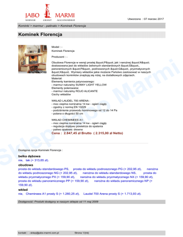 Utworzono : 07 marzec 2017 Kominki > marmur - patinato > Kominek Florencja Kominek Florencja Model : Kominek Florencja Producent : Obudowa Florencja w wersji prostej "P" jak i narożnej "N" dostosowana jest do wkładów żeliwnych standardowych "S", panoramicznych "P", podnoszonych "G", pryzmatycznych "X". Wymiary wkładów jakie możecie Państwo zastosować w naszych obudowach kominków znajdują się niżej, na dodatkowych zdjęciach. Materiał: Elementy kamienia patynowanego: - marmur naturalny SUNNY LIGHT YELLOW Elementy polerowane: - marmur naturalny ROJO ALICANTE Cechy wkładów M o WKŁAD LAUDEL 700 ARENA : - moc cieplna nominalna 14 kw - ogień ciągły - zgodny z normą EN 13229 - podciśnienie przewodu kominowego od 12 do 14 Pa - polana o długości 50 cm b a J r a i m WKŁAD CHEMINEES A1: - moc cieplna nominalna 14 kw - ogień ciągły - regulacja dopływu powietrza do spalania - paliwo opałowe: drewno p e l k S Cena : 2.847,45 zł Brutto ( 2.315,00 zł Netto) Dostępne opcje Kominek Florencja : belka dębowa nie, tak (+ 313,65 zł). obudowa prosta do wkładu standardowego PS, prosta do wkładu podnoszonego PG (+ 202,95 zł), narożna do wkładu podnoszonego NG (+ 202,95 zł), narożna do wkładu standardowego NS, prosta do wkładu pryzmatycznego PX (+ 159,90 zł), narożna do wkładu pryzmatycznego NX (+ 159,90 zł), prosta do wkładu panoramicznego PP (+ 159,90 zł), narożna do wkładu panoramicznego NP (+ 159,90 zł). wkład nie, Cheminees A1 prosty S (+ 1.260,25 zł), Laudel 700 Arena prosty S (+ 1.713,93 zł). Dostępność: Produkt dostępny w naszym sklepie od 11 maj 2009 kontakt : - [email protected] Strona 1/{nb}