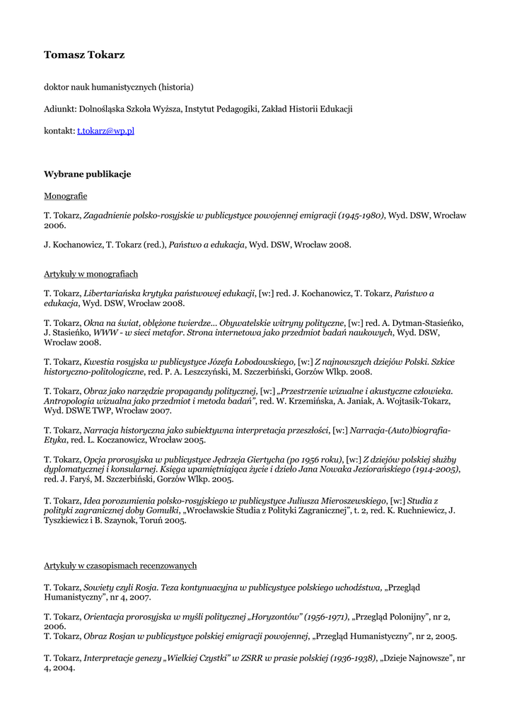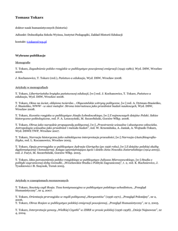 Tomasz Tokarz doktor nauk humanistycznych (historia) Adiunkt: Dolnośląska Szkoła Wyższa, Instytut Pedagogiki, Zakład Historii Edukacji kontakt: [email protected] Wybrane publikacje Monografie T. Tokarz, Zagadnienie polsko-rosyjskie w publicystyce powojennej emigracji (1945-1980), Wyd. DSW, Wrocław 2006. J. Kochanowicz, T. Tokarz (red.), Państwo a edukacja, Wyd. DSW, Wrocław 2008. Artykuły w monografiach T. Tokarz, Libertariańska krytyka państwowej edukacji, [w:] red. J. Kochanowicz, T. Tokarz, Państwo a edukacja, Wyd. DSW, Wrocław 2008. T. Tokarz, Okna na świat, oblężone twierdze... Obywatelskie witryny polityczne, [w:] red. A. Dytman-Stasieńko, J. Stasieńko, WWW - w sieci metafor. Strona internetowa jako przedmiot badań naukowych, Wyd. DSW, Wrocław 2008. T. Tokarz, Kwestia rosyjska w publicystyce Józefa Łobodowskiego, [w:] Z najnowszych dziejów Polski. Szkice historyczno-politologiczne, red. P. A. Leszczyński, M. Szczerbiński, Gorzów Wlkp. 2008. T. Tokarz, Obraz jako narzędzie propagandy politycznej, [w:] „Przestrzenie wizualne i akustyczne człowieka. Antropologia wizualna jako przedmiot i metoda badań”, red. W. Krzemińska, A. Janiak, A. Wojtasik-Tokarz, Wyd. DSWE TWP, Wrocław 2007. T. Tokarz, Narracja historyczna jako subiektywna interpretacja przeszłości, [w:] Narracja-(Auto)biografiaEtyka, red. L. Koczanowicz, Wrocław 2005. T. Tokarz, Opcja prorosyjska w publicystyce Jędrzeja Giertycha (po 1956 roku), [w:] Z dziejów polskiej służby dyplomatycznej i konsularnej. Księga upamiętniająca życie i dzieło Jana Nowaka Jeziorańskiego (1914-2005), red. J. Faryś, M. Szczerbiński, Gorzów Wlkp. 2005. T. Tokarz, Idea porozumienia polsko-rosyjskiego w publicystyce Juliusza Mieroszewskiego, [w:] Studia z polityki zagranicznej doby Gomułki, „Wrocławskie Studia z Polityki Zagranicznej”, t. 2, red. K. Ruchniewicz, J. Tyszkiewicz i B. Szaynok, Toruń 2005. Artykuły w czasopismach recenzowanych T. Tokarz, Sowiety czyli Rosja. Teza kontynuacyjna w publicystyce polskiego uchodźstwa, „Przegląd Humanistyczny”, nr 4, 2007. T. Tokarz, Orientacja prorosyjska w myśli politycznej „Horyzontów” (1956-1971), „Przegląd Polonijny”, nr 2, 2006. T. Tokarz, Obraz Rosjan w publicystyce polskiej emigracji powojennej, „Przegląd Humanistyczny”, nr 2, 2005. T. Tokarz, Interpretacje genezy „Wielkiej Czystki” w ZSRR w prasie polskiej (1936-1938), „Dzieje Najnowsze”, nr 4, 2004. Inne artykuły (wybór) T. Tokarz, Czerwone niebezpieczeństwo. „Myśl Narodowa” wobec Związku Sowieckiego i komunizmu, „Glaukopis", nr 11-12, 2008. T. Tokarz, Architekt terroru. Józef Stalin w oczach prasy polskiej w okresie Wielkiej Czystki (1936-1939), „Glaukopis", nr 7-8, 2007. T. Tokarz, Wychowawcza rola edukacji historycznej, „Wiadomości Historyczne” nr 1, 2005. T. Tokarz, Problem subiektywizmu w konstruowaniu narracji historycznej, „Kultura i Historia”, nr 8, 2005. T. Tokarz, Liberalizm a wychowanie, „Edukacja i Dialog”, nr 2, 2005. T. Tokarz, Pochwała edukacji obywatelskiej, „Edukacja i Dialog” nr 10, 2004. T. Tokarz, Historia jako nauka o wartościach, „Edukacja i Dialog” nr 5, 2004. T. Tokarz, Wolność: sprzymierzeniec czy hamulec rozwoju? [w:] www.mises.org.pl 2004. Zajęcia dydaktyczne: Historia wychowania Historia stosunków międzynarodowych Historia Polski XX wieku Polski system polityczny na tle historii najnowszej