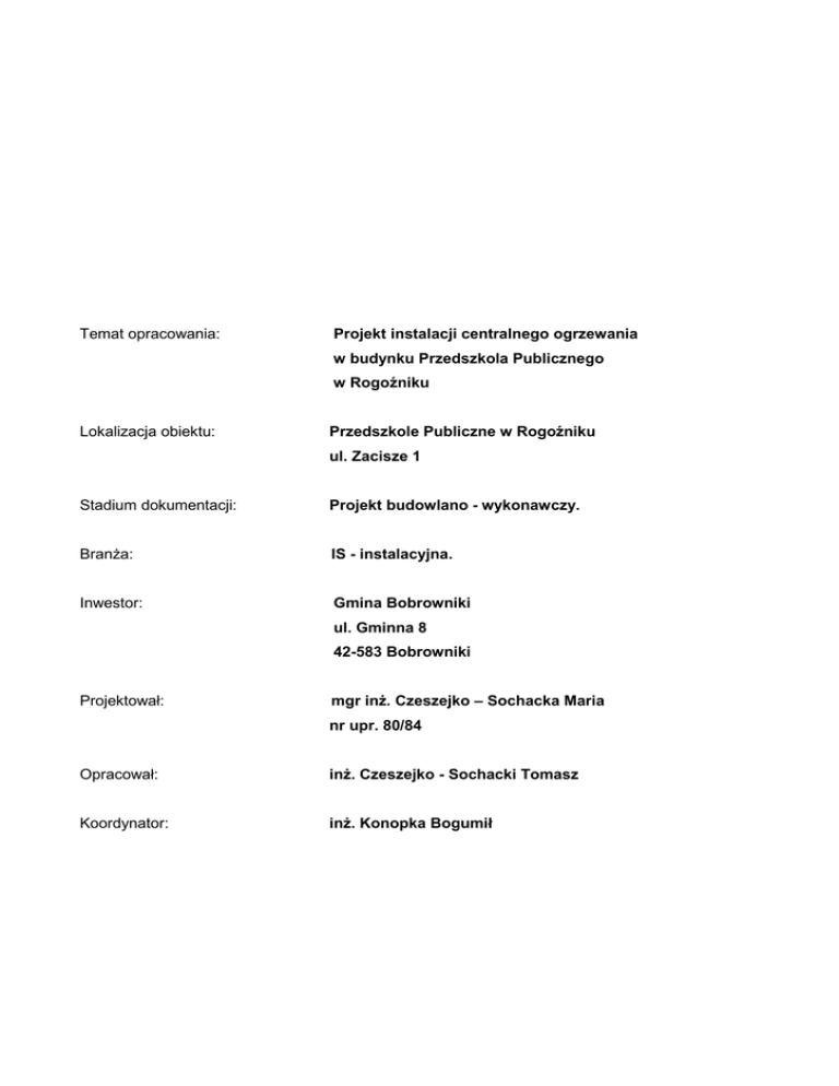 Temat opracowania: Projekt instalacji centralnego ogrzewania w budynku Przedszkola Publicznego w Rogoźniku Lokalizacja obiektu: Przedszkole Publiczne w Rogoźniku ul. Zacisze 1 Stadium dokumentacji: Projekt budowlano - wykonawczy. Branża: IS - instalacyjna. Inwestor: Gmina Bobrowniki ul. Gminna 8 42-583 Bobrowniki Projektował: mgr inż. Czeszejko – Sochacka Maria nr upr. 80/84 Opracował: inż. Czeszejko - Sochacki Tomasz Koordynator: inż. Konopka Bogumił Siemianowice Śląskie ……… 2011 OŚWIADCZENIE Na podstawie art. 20 ust. 4 ustawy z dnia 7 lipca 1994 – Prawo budowlane (tekst jednolity, Dz. U. z 2003r. Nr 207, poz. 2016 z późniejszymi zmianami) OŚWIADCZAM, że projekt instalacji centralnego ogrzewania w budynku Przedszkola Publicznego w Rogoźniku zlokalizowanego przy ul. Zacisze 1 jest kompletny i został wykonany zgodnie z obowiązującymi przepisami oraz zasadami wiedzy technicznej. Projektant: …………………………. (podpis i pieczęć) SPIS TREŚCI: 1. DANE OGÓLNE ..................................................................................................................... 2. 1.1. Przedmiot i zakres opracowania....................................................................................... 1.2. Podstawa opracowania .................................................................................................... 1.3. Opis budynku ................................................................................................................... ZAPOTRZEBOWANIE CIEPŁA BUDYNKU ......................................................................... 3. OPIS PROJEKTOWANEJ INSTALACJI C.O. ....................................................................... 3.1. Opis rozwiązania projektowego ........................................................................................ 3.2. Materiał na rurociągi i mocowanie przewodów……………………………………………….. 3.3. Regulacja hydrauliczna instalacji c.o. ............................................................................... 3.4. Izolacja termiczna ............................................................................................................ 4. ZAKRES PRAC I ZALECENIA REALIZACYJNE .................................................................. 5. ZESTAWIENIE POZOSTAŁYCH MATERIAŁÓW .................................................................. SPIS RYSUNKÓW: Rys. 01 Rzut Piwnic Rys. 02 Rzut Parteru Rys. 03 Rozwinięcie instalacji c.o. cz.1 Rys. 04 Rozwinięcie instalacji c.o. cz.2 1. DANE OGÓLNE 1.1. Przedmiot i zakres opracowania Przedmiotem opracowania jest dokumentacja wykonawcza instalacji centralnego ogrzewania w budynku Przedszkola Publicznego w Rogoźniku zlokalizowanego przy ul. Zacisze 1. Zakres opracowania obejmuje: obliczenia zapotrzebowania ciepła budynku, rozprowadzenie i dobór średnic przewodów instalacji c.o, dobór armatury, regulacja nastawcza instalacji c.o., 1.2. Podstawa opracowania Podstawę opracowania stanowiły: 1. 2 3 4 5 Zlecenie i umowa z Inwestorem Obowiązujące normy i przepisy Wizja lokalna i inwentaryzacja dostarczona przez Inwestora Obliczenie zapotrzebowania ciepła (Audyt) Inwentaryzacja wykonawcza 1.3. Opis budynku Budynek jest obiektem jednokondygnacyjnym z poddaszem, częściowo podpiwniczony. 2. ZAPOTRZEBOWANIE CIEPŁA BUDYNKU Zapotrzebowanie ciepła dla c.o. dla budynku ocieplonego wynosi 22,24 kW. Powierzchnie ogrzewalne zaprojektowanych grzejników pokrywają potrzeby cieplne przy założeniu temperatur w instalacji 70/55°C. 3. OPIS PROJEKTOWANEJ INSTALACJI C.O. 3.1. Opis rozwiązania projektowego Zaprojektowano instalację z rur stalowych, łączonych przez spawanie. Instalacja jest instalacją pompową, dwururową systemu zamkniętego. Do potrzeb cieplnych pomieszczeń dobrano grzejniki PURMO typ C z podłączeniem dolnym. Grzejniki łączyć z instalacją poprzez zawór zintegrowany dolny np. multiflex. Przewody rozprowadzające należy wykonać jako nowe w wykonaniu z izolacją cieplną o grubości 13mm w pomieszczeniu kotłowni. . Układ odpowietrzania projektuje się jako miejscowy – odpowietrznik automatyczny na każdym pionie. W czasie napełniania zładu w celu jego szybszego odpowietrzenia należy każdy grzejnik odpowietrzyć ręcznie. 3.2. Materiały na rurociągi i mocowanie przewodów Rury stalowe prowadzić w na ścianach mocować za pomocą uchwytów z gumą. 2 3.3. Regulacja hydrauliczna instalacji c.o. Regulację hydrauliczną instalacji c.o. zaprojektowano poprzez wykonanie nastaw na termostatycznych zaworach grzejnikowych . Nastawy podano na rozwinięciach instalacji c.o. Obliczenia hydrauliczne wykonano programem AudytorPro C.O./ Opór hydrauliczny instalacji wynosi ∆p= 12,81 kPa Pojemność wodna instalacji wynosi V= 196 dm3 Całkowity strumień wody w instalacji G= 0,297 kg/s 3.4. Izolacja termiczna Izolację termiczną wykonać dla rur stalowych dn32 i dn25 prowadzonych w piwnicy .Grubość izolacji zewnętrznej przewodów wynosi 13 mm. 4. ZAKRES PRAC I ZALECENIA REALIZACYJNE Zakres prac modernizacyjnych: - roboty demontażowe - montaż instalacji centralnego ogrzewania - próba szczelności instalacji - wykonanie izolacji termicznej - przeprowadzenie regulacji instalacji c.o.; - montaż głowic termostatycznych Zalecenia realizacyjne: - Instalację c.o. należy poddać próbie szczelności przy ciśnieniu 0,6 MPa; - całość robót należy wykonać zgodnie z "Warunkami technicznymi wykonania i odbioru robót budowlano - montażowych cz. II. Roboty instalacji sanitarnych i przemysłowych. 3 5. ZESTAWIENIE PODSTAWOWYCH MATERIAŁÓW Rura stalowe Dn 15 Dn 20 Dn 25 Dn 32 104 mb 68 mb 46 mb 5 mb Zawory termostatyczne dn15 Głowica termostatyczna Zawory samoodpowitrzające dn15 Zawory kulowe dn15 Zawory kulowe dn25 Zawory odcinające grzejnikowe dn15 Grzejnik PURMO CV11/600/900 Grzejnik PURMO CV11/600/1400 Grzejnik PURMO CV11/600/1800 Grzejnik PURMO CV22/600/700 