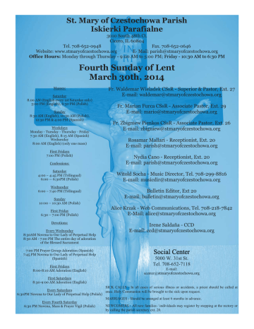 St. Mary of Czestochowa Parish Iskierki Parafialne 3010 South 48th Ct. Cicero, IL 60804 Tel. 708-652-0948 Fax. 708-652-0646 Website: www.stmaryofczestochowa.org E- Mail: [email protected] Office Hours: Monday through Thursday - 9:00 AM to 5:00 PM; Friday - 10:30 AM to 6:30 PM Fourth Sunday of Lent March 30th, 2014 Masses: Saturday 8.00 AM (English every 1st Saturday only) 5:00 PM (English), 6:30 PM (Polish) Sunday 8:30 AM (English), 10:30 AM (Polish), 12:30 PM & 4:00 PM (Spanish) Weekdays Monday - Tuesday - Thursday - Friday 7:30 AM (English), 8:15 AM (Spanish) Wednesday 8:00 AM (English) (only one mass) First Fridays 7:00 PM (Polish) Fr. Waldemar Wieladek CSsR - Superior & Pastor, Ext. 27 E-mail: [email protected] Fr. Marian Furca CSsR - Associate Pastor, Ext. 29 E-mail: [email protected] Fr. Zbigniew Pienkos CSsR - Associate Pastor, Ext. 26 E-mail: [email protected] Rosamar Mallari - Receptionist, Ext. 20 E-mail: [email protected] Confessions: Nydia Cano - Receptionist, Ext. 20 E-mail: [email protected] Saturday 4:00 – 4:45 PM (Trilingual) 6:00 — 6:30PM (Polish) Witold Socha - Music Director, Tel. 708-299-8816 E-mail: [email protected] Wednesday 6:00 – 7:40 PM (Trilingual) Sunday 10:00 – 10:30 AM (Polish) First Friday 6:30 – 7:00 PM (Polish) Devotions: Every Wednesday 8:30AM Novena to Our Lady of Perpetual Help 8:30 AM - 7:00 PM The entire day of adoration of the Blessed Sacrament 7:00 PM Prayer Group-Adoration (Spanish) 7:45 PM Novena to Our Lady of Perpetual Help (Spanish) First Fridays 8:00-8:10 AM Adoration (English) Bulletin Editor, Ext 20 E-mail: [email protected] Alice Krzak - Web Communications, Tel. 708-218-7842 E-Mail: [email protected] Irene Saldaña - CCD E-mail: [email protected] Social Center 5000 W. 31st St. Tel. 708-652-7118 E-mail: [email protected] First Saturdays 8:30-9:00 AM Adoration (English) SICK CALLS - In all cases of serious illness or accidents, a priest should be called at Every Saturdays once. Holy Communion will be brought to the sick upon request. 6:30PM Novena to Our Lady of Perpetual Help (Polish) MARRIAGES - Should be arranged at least 6 months in advance. Every Fourth Saturday NEWCOMERS - All new families / individuals may register by stopping at the rectory or 6:30 PM Novena, Mass & Prayer Vigil (Polish) by calling the parish secretary ext. 20. Sunday Iskierki Parafialne 7:30 7:50 8:15 7PM March 30, Fourth Sunday of Lent 8:30 †Mike and Anne Vavrek (family) 10:30 O Boże bł. i potrzebne łaski dla Witolda Sochy z okazji urodzin (Ojcowie Redemptoryści) O zdrowie i potrzebne łaski dla Józefy Roszkiewicz (rodzina) O zdrowie i Boże bł. dla Wojciecha Bobak z okazji urodzin Dziękczynna z prośba o dalsze łaski dla wnuczki Allie Vijit (dziadziuś) O zdrowie i Boże bł. dla Agnieszki Perhon w 40-tą rocz. urodzin (tata) O Boże bł. i opiekę Matki Bożej Częstochowskiej w dniu urodzin dla Krzysztofa (dzieci Kamil i Asia) O Boże bł. i zdrowie dla Urbańskiej †Marianna Rebizant (zięć z wnukami i prawnukami) †Leonarda Micun w 14-tą rocz. śm. (rodzina) †Mieczysław Micun w 2-ą rocz. śm. (rodzina) †Wiesław Ligas w 5-tą rocz. śm. 11:30 Gorzkie Żale 12:30 Por la salud de Juana Ríos †Teresa Serrano, 2º aniversario (hijos) †Guadlupe Ríos (familia) 4:00 Por la salud y bendiciones de Fernanda Ramirez (su mamá) March 31, Monday, Lenten Weekday 7:30 †Rafał Chojnacki 8:15 Por la salud de Juana Rios April 1, Tuesday, Lenten Weekday 7:30 †Rafał Chojnacki 8:15 Por la salud de Juana Rios April 2, Wednesday, Lenten Weekday; St. Francis of Paola, Hermit 8:00 †Mike & Anne Vavrek (Family) 8:30 Eucharistic Adoration until 7 P.M. 7PM Via Crusis 7:45 Novena April 3, Thursday, Lenten Weekday 7:30 †Frank Budzik (family) 8:15 Por la salud de Juana Ríos April 4, First Friday , Lenten Weekday; St. Isidore, Bishop and Doctor of the Church; Day of Abstinence †Rafał Chojnaki Way of the Cross—English Por la salud de Juana Ríos Droga Krzyżowa i Msza św. April 5, First Saturday, Lenten Weekday; St. Vincent Ferrer, Priest 8AM First Saturday 5:00 †Peter J. Steinke (Stolarski Family) 6:30 W intencjach próśb i podziękowań do M. B. Nieustającej Pomocy April 6, Fifth Sunday of Lent 8:30 †Rita Barnak (Ronald Barnak) 10:30 O Boże bł. i zdrowie dla Urbańskiej †Zofia Karpiel w 13-tą rocz. śm. (córka z rodziną) †Andrzej Karpiel w 25-tą rocz. śm. (córka z rodziną) †Jana Szafran w 36-ta rocz. śm. i o wynagrodzenie i przebłaganie za wszystkie przewinienia i grzechy ciężkie przodków z rodzin Żądło i Szafran i o odrodzenie w duchu i prawdzie †Anna i Stanisław Drąg w rocz. śm. (synowa) 11:30 Gorzkie Żale 12:30 Presentacion de 3 años de Michelle Montoya Guzman (padrinos, Rosa Trejo y Felipe Trejo; papas Miguel Montoya y Maria Guzman) Por la salud de Juana Ríos 4:00 Por los feligreses Lector Schedule Saturday, April 5 5:00 Sharon Wente, John Stenson Sunday, April 6 8:30 Michele Cison-Carlson, Leonard Witucki 10:30 12:30 Beatriz Ibarra, Roberto Pasillas Linda Ramirez 4:00 Rene Aviña, Mary Rodriguez Enrique Garcia Eucharistic Minister Saturday, April 5 5:00 Jean Yunker, Frances Balla Sunday, April 6 8:30 Chrisitne Zaragoza, Ed Hennessy Maria Carmen Castañeda 10:30 Polish Eucharistic Minister 12:30 Marisol Ortiz, Olivia Ortiz Javier Hernandez, Juana Salas 4:00 Humberto Tellez, Maria Clara Ibarra, Martha Tamayo St. Mary of Czestochowa Sunday Collection, March 23, 2014 Our next CCD class will be held on April 5, 2014. Please arrive on time. Indoor and Outdoor Saturday and Sunday March 29 and 30 8:00 a.m. to 4:00 p.m. St. Mary of Czestochowa Social Center 5000 W. 30th St. Bargains!!! Food available!!!! Many thanks to those of you who have contributed to St. Mary of Czestochowa’s collection this past week. Your gifts are essential to our ministry, and we are grateful. Mar. 22 Mar. 23 5:00PM $508.00 6:30PM $303.00 8:30AM $1,094.40 10:30AM $2,010.00 12:30PM $1,406.00 4:00PM $874.00 TOTAL $6,195.40 Thoughts o