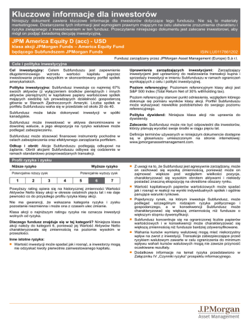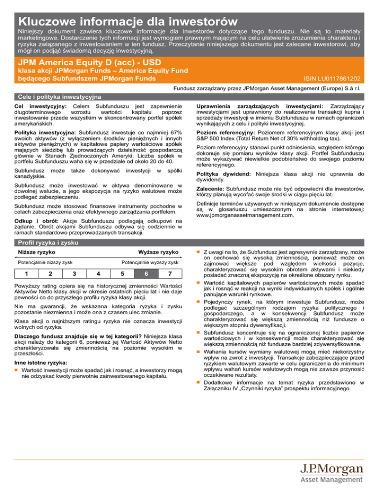 Kluczowe informacje dla inwestorów Niniejszy dokument zawiera kluczowe informacje dla inwestorów dotyczące tego funduszu. Nie są to materiały marketingowe. Dostarczenie tych informacji jest wymogiem prawnym mającym na celu ułatwienie zrozumienia charakteru i ryzyka związanego z inwestowaniem w ten fundusz. Przeczytanie niniejszego dokumentu jest zalecane inwestorowi, aby mógł on podjąć świadomą decyzję inwestycyjną. JPM America Equity D (acc) - USD klasa akcji JPMorgan Funds – America Equity Fund będącego Subfundszem JPMorgan Funds ISIN LU0117861202 Fundusz zarządzany przez JPMorgan Asset Management (Europe) S.à r.l. Cele i polityka inwestycyjna Cel inwestycyjny: Celem Subfunduszu jest zapewnienie długoterminowego wzrostu wartości kapitału poprzez inwestowanie przede wszystkim w skoncentrowany portfel spółek amerykańskich. Uprawnienia zarządzających inwestycjami: Zarządzający inwestycjami jest uprawniony do realizowania transakcji kupna i sprzedaży inwestycji w imieniu Subfunduszu w ramach ograniczeń wynikających z celu i polityki inwestycyjnej. Polityka inwestycyjna: Subfundusz inwestuje co najmniej 67% swoich aktywów (z wyłączeniem środków pieniężnych i innych aktywów pieniężnych) w kapitałowe papiery wartościowe spółek mających siedzibę lub prowadzących działalność gospodarczą głównie w Stanach Zjednoczonych Ameryki. Liczba spółek w portfelu Subfunduszu waha się w przedziale od około 20 do 40. Poziom referencyjny: Poziomem referencyjnym klasy akcji jest S&P 500 Index (Total Return Net of 30% withholding tax). Subfundusz może kanadyjskie. także dokonywać inwestycji w spółki Poziom referencyjny stanowi punkt odniesienia, względem którego dokonuje się pomiaru wyników klasy akcji. Portfel Subfunduszu może wykazywać niewielkie podobieństwo do swojego poziomu referencyjnego. Polityka dywidend: Niniejsza klasa akcji nie uprawnia do dywidendy. Subfundusz może inwestować w aktywa denominowane w dowolnej walucie, a jego ekspozycja na ryzyko walutowe może podlegać zabezpieczeniu. Zalecenie: Subfundusz może nie być odpowiedni dla inwestorów, którzy planują wycofać swoje środki w ciągu pięciu lat. Subfundusz może stosować finansowe instrumenty pochodne w celach zabezpieczenia oraz efektywnego zarządzania portfelem. Definicje terminów używanych w niniejszym dokumencie dostępne są w glosariuszu umieszczonym na stronie internetowej: www.jpmorganassetmanagement.com. Odkup i obrót: Akcje Subfunduszu podlegają odkupowi na żądanie. Obrót akcjami Subfunduszu odbywa się codziennie w ramach standardowo przeprowadzanych transakcji. Profil ryzyka i zysku Niższe ryzyko Wyższe ryzyko Potencjalnie niższy zysk 1 2 Q Potencjalnie wyższy zysk 3 4 5 6 7 Powyższy rating opiera się na historycznej zmienności Wartości Aktywów Netto klasy akcji w okresie ostatnich pięciu lat i nie daje pewności co do przyszłego profilu ryzyka klasy akcji. Q Q Nie ma gwarancji, że wskazana kategoria ryzyka i zysku pozostanie niezmienna i może ona z czasem ulec zmianie. Klasa akcji o najniższym ratingu ryzyka nie oznacza inwestycji wolnych od ryzyka. Dlaczego fundusz znajduje się w tej kategorii? Niniejsza klasa akcji należy do kategorii 6, ponieważ jej Wartość Aktywów Netto charakteryzowała się zmiennością na poziomie wysokim w przeszłości. Q Q Inne istotne ryzyka: Q Wartość inwestycji może spadać jak i rosnąć, a inwestorzy mogą nie odzyskać kwoty pierwotnie zainwestowanego kapitału. Q Z uwagi na to, że Subfundusz jest agresywnie zarządzany, może on cechować się wysoką zmiennością, ponieważ może on zajmować większe pod względem wielkości pozycje, charakteryzować się wysokim obrotem aktywami i niekiedy posiadać znaczną ekspozycję na określone obszary rynku. Wartość kapitałowych papierów wartościowych może spadać jak i rosnąć w reakcji na wyniki indywidualnych spółek i ogólnie panujące warunki rynkowe. Pojedynczy rynek, na którym inwestuje Subfundusz, może podlegać szczególnym rodzajom ryzyka politycznego i gospodarczego, a w konsekwencji Subfundusz może charakteryzować się większą zmiennością niż fundusze o większym stopniu dywersyfikacji. Subfundusz koncentruje się na ograniczonej liczbie papierów wartościowych i w konsekwencji może charakteryzować się większą zmiennością niż fundusze bardziej zdywersyfikowane. Wahania kursów wymiany walutowej mogą mieć niekorzystny wpływ na zwrot z inwestycji. Transakcje zabezpieczające przed ryzykiem walutowym zawarte w celu ograniczenia do minimum wpływu wahań kursów walutowych mogą nie zawsze przynosić oczekiwane rezultaty. Dodatkowe informacje na temat ryzyka przedstawiono w Załączniku IV „Czynniki ryzyka” prospektu informacyjnego. Opłaty Opłaty jednorazowe pobierane przed lub po dokonaniu inwestycji Opłata za subskrypcję 5,00% Opłata za umorzenie 0,50% Q Q Jest to maksymalna kwota, jaka może zostać pobrana z Państwa środków przed ich zainwestowaniem lub przed wypłaceniem zysków z inwestycji. Opłaty pobierane z funduszu w ciągu roku Opłaty bieżące Q 2,55% Opłaty pobierane z funduszu w określonych warunkach szczególnych Opłata zależna od wyników Q Brak Opłaty za subskrypcję i umorzenie to opłaty maksymalne, a rzeczywiście pobierane opłaty mogą być niższe. Informacje na temat opłat są dostępne u doradcy finansowego inwestora, dystrybutora lub w suplemencie do prospektu informacyjnego dla danego kraju. Q Inwestorzy mogą podlegać obciążeniu opłatą za zamianę w maksymalnej wysokości 1% Wartości Aktywów Netto akcji nowej klasy akcji. Kwota opłaty bieżącej podlega oszacowaniu na podstawie spodziewanej łącznej wysokości opłat. Kwota ta jest ograniczona limitem i podlega zapłacie w maksymalnej wysokości. Roczne sprawozdanie UCITS za każdy rok obrotowy będzie zawierało szczegółowe informacje dotyczące faktycznej wysokości pobranych opłat. Opła