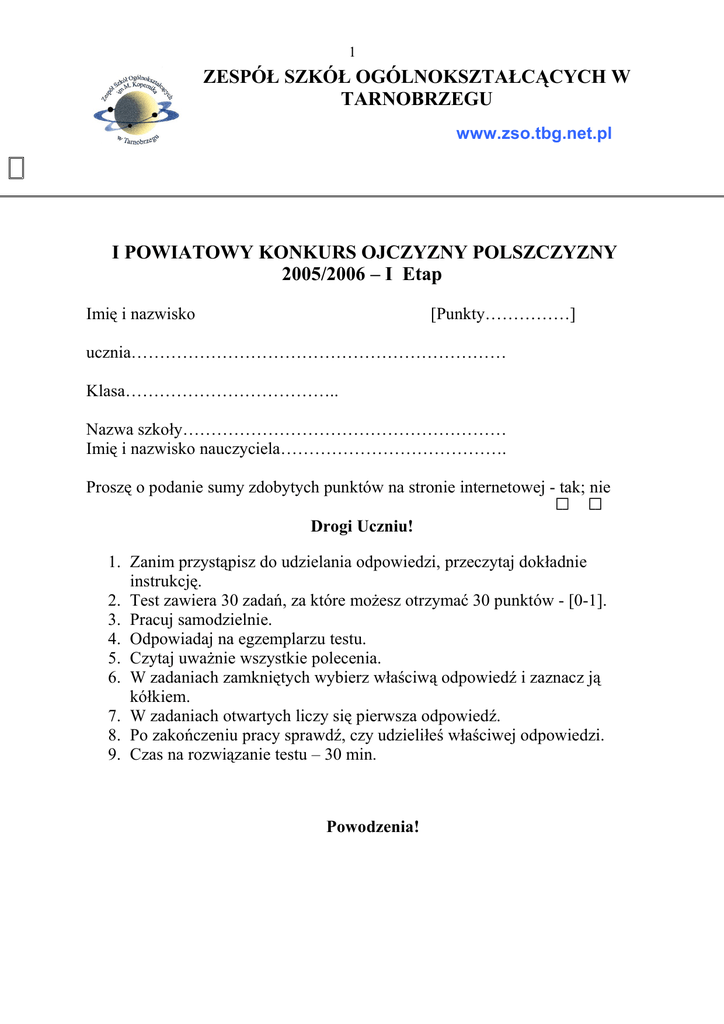 1 ZESPÓŁ SZKÓŁ OGÓLNOKSZTAŁCĄCYCH W TARNOBRZEGU www.zso.tbg.net.pl I POWIATOWY KONKURS OJCZYZNY POLSZCZYZNY 2005/2006 – I Etap Imię i nazwisko [Punkty……………] ucznia………………………………………………………… Klasa……………………………….. Nazwa szkoły………………………………………………… Imię i nazwisko nauczyciela…………………………………. Proszę o podanie sumy zdobytych punktów na stronie internetowej - tak; nie Drogi Uczniu! 1. Zanim przystąpisz do udzielania odpowiedzi, przeczytaj dokładnie instrukcję. 2. Test zawiera 30 zadań, za które możesz otrzymać 30 punktów - [0-1]. 3. Pracuj samodzielnie. 4. Odpowiadaj na egzemplarzu testu. 5. Czytaj uważnie wszystkie polecenia. 6. W zadaniach zamkniętych wybierz właściwą odpowiedź i zaznacz ją kółkiem. 7. W zadaniach otwartych liczy się pierwsza odpowiedź. 8. Po zakończeniu pracy sprawdź, czy udzieliłeś właściwej odpowiedzi. 9. Czas na rozwiązanie testu – 30 min. Powodzenia! 2 1. a) b) c) Wskaż właściwą odpowiedź. Nie ściął jeszcze trzech: chryzantem, chryzantemów, chryzantemy. 2. a) b) c) Wskaż właściwa odpowiedź. Bukiet jesiennych: astrów, aster, obie formy są poprawne. 3. a) b) c) Podaj znaczenie frazeologizmów: kwiat paproci - ……………………………………………………………………….. puścić płazem - ………………………………………………………………………. szukać ze świecą - …………………………………………………………………… 4. a) b) c) Wskaż odpowiedź niepoprawną. być z kimś za pan brat – dobrze kogoś znać, być z nim w zażyłych stosunkach, być na tapecie – być omawianym, stać się tematem rozmów, zadać komu pieprzu – postawić trudne zadanie, zmusić do wielkiego wysiłku. 5. a) b) c) Jak poprawnie wymówisz i napiszesz? tylko: pospieszny, tylko: pośpieszny. Obie formy są poprawne. 6. a) b) c) Wskaż poprawny wołacz: Droga Stefaniu! Droga Stefanio! Droga Stefania! 7. Wskaż błędną formę dopełniacza w zdaniach: a) Do hoteli tarnobrzeskich przybyło wielu gości. b) W jednym z hotelów nie było już miejsc. c) W jedynym z motelów koło Tarnobrzega kierowcy mogą odpocząć. 8. Podkreśl sylabę akcentowaną w wyrazach: a) na-u-ka, b) gra-ma-ty-ka, c) A-me-ry-ka. 9. Wybierz zdanie niepoprawne pod względem interpunkcyjnym: a) Gdzieśkolwiek jest, jeśliś jest lituj mej żałości. (J.Kochanowski) b) Ten będzie wezwany, kto zasłużył na nagrodę. c) Maria i Anna, aby zdążyć na pociąg, śpieszyły się. 10. Znaczenia wyrazu pretendować będziesz szukać w słowniku: a) etymologicznym, b) języka polskiego, c) poprawnej polszczyzny. 3 11. Wybierz poprawną formę wyrazu mecz: a) Dwóch ostatnich meczów; b) Dwóch ostatnich meczy; c) Obie formy są poprawne. 12. Które zdanie jest niepoprawne: a) Na dzień dzisiejszy nie mam pieniędzy. b) Dzisiaj nie mam pieniędzy. c) Nie mam dziś pieniędzy. 13. Które wyrażenie jest poprawne? a) szkoła imieniem Mikołaja Kopernika, b )szkoła imienia Mikołaja Kopernika, c) szkoła o imieniu Mikołaja Kopernika. 14. Która z form miejscownika jest poprawnie zapisana: a ) w organizmie, b) o cyniźmie, c) Obie formy pisowni są poprawne. 15. Zapisz nazwiska, które są wymawiane: a) [La Fąten[ …………………………………………………………… b) [Lewina]…………………………………………………………….. c) [Mopasą]……………………………………………………………… 16. Wskaż poprawną formę: a) Dziś dwudziesty szósty października. b) Jutro dwudziesty siódmy październik. c) Konkurs odbył się w dniu dwudziestego szóstego października. 17. Podaj nazwę mieszkańców: a) Niska - …………………………………………………………………… b) Tarnobrzega - ……………………………………………………………. c) Płocka - …………………………………………………………………. 18. Wyjaśnij znaczenie wyrazów: a) yappie [japi] -………………………………………………………………………… b) Yamaha - …………………………………………………………………………….. c) Yahoo - ………………………………………………………………………………. 19. Które zdanie odbiega znaczeniem od pozostałych? a) Poznałam przystojnego chłopaka. b) Zapoznałam przystojnego chłopaka. c) Zapoznałam się z przystojnym chłopakiem 20. Wskaż poprawną formę składniową. a) Pani logopeda zaleciła ćwiczenia usprawniające ruchy języka. b) Głównie młodzież jest miłośniczką muzyki country. d) Głowa państwa polskiego przybyła do Aten. 4 21. Które z nazwisk w dopełniaczu liczby pojedynczej zostało podane w poprawnej formie: a) Józefa Tischner, b) Grzegorza Turnaua, d) Marii Madej. 22. Poprawność językowa jest to: a) umiejętność ładnego wysłowienia się. b) stopień zgodności tekstu z normą językową. c) stopień zgodności tekstu z intuicją językową. 23. Wykroczenia przeciwko poprawności językowej mogą mieć różny charakter i przyczyny, wśród których najważniejsze są: a) niedbałość działań językowych, b) mała ilość czytanych książek, c) wpływ innego systemu językowego( np. języka potocznego, gwar). 24. Ze względu na rangę wszystkie błędy językowe można podzielić na: a) rażące, pospolite, rzadkie. b) rażące, pospolite, usterki językowe. c) usterki, innowacje, rażące. 25. Za autorytet tworzący normę: kryterium autorytetu kulturalnego - uważa się: a) inteligencję wielopokoleniową, zwłaszcza humanistyczną. b) pisarzy, polityków, dziennikarzy. c) nauczycieli. 26. „Literowe” odczytywanie wyrazów, np.[piętnaście] oraz [zaczęła] należy do błędów: a) słownikowych, b) fonetycznych, c) stylistyc