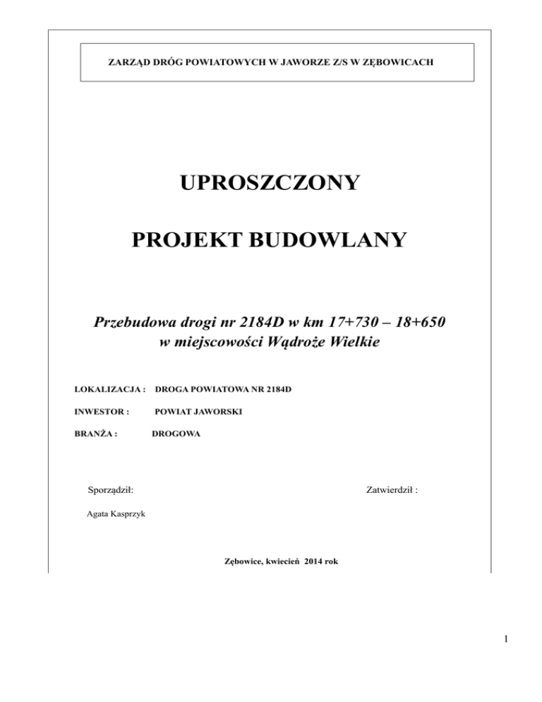 ZARZĄD DRÓG POWIATOWYCH W JAWORZE Z/S W ZĘBOWICACH UPROSZCZONY PROJEKT BUDOWLANY Przebudowa drogi nr 2184D w km 17+730 – 18+650 w miejscowości Wądroże Wielkie LOKALIZACJA : DROGA POWIATOWA NR 2184D INWESTOR : POWIAT JAWORSKI BRANŻA : DROGOWA Sporządził: Zatwierdził : Agata Kasprzyk Zębowice, kwiecień 2014 rok 1 O PI S T E C H N I C Z NY 1. Przedmiot opracowania Przedmiotem opracowania jest wykonanie uproszczonej dokumentacji projektowej na przebudowę drogi powiatowej nr 2184D relacji gr. powiatu ( Polanka ) – Wądroże Wielkie – Jawor od km 17+730 do km 18+650. 2. Podstawa opracowania - Rozporządzenie Ministra Transportu i Gospodarki Morskiej z dnia 02 marca 1999 r. w sprawie warunków technicznych, jakim powinny odpowiadać drogi publiczne i ich usytuowanie, Dz. U. Nr 43 z dnia 14 maja 1999 r., poz. 430, - Rozporządzenie Ministra Infrastruktury z dnia 03.07.2003 r. w sprawie szczegółowego zakresu i formy projektu budowlanego, Dz. U. z 2003 r. Nr 120. poz. 1133, - Ustawa z dnia 7 lipca 1994 r. Prawo Budowlane, tekst jednolity Dz. U. z 2000 r. Nr 106, poz. 1126 z późniejszymi zmianami. - Dziennik ustaw nr 19, poz. 115, ustawa z dnia 21 marca 1985 r. o drogach publicznych ( tekst jednolity). - Normy wytyczne i literatura branżowa Materiały źródłowe : - mapa zasadnicza - mapy ewidencji gruntów - pomiary i wizja w terenie 3. Istniejący stan zagospodarowania terenu Droga nr 2184D posiada nawierzchnię bitumiczną o szerokości 7,0 m. Nawierzchnia projektowanego do przebudowy odcinka drogi jest bardzo zniszczona w wyniku destrukcji masy asfaltowej . Ponadto wadliwie dobrany skład mieszanki, tj. nadmiar asfaltu w mieszance powoduje, że przez cały okres około trzydziestoletniej eksploatacji, w okresie letnim pod wpływem wysokiej 2 temperatury nawierzchnia nadmiernie koleinuje się. W koleinach tych przy każdych opadach atmosferycznych tworzą się rozległe zastoiska wodne, z których woda rozchlapywana jest na sąsiadujące ogrodzenia i ściany budynku. Ponadto powstałe w procesie koleinowania poprzeczne garby osiągnęły wysokość zagrażającą bezpieczeństwu ruchu drogowego. Stan ten wymaga konieczność usunięcia wadliwie wykonanej wierzchniej warstwy nawierzchni metodą sfrezowania i ułożeniem nowej nawierzchni odpowiadającej normom technicznym. Zjazdy na drogi gminne wykonane są z nawierzchni bitumicznej na istniejącej podbudowie. 4. Podstawowy zakres inwestycji Podstawowy zakres inwestycji obejmuje rozbiórkę istniejących krawężników oraz montaż nowych, sfrezowanie nawierzchni jezdni na całej długości i szerokości na grubości przeciętnie 5,0 cm wraz z ułożeniem nowych warstw bitumicznych , przebudowę i przełożenie istniejących brukowych nawierzchni chodników. Zakres projektu branży drogowej nie wykracza poza granice działek stanowiące pas drogowy. 5. Parametry techniczne Projektowany zakres robót posiada parametry techniczne zgodne z rozporządzeniem Ministra Transportu i Gospodarki Wodnej z dnia 2 marca 1999 r. w sprawie warunków technicznych, jakim powinny odpowiadac drogi publiczne i ich usytuowanie ( Dz. U. nr 43, poz. 430 ) : - kategoria ruchu KR 2 - klasa drogi L − szerokość nawierzchni jezdni 7,0 m − długość remontowanego odcinka jezdni 920 m − obciążenie nawierzchni 100 kN − prędkość projektowana Vp = 50 km/h − pochylenie poprzeczne jezdni 2,00% 3 6. Opis robót Przed przystąpieniem do robót związanych z planowanym zamierzeniem inwestycyjnym należy oznakować teren zgodnie z projektem organizacji ruchu tymczasowego na czas przebudowy przedmiotowej drogi. W pierwszej kolejności należy przystąpić do frezowania nawierzchni jezdni z uwzględnieniem odwozu destruktu na miejsce wskazane przez Zamawiającego. Następnie przystąpić do cięcia podłużnego nawierzchni na szerokości ok. 40 cm od linii krawężników, rozbiórki krawężników, rozbiórki nawierzchni chodników . Materiał rozbiórkowy zakwalifikowany do dalszego wykorzystania Wykonawca przekaże Inwestorowi i przewiezie na wskazane przez niego miejsce. Po wykonaniu prac rozbiórkowych należy przystąpić do układania krawężników betonowych 15x30 na ławie z oporem. Zaprojektowano światło krawężnika wynoszące 12,0 cm i obniżenie na wjazdach do światła 2,0 cm. Następnie przystąpić do regulacji studni w jezdni i chodnikach dostosowując ich wysokość do projektowanej niwelety nawierzchni jezdni i chodników. Nawierzchnie chodnika w km 0+566 – 0+629 i w km 0+630 – 0+657 należy rozebrać i ponownie ułożyć z uzupełnieniem podbudowy. Nawierzchnię chodnika w km 0+662 – 0+689 należy rozebrać i ułożyć z nowej kostki betonowej. Następnie należy wykonać naprawę nawierzchni jezdni nowymi warstwami : wiążącą na grubości . 4,0 cm oraz ścieralną na grubości 4,0 cm. Na zjazdach układać jedną warstwę ścieralna o grubości 4,0 cm. 5. Konstrukcje nawierzchni - warstwa ścieralna z betonu asfaltowego o uziarnieniu 0/12,8 mm na grubości - 4,0 cm - warstwa wiążąca z betonu asfaltowego o uziarnieniu 0,16 mm na grubości - 4,0 cm - skropienie emulsją asfaltowej o zużyciu - 0,51 kg/m2 - istniejąca konstrukcja drogi 5.1. Konstrukcja nawierzchni zjazdów na drogi gminne - warstwa ścieralna z betonu asfaltowego o uziarnieniu 0/12,8 mm na grubości - 4,0 cm 4 - skropienie emulsją asfaltowej o zużyciu - 0,51 kg/m2 - istniejąca konstrukcja zjazdów 6. Pochylenia poprzeczne Projektuje się spadek poprzeczny jednostronny 2% oraz daszkowy 2% na prostych odcinkach. 7. Profil podłużny Projektowane ukształtowanie wysokościowe profilu podłużnego stanowi odwzorowanie istniejących rzędnych nawierzchni jezdni. 8. Odwodnienie. Projektuje się odwodnienie poprzez zastosowanie nawierzchni o przekroju daszkowym oraz poprzez wykorzystanie istniejącego powierzchniowego systemu odwodnienia . 9. Kolizje z istniejącą infrastrukturą techniczną. Z uwagi na występowanie urządzeń podziemnych w proje