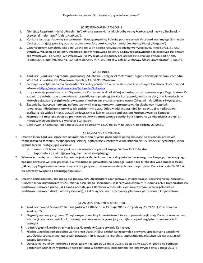 Regulamin konkursu „Słuchawki -‐ przyjaciel melomana” 1. 2. 3. 1. 2. 3. 4. 5. 6. 1. 2. 3. §1 POSTANOWIENIA OGÓLNE Niniejszy Regulamin (dalej „Regulamin”) określa warunki, na jakich odbywa się konkurs pod nazwą „Słuchawki -‐ przyjaciel melomana” (dalej „Konkurs”). Konkurs jest organizowany na terytorium Rzeczypospolitej Polskiej poprzez serwis Facebook na fanpage Santander Orchestra znajdującym się pod adresem: www.facebook.com/SantanderOrchestra/ (dalej „Fanpage”). Organizatorem Konkursu jest Bank Zachodni WBK Spółka Akcyjna z siedzibą we Wrocławiu, Rynek 9/11, 50-‐950 Wrocław, wpisana do Rejestru Przedsiębiorców Krajowego Rejestru Sadowego prowadzonego przez Sąd Rejonowy dla Wrocławia-‐Fabrycznej we Wrocławiu, VI Wydział Gospodarczy Krajowego Rejestru Sądowego pod nr KRS 0000008723, NIP 896005673, kapitał zakładowy 992 345 340 zł w całości wpłacony (dalej „Organizator", „Bank”). §2 DEFINICJE Konkurs – konkurs z nagrodami pod nazwą „Słuchawki -‐ przyjaciel melomana” organizowany przez Bank Zachodni WBK S.A. z siedzibą we Wrocławiu, Rynek 9/11, 50-‐950 Wrocław. Fanpage – dedykowana dla Santander Orchestry przestrzeń w serwisie społecznościowym Facebook dostępna pod adresem hjp://www.facebook.com/SantanderOrchestra. Jury -‐ komisja powołana przez Organizatora Konkursu, w skład której wchodzą osoby reprezentujące Organizatora. Do zadań Jury należy stałe czuwanie nad prawidłowym przebiegiem Konkursu, podejmowanie decyzji w kweslach, w których pojawią się wątpliwości związane z Konkursem oraz ostateczna ocena Zgłoszeń i klasyfikacja Zwycięzców. Zadanie konkursowe – polega na kreatywnym i niesztampowym zaprezentowaniu słuchawek i tego jak towarzyszą miłośnikom muzyki w ich codziennym życiu. Odpowiedzi muszą mieć formę wizualną -‐ zdjęciową, graficzną lub wideo i muszą zostać umieszczone w komentarzach pod postem konkursowym na Fanpage. Nagroda – 3 miesiące dostępu premium do serwisu muzycznego Spolfy. Pula nagród to 25 (dwadzieścia pięć) 3-‐ miesięcznych voucherów o wartości 60zł każdy. Czas trwania Konkursu -‐ od 6 maja 2016 r. od godziny 12.00 do 15 maja 2016 r. do godziny 23.59.59. §3 UCZESTNICY KONKURSU Uczestnikiem Konkursu może być pełnoletnia osoba fizyczna posiadająca pełną zdolność do czynności prawnych, zamieszkała na terenie Rzeczpospolitej Polskiej, będąca konsumentem w rozumieniu art. 22¹ kodeksu cywilnego, która spełnia łącznie następujące warunki: a. Zamieściła komentarz pod postem konkursowym na Fanpage Santander Orchestra. b. Zapoznała się z niniejszym Regulaminem i akceptuje go. Warunkiem wzięcia udziału w konkursie jest dodanie komentarza do posta konkursowego na Fanpage, zawierającego Zadanie konkursowe oraz przesłanie w wiadomości prywatnej na Fanpage Santander Orchestra wiadomość o treści: „Akceptuję Regulamin konkursu i wyrażam zgodę na przetwarzanie danych osobowych przez Bank Zachodni WBK S.A. na potrzeby związane z realizacją Konkursu”. Uczestnikami Konkursu nie mogą być pracownicy Organizatora zaangażowani w organizację i rozstrzygnięcie Konkursu. Pracownikiem Organizatora w rozumieniu niniejszego Regulaminu jest zarówno osoba zatrudniona przez Organizatora na podstawie umowy o pracę, jak i osoba pozostająca z Bankiem w stosunku cywilnoprawnym (w szczególności na podstawie umowy o dzieło, umowy zlecenia), a także agenci oraz pracownicy placówek partnerskich Organizatora. 1. 2. 3. 4. 5. §4 ZASADY I PRZEBIEG KONKURSU Konkurs trwa od 6 maja 2016 r. od godziny 12.00 do dnia 15 maja 2016 r. do godziny 23.59.59. („Czas trwania Konkursu”). Nagrody zostaną przyznane 25 wybranym przez Jury Uczestnikom, którzy poprawnie wykonają Zadanie konkursowe, a ich wykonanie zadania konkursowego zostanie uznane przez jury za najlepsze pod względem kreatywności i estetyki. Jeden Uczestnik może otrzymać jedną Nagrodę w Czasie trwania Konkursu. Niedopuszczalne jest podejmowanie przez Uczestników działań sprzecznych z prawem, sprzecznych z zasadami współżycia społecznego, uznanych powszechnie za naganne moralnie, społecznie niewłaściwe lub naruszających zasady Netykiety. Ogłoszenie wyników Konkursu i Zwycięzców nastąpi do 25 maja 2016 r. do godziny 21.00 w poście na Fanpage Santander Orchestra w portalu Facebook oraz w komentarzu pod postem konkursowym z dnia 6 maja 2016 r. 1. 2. 3. 4. 1. 2. 1. 2. 3. 4. 5. 1. §5 NAGRODY W KONKURSIE Do każdej z nagród zostanie doliczona dodatkowa nagroda pieniężna w wysokości odpowiadającej równowartości 10% należnego podatku dochodowego od łącznej wartości nagrody rzeczowej oraz nagrody pieniężnej dodatkowej. Nagroda pieniężna dodatkowa zostanie przeznaczona na pokrycie należnego 10% zryczałtowanego podatku dochodowego, ustalonego od łącznej wartości nagrody rzeczowej i dodatkowej nagrody pieniężnej. Od łącznej wartości nagród, Organizator jako płatnik potrąci 10% zryczałtowany podatek dochodowy i pobrany podatek przekaże na rachunek bankowy właściwego urzędu skarbowego. Nagrody nie będą podlegały wymianie na inne nagrody rzeczowe ani na ekwiwalent pieniężny. Rezygnacja z części nagrody oznacza rezygnację z całości nagrody. §6 PRAWA AUTORSKIE Jeżeli przygotowane przez Uczestnika Zadanie konkursowe stanowić będzie utwór w rozumieniu ustawy o prawie autorskim i prawach pokrewnych, to uczestnik przystępując do Konkursu zapewnia jednocześnie, że posiada autorskie prawa majątkowe do Zadania konkursowego i upoważnia Organizatora do nieodpłatnego korzystania z tych praw w zakresie niezbędnym do jego publikacji lub innego rozpowszechniania oraz dokonywania jego opracowania w stopniu, jaki Organizator nagród uzna za stosowne i wskazane dla prawidłowej realizacji założeń konkursu („Licencja”). Licencja udzielona jest bez ograniczeń czasowych i terytorialnych, na polach eksploatacji
