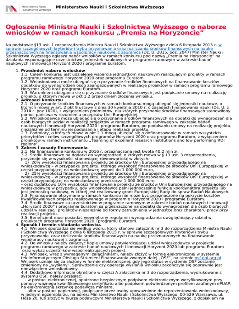 Ministerstwo Nauki i Szkolnictwa Wyższego Ogłoszenie Ministra Nauki i Szkolnictwa Wyższego o naborze wniosków w ramach konkursu „Premia na Horyzoncie” Na podstawie §13 ust. 1 rozporządzenia Ministra Nauki i Szkolnictwa Wyższego z dnia 6 listopada 2015 r. w sprawie szczegółowych kryteriów i trybu przyznawania oraz rozliczania środków finansowych na naukę przeznaczonych na finansowanie współpracy naukowej z zagranicą (Dz. U. 2015, poz. 2047) Minister Nauki i Szkolnictwa Wyższego ogłasza nabór wniosków w ramach konkursu pod nazwą „Premia na Horyzoncie” na działania wspomagające uczestnictwo jednostek naukowych w programie ramowym w zakresie badań naukowych i innowacji Horyzont 2020 i programie Euratom. 1. Przedmiot naboru wniosków 1.1. Celem konkursu jest udzielenie wsparcia jednostkom naukowym realizującym projekty w ramach programu ramowego Horyzont 2020 oraz programu Euratom. 1.2. Wnioskodawca może ubiegać się o przyznanie środków finansowych na finansowanie kosztów dodatków do wynagrodzeń osób zaangażowanych w realizację projektów w ramach programu ramowego Horyzont 2020 oraz programu Euratom. 1.3. Warunkiem ubiegania się o przyznanie środków finansowych jest podpisanie umowy na realizację projektu o którym mowa w pkt 1.2 przed dniem złożenia wniosku. 2. Adresaci konkursu 2.1. O przyznanie środków finansowych w ramach konkursu mogą ubiegać się jednostki naukowe, o których mowa w art. 2 pkt 9 ustawy z dnia 30 kwietnia 2010 r. o zasadach finansowania nauki (Dz. U. z 2014 r. poz.1620), z wyłączeniem podmiotów, dla których przyznanie środków finansowych stanowiłoby pomoc państwa w rozumieniu przepisów Unii Europejskiej. 2.2. Wnioskodawca może ubiegać się o przyznanie środków finansowych na dodatki do wynagrodzeń dla osób biorących udział w realizacji projektów w ramach programu ramowego w zakresie badań naukowych i innowacji Horyzont 2020 i programu Euratom, po podpisaniu umowy na realizację projektu, niezależnie od terminu jej podpisania i etapu realizacji projektu. 2.3. Podmioty, o których mowa w pkt 2.1 mogą ubiegać się o dofinansowanie w ramach wszystkich priorytetów i celów szczegółowych programów Horyzont 2020 oraz programu Euratom, z wyłączeniem projektów w ramach instrumentu „Teaming of excellent research institutions and low performing RDI regions”. 3. Zakres i zasady finansowania 3.1. Na finansowanie konkursu w 2016 r. przeznaczona jest kwota 40,2 mln zł. 3.2. Środki finansowe na dodatki do wynagrodzeń, o których mowa w § 13 ust. 3 rozporządzenia, przyznaje się w wysokości stanowiącej równowartość w złotych: 1) 20% wysokości finansowania projektu ze środków Unii Europejskiej przypadającego na wnioskodawcę – w przypadku projektu, którego wysokość finansowania ze środków Unii Europejskiej w części przypadającej na wnioskodawcę wynosi do 1 000 000 euro, 2) 25% wysokości finansowania projektu ze środków Unii Europejskiej przypadającego na wnioskodawcę – w przypadku projektu, którego wysokość finansowania ze środków Unii Europejskiej w części przypadającej na wnioskodawcę przekracza 1 000 000 euro – oraz dodatkowo 10% wysokości finansowania projektu ze środków Unii Europejskiej przypadającego na wnioskodawcę w przypadku, gdy wnioskodawca pełni jednocześnie funkcję koordynatora projektu lub jest jednostką naukową, w której jest realizowany grant Europejskiej Rady do spraw Badań Naukowych. 3.3. Finansowanie otrzymane w ramach konkursu nie może być przeznaczone na pokrycie kosztów kwalifikowalnych projektu realizowanego w programie Horyzont 2020 i programie Euratom. 3.4. Środki finansowe za uczestnictwo w programie ramowym w zakresie badań naukowych i innowacji „Horyzont 2020” i programie Euratom są przeznaczone na dodatki do wynagrodzeń dla osób biorących udział w realizacji projektów niezależnie od formy zatrudnienia w jednostce oraz charakteru pracy przy realizacji projektu. 3.5. Beneficjent musi posiadać wewnętrzny regulamin wynagradzania uwzględniający udział w projektach programu Horyzont 2020 i programu Euratom. 4. Sposób i termin składania wniosku. 4.1. Wniosek sporządza się według wzoru, który stanowi załącznik nr 3 do rozporządzenia Ministra Nauki i Szkolnictwa Wyższego z dnia 6 listopada 2015 r. w sprawie szczegółowych kryteriów i trybu przyznawania oraz rozliczania środków finansowych na naukę przeznaczonych na finansowanie współpracy naukowej z zagranicą. 4.2. Do wniosku należy załączyć kopię umowy potwierdzającej udział wnioskodawcy w projekcie programu ramowego w zakresie badań naukowych i innowacji Horyzont 2020 lub programu Euratom oraz wykaz uczestników współrealizujących projekt. 4.3. Wniosek, wraz z wymaganymi załącznikami, należy złożyć w formie elektronicznej w systemie teleinformatycznym Obsługa Strumieni Finansowania zwanym dalej „OSF”, na stronie osf.opi.org.pl. Wniosek uznaje się za złożony w formie elektronicznej, gdy jego status w systemie OSF zostanie zmieniony na „wysłany”. Sprawdzenie czy operacja wysłania wniosku zakończyła się poprawnie jest obowiązkiem wnioskodawcy. 4.4. Dodatkowo informacje określone w części A załącznika nr 3 do rozporządzenia, wydrukowane z systemu OSF, należy przesłać: - w postaci elektronicznej, opatrzone bezpiecznym podpisem elektronicznym weryfikowanym przy pomocy ważnego kwalifikowanego certyfikatu albo podpisem potwierdzonym profilem zaufanym ePUAP, na elektroniczną skrzynkę podawczą ministra, - albo w postaci papierowej, podpisane przez osoby upoważnione do reprezentowania wnioskodawcy, w jednym egzemplarzu, na adres: Ministerstwo Nauki i Szkolnictwa Wyższego, 00-529 Warszawa, ul. Hoża 20, lub złożyć w biurze podawczym Ministerstwa Nauki i Szkolnictwa Wyższego, z dopiskiem na Ministerstwo Nauki i Szkolnictwa Wyższego kopercie: „Premia na Horyzoncie”. 4.5. Wniosek składa kiero