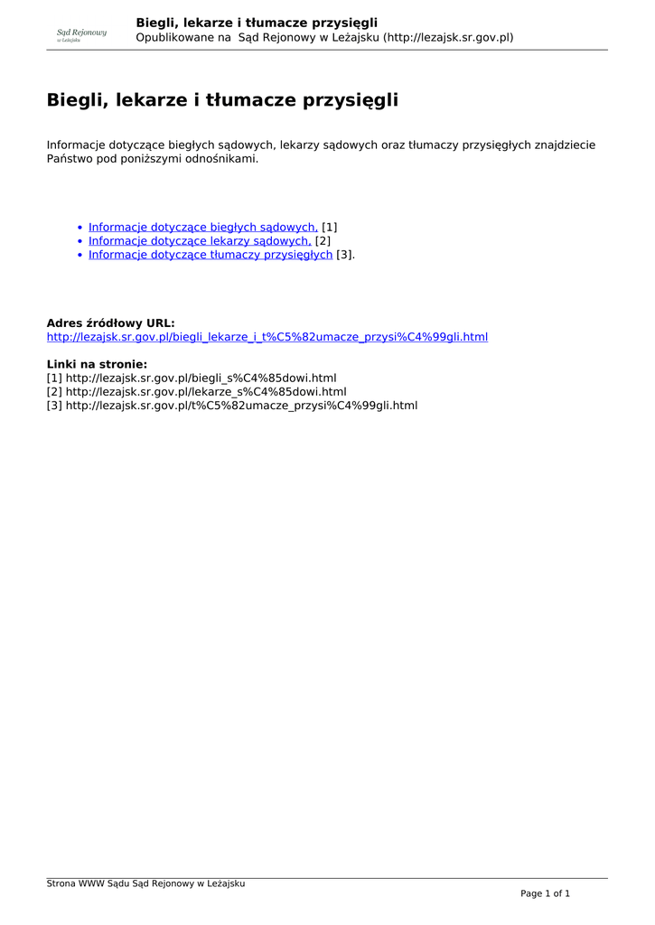 Biegli, lekarze i tłumacze przysięgli Opublikowane na Sąd Rejonowy w Leżajsku (http://lezajsk.sr.gov.pl) Biegli, lekarze i tłumacze przysięgli Informacje dotyczące biegłych sądowych, lekarzy sądowych oraz tłumaczy przysięgłych znajdziecie Państwo pod poniższymi odnośnikami. Informacje dotyczące biegłych sądowych, [1] Informacje dotyczące lekarzy sądowych, [2] Informacje dotyczące tłumaczy przysięgłych [3]. Adres źródłowy URL: http://lezajsk.sr.gov.pl/biegli_lekarze_i_t%C5%82umacze_przysi%C4%99gli.html Linki na stronie: [1] http://lezajsk.sr.gov.pl/biegli_s%C4%85dowi.html [2] http://lezajsk.sr.gov.pl/lekarze_s%C4%85dowi.html [3] http://lezajsk.sr.gov.pl/t%C5%82umacze_przysi%C4%99gli.html Strona WWW Sądu Sąd Rejonowy w Leżajsku Page 1 of 1