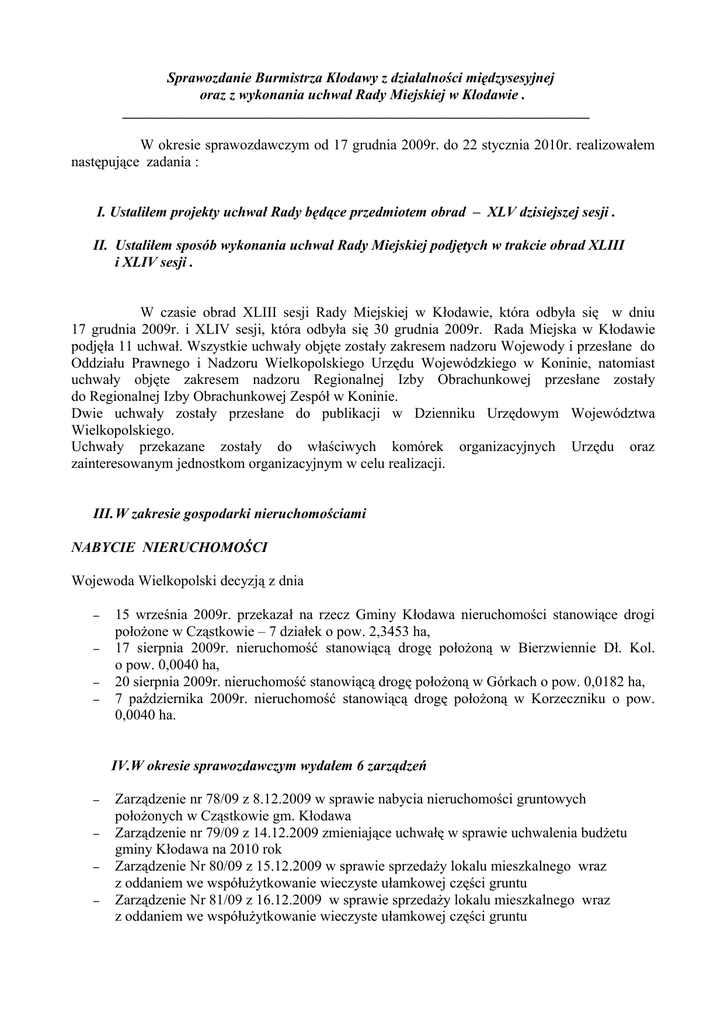 Sprawozdanie Burmistrza Kłodawy z działalności międzysesyjnej oraz z wykonania uchwał Rady Miejskiej w Kłodawie . ________________________________________________________________ W okresie sprawozdawczym od 17 grudnia 2009r. do 22 stycznia 2010r. realizowałem następujące zadania : I. Ustaliłem projekty uchwał Rady będące przedmiotem obrad – XLV dzisiejszej sesji . II. Ustaliłem sposób wykonania uchwał Rady Miejskiej podjętych w trakcie obrad XLIII i XLIV sesji . W czasie obrad XLIII sesji Rady Miejskiej w Kłodawie, która odbyła się w dniu 17 grudnia 2009r. i XLIV sesji, która odbyła się 30 grudnia 2009r. Rada Miejska w Kłodawie podjęła 11 uchwał. Wszystkie uchwały objęte zostały zakresem nadzoru Wojewody i przesłane do Oddziału Prawnego i Nadzoru Wielkopolskiego Urzędu Wojewódzkiego w Koninie, natomiast uchwały objęte zakresem nadzoru Regionalnej Izby Obrachunkowej przesłane zostały do Regionalnej Izby Obrachunkowej Zespół w Koninie. Dwie uchwały zostały przesłane do publikacji w Dzienniku Urzędowym Województwa Wielkopolskiego. Uchwały przekazane zostały do właściwych komórek organizacyjnych Urzędu oraz zainteresowanym jednostkom organizacyjnym w celu realizacji. III.W zakresie gospodarki nieruchomościami NABYCIE NIERUCHOMOŚCI Wojewoda Wielkopolski decyzją z dnia – – – – 15 września 2009r. przekazał na rzecz Gminy Kłodawa nieruchomości stanowiące drogi położone w Cząstkowie – 7 działek o pow. 2,3453 ha, 17 sierpnia 2009r. nieruchomość stanowiącą drogę położoną w Bierzwiennie Dł. Kol. o pow. 0,0040 ha, 20 sierpnia 2009r. nieruchomość stanowiącą drogę położoną w Górkach o pow. 0,0182 ha, 7 października 2009r. nieruchomość stanowiącą drogę położoną w Korzeczniku o pow. 0,0040 ha. IV.W okresie sprawozdawczym wydałem 6 zarządzeń – – – – Zarządzenie nr 78/09 z 8.12.2009 w sprawie nabycia nieruchomości gruntowych położonych w Cząstkowie gm. Kłodawa Zarządzenie nr 79/09 z 14.12.2009 zmieniające uchwałę w sprawie uchwalenia budżetu gminy Kłodawa na 2010 rok Zarządzenie Nr 80/09 z 15.12.2009 w sprawie sprzedaży lokalu mieszkalnego wraz z oddaniem we współużytkowanie wieczyste ułamkowej części gruntu Zarządzenie Nr 81/09 z 16.12.2009 w sprawie sprzedaży lokalu mieszkalnego wraz z oddaniem we współużytkowanie wieczyste ułamkowej części gruntu -2– – Zarządzenie Nr 82/09 z 28.12.2009 w sprawie nabycia nieruchomości gruntowych położonych w Cząstkowie gm. Kłodawa Zarządzenie Nr 83/09 zmieniające uchwałę w sprawie uchwalenia budżetu Gminy Kłodawa na 2009 rok V. W zakresie zamówień publicznych oraz funduszy Zamówienia publiczne 1. Dostarczenie materiałów kancelaryjnych oraz materiałów eksploatacyjnych do drukarek i kserokopiarek. 6.01.2010 roku zostało wszczęte postępowanie w sprawie udzielenia zamówienia publicznego na wykonanie w/w zamówienia. Termin składania ofert ustalono na dzień 13.01.2010 roku. W wymaganym terminie wpłynęły 4 ważne oferty. Otwarcia ofert dokonano w siedzibie Urzędu Miasta i Gminy w Kłodawie. Ze względu na najniższą cenę, za najkorzystniejszą uznano ofertę spełniającą wymogi formalne, złożoną przez Wykonawcę „EMIKA” Marek Kocik Grabieniec 56A Turek z ceną ofertową 26.825,97 zł brutto. Umowa z Wykonawcą została podpisana 20.01.2010 roku. 2. Dostawa oleju napędowego na potrzeby Gminy Kłodawa w roku 2010. 20.01.2010 roku zostało wszczęte postępowanie w sprawie udzielenia zamówienia publicznego na wykonanie w/w zamówienia. Termin składania ofert ustalono na dzień 27.01.2010 roku. 3. Wykonanie inwentaryzacji budynków i operatów szacunkowych ustalających wartość lokali stanowiących własność Gminy Kłodawa dla ustalenia ceny ich sprzedaży. 20.01.2010 roku zostało wszczęte postępowanie w sprawie udzielenia zamówienia publicznego na wykonanie w/w zamówienia. Termin składania ofert ustalono na dzień 27.01.2010 roku. Fundusze europejskie 1. W dniu 15.01.2010 roku Gmina Kłodawa złożyła ankietę weryfikacyjną wraz z załącznikami, obejmującymi okres 2006 – 2008 w IV Edycji Konkursu“Teraz Polska” dla Gmin. Celem Konkursu jest wyróżnienie z grupy ubiegających się samorządów i nominowanie do wyróżnienia Godłem najatrakcyjniejszych i dynamicznie rozwijających się gmin w Polsce. 2. W dniu 15.01.2010 roku Urząd Miasta i Gminy w Kłodawie rozliczył dotację z programu rządowego „Radosna szkoła” 2009. W programie wzięło udział 6 szkół podstawowych z terenu Gminy Kłodawa. Zakupione w ramach dotacji pomoce dydaktyczne, czyli duże, miękkie klocki, miękkie piłki, materace do zabaw ruchowych, tory przeszkód, drabinki, materiały do integracji zmysłowej i stymulacji wielozmysłowej, przyczynią się do kształtowania u dzieci umiejętności motorycznych oraz umiejętności w zakresie koordynacji wzrokowo – ruchowej. -3VI. W zakresie oświaty W związku z zaleceniami wydanymi przez Komendę Powiatową Państwowej Straży Pożarnej w Kole oraz wynikami ekspertyzy technicznej dokonanej przez rzeczoznawcą budowlanego z dniem 30 stycznia br. budynek C Zespołu Szkół Nr 1 w Kłodawie zostanie zamknięty dla uczniów. Zajęcia lekcyjne będą się odbywały w budynku A i B , w kilku przypadkach zajęcia będą prowadzone na dwie zmiany. Ekspertyza techniczna wykazała , że budynek nie spełnia wymagań przeciwpożarowych , a stopień zużycia technicznego oceniono na 65 %. VI. Ponadto w okresie sprawozdawczym 1. W zakresie spraw mieszkaniowych Sprawy lokalowe I. W wykonaniu Uchwały Rady Miejskiej w Kłodawie Nr 319/09 z dnia 28 kwietnia 2009r. zgodnie z Zarządzeniem Burmistrza Kłodawy Nr 37/09 z dnia 05.05.2009r.i Zarządzeniem Burmistrza Kłodawy Nr 54/09 z dnia 07.07.2009r. został sprzedany na rzecz najemcy lokal mieszkalny przy ulicy: 1.Boh. Września 1/15 za cenę 12.986,00 zł + podatek vat stawka zw, wraz ze zbyciem na współwłasno