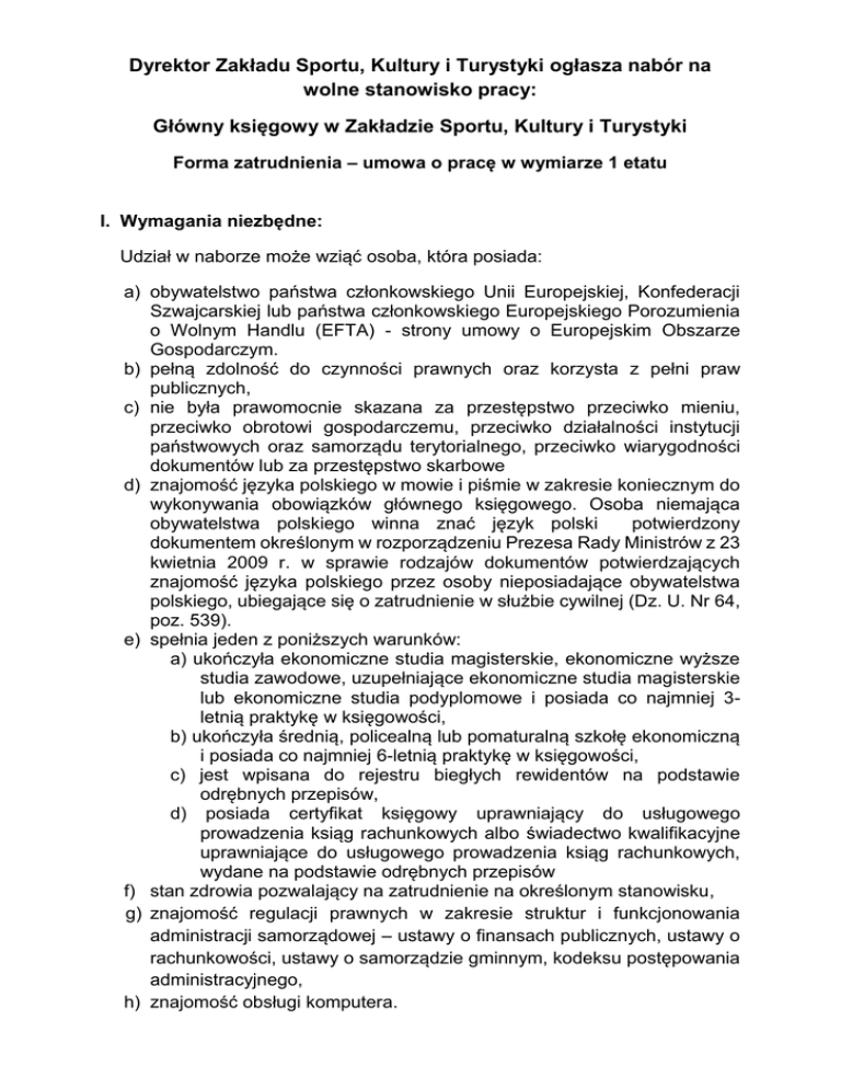 Dyrektor Zakładu Sportu, Kultury i Turystyki ogłasza nabór na wolne stanowisko pracy: Główny księgowy w Zakładzie Sportu, Kultury i Turystyki Forma zatrudnienia – umowa o pracę w wymiarze 1 etatu I. Wymagania niezbędne: Udział w naborze może wziąć osoba, która posiada: a) obywatelstwo państwa członkowskiego Unii Europejskiej, Konfederacji Szwajcarskiej lub państwa członkowskiego Europejskiego Porozumienia o Wolnym Handlu (EFTA) - strony umowy o Europejskim Obszarze Gospodarczym. b) pełną zdolność do czynności prawnych oraz korzysta z pełni praw publicznych, c) nie była prawomocnie skazana za przestępstwo przeciwko mieniu, przeciwko obrotowi gospodarczemu, przeciwko działalności instytucji państwowych oraz samorządu terytorialnego, przeciwko wiarygodności dokumentów lub za przestępstwo skarbowe d) znajomość języka polskiego w mowie i piśmie w zakresie koniecznym do wykonywania obowiązków głównego księgowego. Osoba niemająca obywatelstwa polskiego winna znać język polski potwierdzony dokumentem określonym w rozporządzeniu Prezesa Rady Ministrów z 23 kwietnia 2009 r. w sprawie rodzajów dokumentów potwierdzających znajomość języka polskiego przez osoby nieposiadające obywatelstwa polskiego, ubiegające się o zatrudnienie w służbie cywilnej (Dz. U. Nr 64, poz. 539). e) spełnia jeden z poniższych warunków: a) ukończyła ekonomiczne studia magisterskie, ekonomiczne wyższe studia zawodowe, uzupełniające ekonomiczne studia magisterskie lub ekonomiczne studia podyplomowe i posiada co najmniej 3letnią praktykę w księgowości, b) ukończyła średnią, policealną lub pomaturalną szkołę ekonomiczną i posiada co najmniej 6-letnią praktykę w księgowości, c) jest wpisana do rejestru biegłych rewidentów na podstawie odrębnych przepisów, d) posiada certyfikat księgowy uprawniający do usługowego prowadzenia ksiąg rachunkowych albo świadectwo kwalifikacyjne uprawniające do usługowego prowadzenia ksiąg rachunkowych, wydane na podstawie odrębnych przepisów f) stan zdrowia pozwalający na zatrudnienie na określonym stanowisku, g) znajomość regulacji prawnych w zakresie struktur i funkcjonowania administracji samorządowej – ustawy o finansach publicznych, ustawy o rachunkowości, ustawy o samorządzie gminnym, kodeksu postępowania administracyjnego, h) znajomość obsługi komputera. II. Wymagania dodatkowe: a) samodzielność i staranność w wykonywaniu obowiązków, b) umiejętność pracy w zespole, komunikatywność, rzetelność, odpowiedzialność, c) mile widziane doświadczenie w pracy w jednostce samorządu terytorialnego lub innej jednostce sektora finansów publicznych (w komórce finansowo-księgowej). d) znajomość zasad księgowości budżetowej, e) znajomość obsługi programów: księgowego, płacowego, PŁATNIKA. III. Zakres wykonywanych zadań na stanowisku: prowadzenie rachunkowości Zakładu Sportu, Kultury i Turystyki, wykonywanie dyspozycji środkami pieniężnymi, dokonywanie wstępnej kontroli: zgodności operacji gospodarczych i finansowych z planem finansowym, kompletności i rzetelności dokumentów dotyczących operacji gospodarczych i finansowych, d) sporządzanie różnego rodzaju sprawozdań i analiz. e) wykonywanie innych obowiązków z zakresu księgowości określonych w Regulaminie Organizacyjnym Zakładu Sportu, Kultury i Turystyki. a) b) c) - IV. Warunki pracy na danym stanowisku: Wykonywanie prac biurowych wraz z obsługą komputera, w tym sporządzanie, przenoszenie, porządkowanie, dostarczanie, wysyłanie dokumentów. Praca odbywa się w systemie jednozmianowym w pomieszczeniu zamkniętym przy oświetleniu sztucznym i naturalnym w pozycji siedzącej. W pracy pracownik posługuje się komputerem, drukarką, kserokopiarką. V. Wymagane dokumenty a) CV oraz list motywacyjny, b) kserokopie dokumentów potwierdzających posiadane wykształcenie oraz staż pracy, c) oświadczenie kandydata o korzystaniu z pełni praw publicznych, d) oświadczenie kandydata o niekaralności, e) oświadczenie kandydata o braku przeciwwskazań zdrowotnych do wykonywania pracy na w/w stanowisku, f) kwestionariusz osobowy dla osoby ubiegającej się o zatrudnienie. g) W przypadku osób niemających obywatelstwa polskiego dokument określonym w rozporządzeniu Prezesa Rady Ministrów z 23 kwietnia 2009 r. w sprawie rodzajów dokumentów potwierdzających znajomość języka polskiego przez osoby nieposiadające obywatelstwa polskiego, ubiegające się o zatrudnienie w służbie cywilnej (Dz. U. Nr 64, poz. 539) potwierdzający znajomość języka polskiego. VI. Informacje dodatkowe a) W lutym 2015 r. wskaźnik zatrudnienia osób niepełnosprawnych w Zakładzie Sportu, Kultury i Turystyki, w rozumieniu przepisów o rehabilitacji zawodowej i społecznej oraz zatrudnianiu osób niepełnosprawnych nie wynosił co najmniej 6%, b) Kandydat, będący osobą niepełnosprawną, który zamierza przystąpić do konkursu i skorzystać z uprawnienia, o którym mowa w art.13a ust.2 ustawy z dnia 21 listopada 2008 r. o pracownikach samorządowych (Dz.U. Nr 223, poz.1458 z póź.zm.) jest zobowiązany do złożenia wraz z dokumentami kopii dokumentu potwierdzającego niepełnosprawność. Wymagane dokumenty aplikacyjne winny być opatrzone klauzulą: Wyrażam zgodę na przetwarzanie moich danych osobowych zawartych w ofercie pracy dla potrzeb niezbędnych do realizacji procesu rekrutacji zgodnie z ustawą z dn. 29 sierpnia 1997 r. o ochronie danych osobowych (Dz. U. z 2002 r. Nr 101, poz. 926 z póź. zm.) oraz o pracownikach samorządowych z 21 listopada 2008 r. (Dz. U. Nr 223, poz. 1458 z póź. zm.). Wymagane dokumenty aplikacyjne należy składać w zamkniętych kopertach, w Zakładzie Sportu, Kultury i Turystyki (pok. nr 8), z dopiskiem: nabór na stanowisko Głównego Księgowego Zakładu Sportu, Kultury i Turystyki, w terminie do dnia 12 marca 2015 roku do godz. 14.00. Aplikacje, które wpłyną do ZSKiT po