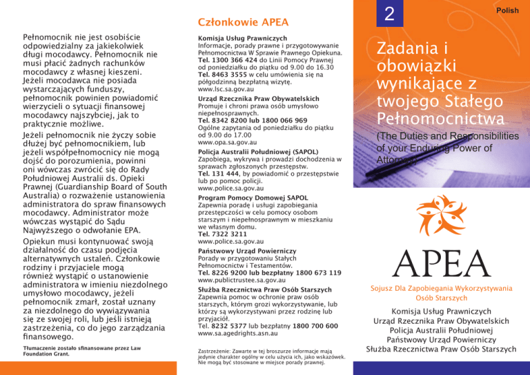 Pełnomocnik nie jest osobiście odpowiedzialny za jakiekolwiek długi mocodawcy. Pełnomocnik nie musi płacić żadnych rachunków mocodawcy z własnej kieszeni. Jeżeli mocodawca nie posiada wystarczających funduszy, pełnomocnik powinien powiadomić wierzycieli o sytuacji finansowej mocodawcy najszybciej, jak to praktycznie możliwe. Jeżeli pełnomocnik nie życzy sobie dłużej być pełnomocnikiem, lub jeżeli współpełnomocnicy nie mogą dojść do porozumienia, powinni oni wówczas zwrócić się do Rady Południowej Australii ds. Opieki Prawnej (Guardianship Board of South Australia) o rozważenie ustanowienia administratora do spraw finansowych mocodawcy. Administrator może wówczas wystąpić do Sądu Najwyższego o odwołanie EPA. Opiekun musi kontynuować swoją działalność do czasu podjęcia alternatywnych ustaleń. Członkowie rodziny i przyjaciele mogą również wystąpić o ustanowienie administratora w imieniu niezdolnego umysłowo mocodawcy, jeżeli pełnomocnik zmarł, został uznany za niezdolnego do wywiązywania się ze swojej roli, lub jeśli istnieją zastrzeżenia, co do jego zarządzania finansowego. Tłumaczenie zostało sfinansowane przez Law Foundation Grant. Członkowie APEA Komisja Usług Prawniczych Informacje, porady prawne i przygotowywanie Pełnomocnictwa W Sprawie Prawnego Opiekuna. Tel. 1300 366 424 do Linii Pomocy Prawnej od poniedziałku do piątku od 9.00 do 16.30 Tel. 8463 3555 w celu umówienia się na półgodzinną bezpłatną wizytę. www.lsc.sa.gov.au Urząd Rzecznika Praw Obywatelskich Promuje i chroni prawa osób umysłowo niepełnosprawnych. Tel. 8342 8200 lub 1800 066 969 Ogólne zapytania od poniedziałku do piątku od 9.00 do 17.00 www.opa.sa.gov.au Policja Australii Południowej (SAPOL) Zapobiega, wykrywa i prowadzi dochodzenia w sprawach zgłoszonych przestępstw. Tel. 131 444, by powiadomić o przestępstwie lub po pomoc policji. www.police.sa.gov.au 2 Polish Zadania i obowiązki wynikające z twojego Stałego Pełnomocnictwa (The Duties and Responsibilities of your Enduring Power of Attorney) Program Pomocy Domowej SAPOL Zapewnia poradę i usługi zapobiegania przestępczości w celu pomocy osobom starszym i niepełnosprawnym w mieszkaniu we własnym domu. Tel. 7322 3211 www.police.sa.gov.au Państwowy Urząd Powierniczy Porady w przygotowaniu Stałych Pełnomocnictw i Testamentów. Tel. 8226 9200 lub bezpłatny 1800 673 119 www.publictrustee.sa.gov.au Służba Rzecznictwa Praw Osób Starszych Zapewnia pomoc w ochronie praw osób starszych, którym grozi wykorzystywanie, lub którzy są wykorzystywani przez rodzinę lub przyjaciół. Tel. 8232 5377 lub bezpłatny 1800 700 600 www.sa.agedrights.asn.au Zastrzeżenie: Zawarte w tej broszurze informacje mają jedynie charakter ogólny w celu użycia ich, jako wskazówek. Nie mogą być stosowane w miejsce porady prawnej. Sojusz Dla Zapobiegania Wykorzystywania Osób Starszych Komisja Usług Prawniczych Urząd Rzecznika Praw Obywatelskich Policja Australii Południowej Państwowy Urząd Powierniczy Służba Rzecznictwa Praw Osób Starszych Główne punkty Rola i obowiązki pełnomocnika Mocodawca, jest to osoba, która udziela Stałego Pełnomocnictwa innej osobie. Pełnomocnik staje się prawnie odpowiedzialny, kiedy EPA zostaje uaktywnione. Może to nastąpić natychmiast po podpisaniu EPA, lub, kiedy lekarz lub neuropsycholog stwierdzą, że mocodawca stracił zdolność do podejmowania decyzji finansowych. Przyjmujący, jest osobą, która akceptuje Stałe Pełnomocnictwo, i która nazywa się pełnomocnikiem. Mocodawca może ustanowić pełnomocnika do działania natychmiastowego oraz/lub w przypadku utraty zdolności umysłowej*. Stałe Pełnomocnictwo (EPA) pozwala pełnomocnikowi podejmować decyzje finansowe w imieniu mocodawcy po tym, jak utraci on zdolność umysłową. Pełnomocnik nie może podejmować decyzji medycznych ani dotyczących opieki zdrowotnej, miejsca zamieszkania lub stylu życia mocodawcy. *Zdolność umysłowa odnosi się do możności zrozumienia charakteru i konsekwencji decyzji oraz alternatywnych wyborów i konsekwencji, do jakich mogą one doprowadzić. Jeżeli ustanowionych jest więcej pełnomocników, niż jeden, muszą oni dojść do porozumienia w sprawie decyzji finansowych. Pełnomocnik ma absolutny obowiązek działania zawsze w najlepszym interesie mocodawcy. Działanie w inny sposób jest przestępstwem*. *Pełnomocnik, który postępuje w sposób nieodpowiedni, może być osobiście i karnie odpowiedzialny za straty. Zagrożone zostać mogą dom, kosztowności i dochód pełnomocnika. Pełnomocnik musi wziąć pod uwagę wszelkie instrukcje mocodawcy zawarte w EPA. Główną rolą pełnomocnika jest płacenie rachunków mocodawcy pieniędzmi mocodawcy. Pełnomocnik może również kupić i sprzedać majątek w imieniu mocodawcy, ale jedynie wtedy, gdy jest to w interesie finansowym mocodawcy (np., żeby zapłacić za pobyt mocodawcy w domu opieki). Mocodawca musi zachowywać dokładne dowody płatności i rachunki za wszystkie transakcje w czasie wykonywania swoich obowiązków. Niewywiązanie się z tego jest przestępstwem. Pełnomocnik nie ma żadnego prawa do spadku mocodawcy przed jego śmiercią. Pełnomocnikowi nie wolno jest przyjmować wynagrodzenia za pracę wykonywaną w imieniu mocodawcy, z wyjątkiem pokrywania wydatków kieszonkowych bezpośrednio związanych z wykonywaniem swoich obowiązków. Pełnomocnikowi nie wolno jest wypłacać sobie wynagrodzenia za wykonywane obowiązki w ramach EPA, ale może on potrącać sobie koszty przejazdów poniesione w czasie wykonywania swoich obowiązków.