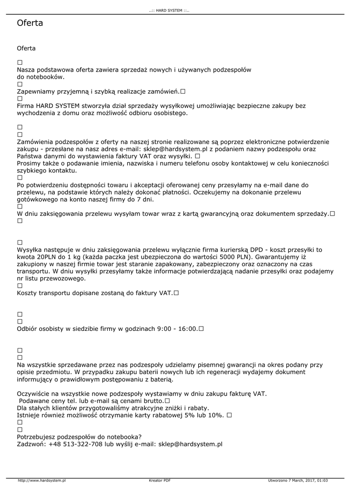 ..:: HARD SYSTEM ::.. Oferta Oferta Nasza podstawowa oferta zawiera sprzedaż nowych i używanych podzespołów do notebooków. Zapewniamy przyjemną i szybką realizacje zamówień. Firma HARD SYSTEM stworzyła dział sprzedaży wysyłkowej umożliwiając bezpieczne zakupy bez wychodzenia z domu oraz możliwość odbioru osobistego. Zamówienia podzespołów z oferty na naszej stronie realizowane są poprzez elektroniczne potwierdzenie zakupu - przesłane na nasz adres e-mail: [email protected] z podaniem nazwy podzespołu oraz Państwa danymi do wystawienia faktury VAT oraz wysyłki. Prosimy także o podawanie imienia, nazwiska i numeru telefonu osoby kontaktowej w celu konieczności szybkiego kontaktu. Po potwierdzeniu dostępności towaru i akceptacji oferowanej ceny przesyłamy na e-mail dane do przelewu, na podstawie których należy dokonać płatności. Oczekujemy na dokonanie przelewu gotówkowego na konto naszej firmy do 7 dni. W dniu zaksięgowania przelewu wysyłam towar wraz z kartą gwarancyjną oraz dokumentem sprzedaży. Wysyłka następuje w dniu zaksięgowania przelewu wyłącznie firma kurierską DPD - koszt przesyłki to kwota 20PLN do 1 kg (każda paczka jest ubezpieczona do wartości 5000 PLN). Gwarantujemy iż zakupiony w naszej firmie towar jest staranie zapakowany, zabezpieczony oraz oznaczony na czas transportu. W dniu wysyłki przesyłamy także informacje potwierdzającą nadanie przesyłki oraz podajemy nr listu przewozowego. Koszty transportu dopisane zostaną do faktury VAT. Odbiór osobisty w siedzibie firmy w godzinach 9:00 - 16:00. Na wszystkie sprzedawane przez nas podzespoły udzielamy pisemnej gwarancji na okres podany przy opisie przedmiotu. W przypadku zakupu baterii nowych lub ich regeneracji wydajemy dokument informujący o prawidłowym postępowaniu z baterią. Oczywiście na wszystkie nowe podzespoły wystawiamy w dniu zakupu fakturę VAT. Podawane ceny tel. lub e-mail są cenami brutto. Dla stałych klientów przygotowaliśmy atrakcyjne zniżki i rabaty. Istnieje również możliwość otrzymanie karty rabatowej 5% lub 10%. Potrzebujesz podzespołów do notebooka? Zadzwoń: +48 513-322-708 lub wyślij e-mail: [email protected] http://www.hardsystem.pl Kreator PDF Utworzono 7 March, 2017, 01:03