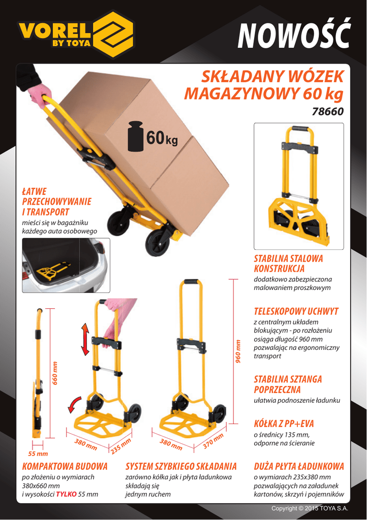 NOWOŚĆ SKŁADANY WÓZEK MAGAZYNOWY 60 kg 78660 ŁATWE PRZECHOWYWANIE I TRANSPORT mieści się w bagażniku każdego auta osobowego STABILNA STALOWA KONSTRUKCJA dodatkowo zabezpieczona malowaniem proszkowym 660 mm 960 mm TELESKOPOWY UCHWYT z centralnym układem blokującym - po rozłożeniu osiąga długość 960 mm pozwalając na ergonomiczny transport STABILNA SZTANGA POPRZECZNA ułatwia podnoszenie ładunku KÓŁKA Z PP+EVA 380 55 mm mm 5 23 mm 380 mm 0 37 mm o średnicy 135 mm, odporne na ścieranie KOMPAKTOWA BUDOWA SYSTEM SZYBKIEGO SKŁADANIA DUŻA PŁYTA ŁADUNKOWA po złożeniu o wymiarach 380x660 mm i wysokości TYLKO 55 mm zarówno kółka jak i płyta ładunkowa składają się jednym ruchem o wymiarach 235x380 mm pozwalających na załadunek kartonów, skrzyń i pojemników Copyright © 2015 TOYA S.A. NOWOŚĆ SKŁADANY WÓZEK MAGAZYNOWY 90 kg 78661 ŁATWE PRZECHOWYWANIE I TRANSPORT mieści się w bagażniku każdego auta osobowego LEKKA ALUMINIOWA KONSTRUKCJA 710 mm 1080 mm zapewnia niską wagę własną, dzięki czemu wózek jest praktyczny i wygodny zarówno dla kobiet jak i mężczyzn TELESKOPOWY UCHWYT z systemem blokującym - po rozłożeniu osiąga długość 1080 mm pozwalając na ergonomiczny transport STABILNA SZTANGA POPRZECZNA ułatwia podnoszenie ładunku KÓŁKA Z PP+EVA 355 mm 190 mm m 0m 24 390 mm m 0m 41 KOMPAKTOWA BUDOWA SYSTEM SZYBKIEGO SKŁADANIA po złożeniu o wymiarach TYLKO 190x710x390 mm płyta ładunkowa składa się jednym ruchem o średnicy 150 mm, odporne na ścieranie DUŻA PŁYTA ŁADUNKOWA wykonana ze stali, o wymiarach 355x240 mm pozwalająca na załadunek kartonów, skrzyń, pojemników czy sprzętu AGD Copyright © 2015 TOYA S.A.