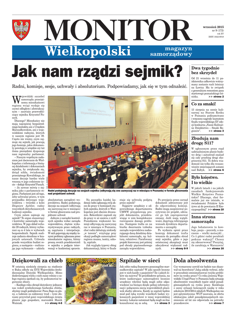 wrzesień 2015 nr 9 (172) rok XV ISSN 1642-0918 Jak nam rządzi sejmik? Radni, komisje, sesje, uchwały i absolutorium. Podpowiadamy, jak się w tym odnaleźć. W Od 21 września do 11 października całkowicie wstrzymany zostanie ruch lotniczy na Ławicy. Ma to związek z generalnym remontem pasa startowego poznańskiego lotniska. >> strona 2 Co za smaki! 13 sierpnia na scenie kulinarnej na Starym Rynku w Poznaniu podsumowano i wręczono nagrody laureatom finału wojewódzkiego XV edycji konkursu „Nasze Kulinarne Dziedzictwo – Smaki Regionów”. >> strona 3 Zbudują nam drogę S11? W ogłoszonym przez rząd uaktualnionym planie budowy dróg i autostrad znalazł się cały przebieg drogi ekspresowej S11. To dobra wiadomość nie tylko dla wczasowiczów zmierzających autami nad Bałtyk. >> strona 6 Było księstwo. I to wielkie FOT. A. BOIŃSKI ojewódzki szczebel samorządu przeciętnemu mieszkańcowi regionu wciąż wydaje się czymś odległym i abstrakcyjnym – zauważa przewodniczący sejmiku Krzysztof Paszyk. Dlaczego? Mieszkańcy nie mają najczęściej bezpośredniego kontaktu ani z Urzędem Marszałkowskim, ani z wojewódzkimi radnymi, których w naszym regionie jest 39. Często nie wiemy, czym zajmuje się sejmik, jak pracują jego komisje, jakie dokumenty powstają w urzędzie czy też iloma pieniędzmi dysponuje nasz regionalny parlament. – Naszym wspólnym zadaniem jest docieranie do Wielkopolan z informacją o bieżącej działalności i dokonaniach sejmiku, by zwiększała się, dotąd nikła, świadomość przeciętnego Kowalskiego, że nasze decyzje bardzo wiele wnoszą w jego codzienne życie – dodaje Krzysztof Paszyk. – Ja zawsze mówię o sejmiku jako o parlamencie regionu. Parlament jest od tego, żeby uchwalać prawo, w tym przypadku dotyczące województwa – twierdzi z kolei Zbigniew Ajchler, radny wszystkich dotychczasowych kadencji sejmiku. Czym zatem zajmuje się sejmik? To organ stanowiący i kontrolny samorządu województwa. W jego skład wchodzi 39 radnych, którzy wybierani są co 4 lata w wyborach bezpośrednich. Sejmik realizuje zadania określone w krajowych ustawach. Uchwala przede wszystkim budżet regionu, a następnie – rozliczając jego wykonanie – udziela Dwa tygodnie bez skrzydeł Radni podejmują decyzje na sesjach sejmiku (odbywają się one zazwyczaj raz w miesiącu w Poznaniu) w formie głosowania nad projektami uchwał. absolutorium zarządowi województwa. Radni podejmują decyzje na sesjach (odbywają się zazwyczaj raz w miesiącu) w formie głosowania nad projektami uchwał. Jednym z narzędzi kontrolnych sejmiku wobec zarządu województwa, chętnie wykorzystywanym przez radnych, są zapytania i interpelacje. W nich pojawiają się między innymi problemy zgłaszane przez mieszkańców regionu, którzy proszą swoich przedstawicieli w sejmiku o podjęcie interwencji w konkretnej sprawie. Na początku każdej kadencji radni zgłaszają swój akces do pracy w komisjach stałych sejmiku, których w Wielkopolsce jest obecnie dwanaście. Rekordziści zapisali się do pracy w aż sześciu z nich! Posiedzenia większości komisji odbywają się zazwyczaj raz w miesiącu w Poznaniu, choć radni debatują niekiedy „w terenie”, wizytując przy okazji podległe samorządowi regionu muzea, teatry, szkoły, szpitale. Jak wygląda typowy obieg dokumentacji, który w finale staje się uchwałą podjętą przez sejmik? Najpierw urzędnicy z odpowiedniego departamentu UMWW przygotowują projekt dokumentu, przedstawiając w nim kompleksowe rozwiązanie danego problemu. Następnie trafia on na biurko decernenta (członka zarządu województwa nadzorującego daną dziedzinę działalności samorządu, np. kulturę, rolnictwo). Parafowany projekt kierowany jest później pod obrady pięcioosobowego zarządu województwa. Po przyjęciu przez zarząd dokument adresowany jest do odpowiedniej komisji. Radni mogą zaopiniować pozytywnie ów projekt, odrzucić go lub zaproponować zmiany. Jeśli mają wątpliwości, dopytują referującego wniosek dyrektora departamentu o szczegóły. Po wydaniu opinii przez komisję dokument trafia wreszcie do porządku obrad sesji sejmiku, gdzie o jego ostatecznej akceptacji musi zdecydować większość radnych. >> strony 8-9 W jakich latach i na jakich zasadach funkcjonowało Wielkie Księstwo Poznańskie? Dlaczego, choć formalnie już nie istniało, w świadomości Polaków było żywe aż do powstania II Rzeczypospolitej? >> strona 10 Inna strona samorządu Jego bohaterowie to kowboje, pasja – pszczoły, a marzenie – wielki motocykl… Co (i gdzie) radni porabiali podczas wakacji? Chcesz się zdenerwować? Poczytaj, ile zarabiają w Warszawie! >> strona 16 Szpitale w sieci Dola absolwenta W ostatnią niedzielę sierpnia na stadionie w Buku odbyły się XVII Wojewódzko-Archidiecezjalne Dożynki Wielkopolskie. Mimo doskwierającej wielu z nich suszy rolnicy z całego regionu spotkali się, by podsumować tegoroczne zbiory. – Każdego roku obrzęd dożynkowy jednoczy nas wokół symbolicznego bochenka chleba, abyśmy mogli podziękować: Panu Bogu za plony, a ludziom za codzienny trud – tymi słowami przywitał gości wojewódzkiego święta plonów jego gospodarz, marszałek Marek Woźniak. >> strony 4-5 Jak sobie radzą finansowo poszczególne marszałkowskie szpitale? W jaki sposób leczony jest w nich każdy z pacjentów? Ile i jakich leków się zużywa? To przykładowe pytania, na które nadzorujący samorządowe lecznice urzędnicy wkrótce będą mogli sobie odpowiedzieć na bieżąco dzięki pełnej informatyzacji i połączeniu siecią wojewódzkich placówek służby zdrowia. Każdy ze szpitali będzie miał pod ręką wyniki wszelkich badań wykonanych pacjentowi w innej wojewódzkiej lecznicy. Lekarze natomiast będą mogli on-line konsultować się ze sobą. >> strona 3 Czy wymarzony zawód nie będzie nas skazywał na bezrobocie? Jaką szkołę wybrać, żeby w przyszłości zmini