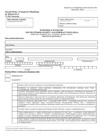 Załącznik nr 1 do Regulaminu użytkowania karty SKA Szczecin, dnia ........................ Zarząd Dróg i Transportu Miejskiego ul. Klonowica 5 71-241 Szczecin termin odbioru Karty Data złożenia wniosku .................................... (wypełnia pracownik POS) (wypełnia pracownik POS ) rrrr/mm/dd) Miejsce odbioru karty: Kasa……………………………………… ………………………… WNIOSEK O WYDANIE SZCZECIŃSKIEJ KARTY AGLOMERACYJNEJ (SKA) IMIENNEJ (NORMALNEJ, ULGOWEJ, BEZPŁATNEJ)1 ORYGINAŁ/DUPLIKAT Dane użytkownika karty: imię/imiona nazwisko Adres zamieszkania: ulica nr domu nr lokalu PESEL miejscowość Data urodzenia (rrrr-mm-dd) E-mail Rodzaj biletu i rodzaj przysługującej ulgi: kod pocztowy nr telefonu NORMALNY ULGOWY2: Studenci szkół wyższych na podstawie ważnej legitymacji studenckiej Kombatanci na podstawie ważnej legitymacji kombatanckiej lub zaświadczenia wydanego przez Urząd ds. Kombatantów i Osób Represjonowanych Uczniowie szkół podstawowych, gimnazjów, liceów, techników, szkół zawodowych i policealnych do ukończenia 23 roku życia, na podstawie ważnej legitymacji szkolnej wydanej według wzoru określonego przez ministra właściwego do spraw oświaty i wychowania Dzieci po ukończeniu 4 roku życia do7 lat na podstawie dokumentu stwierdzającego wiek dziecka (np. książeczka zdrowia dziecka, dowód osobisty itp.) lub oświadczenia rodzica czy opiekuna prawnego Emeryci po ukończeniu odpowiednio 55 lat – w przypadku kobiet i 60 lat – w przypadku mężczyzn oraz renciści na podstawie ważnej legitymacji organu emerytalno-rentowego Rzeczpospolitej Polskiej wraz z dokumentem stwierdzającym tożsamość albo na podstawie aktualnego odcinka renty lub emerytury wraz z dowodem stwierdzającym tożsamość Inwalidzi słuchu na podstawie legitymacji Polskiego Związku Głuchych z wpisem o niepełnosprawności Osoby niepełnosprawne w stopniu umiarkowanym po ukończeniu 16 roku życia – na podstawie ważnej legitymacji wydanej przez powiatowy zespół ds. orzekania o niepełnosprawności, dokumentującej stopień niepełnosprawności zgodnie ze wzorem określonym przez ministra właściwego do spraw zabezpieczenia społecznego wraz z dowodem osobistym lub innym dokumentem umożliwiającym potwierdzenie tożsamości osoby uprawnionej Dzieci, młodzież i studenci do ukończenia 26 roku życia uczęszczający do szkół zagranicznych, na podstawie ważnej międzynarodowej legitymacji International Student Identity Card ( ISIC ) lub Europejskiej Karty Młodzieżowej EURO 26 „Student World” 1 Wniosek proszę wypełnić czytelnie drukowanymi literami. 2 Szczegółowe informacje znajdują się na stronie internetowej www.zditm.szczecin.pl; Przepisy-Uchwała Nr VI/78/15 Rady Miasta Szczecin z dnia 24marca 2015r.. Doktoranci studiów stacjonarnych - na podstawie ważnej legitymacji doktoranta, wydanej według wzoru określonego przez ministra właściwego do spraw nauki i szkolnictwa wyższego Seniorzy – po ukończeniu 67 roku życia do ukończenia 70 roku życia, na podstawie dokumentu stwierdzającego tożsamość oraz wiek pasażera Bezrobotni – na podstawie decyzji orzekającej status bezrobotnego wydanej przez Powiatowy Urząd Pracy i aktualnej karty wizyt wydanej przez Powiatowy Urząd Pracy z dokumentem stwierdzającym tożsamość pasażera (określona w karcie wizyt data zgłoszenia wystawiona maksymalnie 3 miesiące przed terminem wykonywanej kontroli). Osoby posiadające status osoby represjonowanej z powodów politycznych lub działacza opozycji antykomunistycznej i osoby represjonowanej z powodów politycznych na podstawie ważnej legitymacji wydanej przez Urząd ds. Kombatantów i Osób Represjonowanych Bezpłatny Grudzień 70′ - Styczeń 71′ Dane Wnioskodawcy(wypełnić w przypadku gdy użytkownikiem karty jest osoba niepełnoletnia) : imię/imiona nazwisko Adres zamieszkania: ulica nr domu nr lokalu PESEL miejscowość kod pocztowy Data urodzenia (rrrr-mm-dd) OPŁATA ZA DUPLIKAT 10,00 zł. : pobrana / nie pobrana3 ZAŁĄCZNIK – AKTUALNE ZDJĘCIE – FORMAT LEGITYMACYJNY (3,5 x 4,5) 1. 2. 3. 4. 5. 6. 7. Kartę imienną można odebrać po upływie 5 dni kalendarzowych od dnia złożenia wniosku. Oświadczam, że podane przeze mnie dane osobowe są pełne i prawdziwe. Zostałem poinformowany/a, że administratorem danych osobowych zawartych w niniejszym wniosku jest Gmina Miasto Szczecin - ZDiTM w Szczecinie i dane te będą przetwarzane zgodnie z Ustawą z dnia 29.08.1997 r. o ochronie danych osobowych (t. j. Dz. U. z 2016 r., poz. 922). Dane osobowe będą przetwarzane w celu wystawienia Karty SKA imiennej, jej ładowania oraz prowadzenia ewidencji. Kartę SKA należy odebrać w punkcie wskazanym przez klienta w godzinach otwarcia punktu. Za osobę niepełnoletnią wniosek wypełnia i składa oraz odbiera Kartę rodzic lub opiekun prawny dziecka. Wniosek wypełniony nieczytelnie lub nieprawidłowo nie będzie realizowany. Zdjęcie dołączone do wniosku zostanie zwrócone podczas osobistego odbioru Karty SKA. W przypadku utraty ulgi lub jej nabycia oraz w przypadku zmiany zaszeregowania ulgi klient zobowiązany jest do dokonania stosownej zmiany na Karcie SKA w punkcie personalizacji. Oświadczam, że zapoznałem/am się z powyższymi informacjami dotyczącymi Karty SKA i w pełni je akceptuję. Zobowiązuję się korzystać z Karty zgodnie z zasadami zawartymi w regulaminie ZDiTM w Szczecinie. UWAGA! Wydanie Karty SKA nie jest równoznaczne z doładowaniem Karty. ……………………………………………… ....................................................... Data i podpis wnioskodawcy/użytkownika karty podpis pracownika ZDiTM Kwituję odbiór Karty i potwierdzam, że dane na Karcie są zgodne z podanymi we wniosku. …………………… Data 3 rrrr/mm/dd Niepotrzebne skreślić, wypełnia pracownik POK/POS ……………………… Podpis
