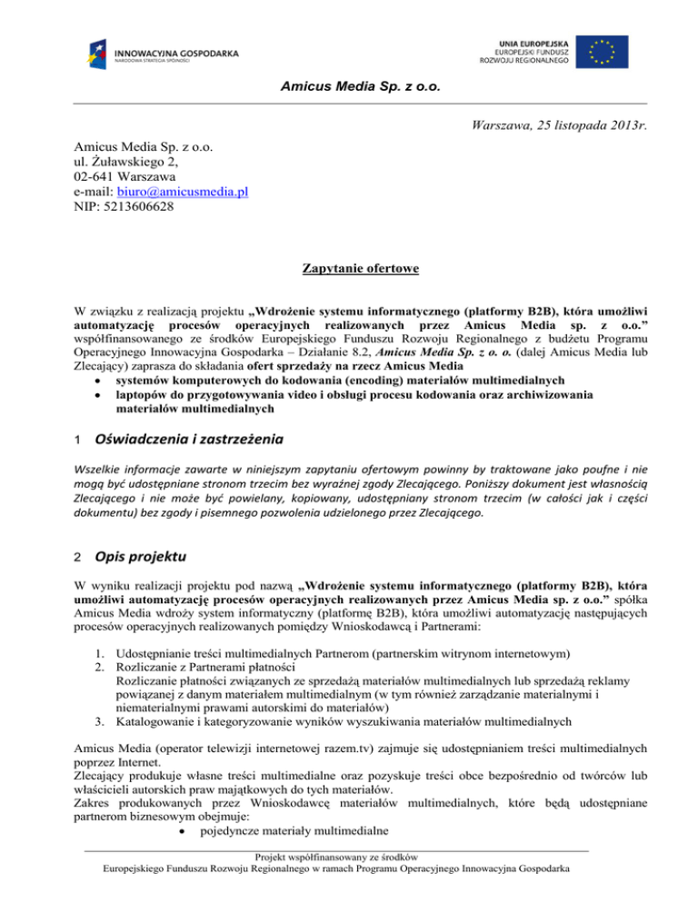 Amicus Media Sp. z o.o. Warszawa, 25 listopada 2013r. Amicus Media Sp. z o.o. ul. Żuławskiego 2, 02-641 Warszawa e-mail: [email protected] NIP: 5213606628 Zapytanie ofertowe W związku z realizacją projektu „Wdrożenie systemu informatycznego (platformy B2B), która umożliwi automatyzację procesów operacyjnych realizowanych przez Amicus Media sp. z o.o.” współfinansowanego ze środków Europejskiego Funduszu Rozwoju Regionalnego z budżetu Programu Operacyjnego Innowacyjna Gospodarka – Działanie 8.2, Amicus Media Sp. z o. o. (dalej Amicus Media lub Zlecający) zaprasza do składania ofert sprzedaży na rzecz Amicus Media systemów komputerowych do kodowania (encoding) materiałów multimedialnych laptopów do przygotowywania video i obsługi procesu kodowania oraz archiwizowania materiałów multimedialnych 1 Oświadczenia i zastrzeżenia Wszelkie informacje zawarte w niniejszym zapytaniu ofertowym powinny by traktowane jako poufne i nie mogą być udostępniane stronom trzecim bez wyraźnej zgody Zlecającego. Poniższy dokument jest własnością Zlecającego i nie może być powielany, kopiowany, udostępniany stronom trzecim (w całości jak i części dokumentu) bez zgody i pisemnego pozwolenia udzielonego przez Zlecającego. 2 Opis projektu W wyniku realizacji projektu pod nazwą „Wdrożenie systemu informatycznego (platformy B2B), która umożliwi automatyzację procesów operacyjnych realizowanych przez Amicus Media sp. z o.o.” spółka Amicus Media wdroży system informatyczny (platformę B2B), która umożliwi automatyzację następujących procesów operacyjnych realizowanych pomiędzy Wnioskodawcą i Partnerami: 1. Udostępnianie treści multimedialnych Partnerom (partnerskim witrynom internetowym) 2. Rozliczanie z Partnerami płatności Rozliczanie płatności związanych ze sprzedażą materiałów multimedialnych lub sprzedażą reklamy powiązanej z danym materiałem multimedialnym (w tym również zarządzanie materialnymi i niematerialnymi prawami autorskimi do materiałów) 3. Katalogowanie i kategoryzowanie wyników wyszukiwania materiałów multimedialnych Amicus Media (operator telewizji internetowej razem.tv) zajmuje się udostępnianiem treści multimedialnych poprzez Internet. Zlecający produkuje własne treści multimedialne oraz pozyskuje treści obce bezpośrednio od twórców lub właścicieli autorskich praw majątkowych do tych materiałów. Zakres produkowanych przez Wnioskodawcę materiałów multimedialnych, które będą udostępniane partnerom biznesowym obejmuje: pojedyncze materiały multimedialne Projekt współfinansowany ze środków Europejskiego Funduszu Rozwoju Regionalnego w ramach Programu Operacyjnego Innowacyjna Gospodarka Amicus Media Sp. z o.o. transmisje live linearny, internetowy kanał telewizyjny Dodatkowo w ramach projektu zostaną udostępnione następujące zaawansowane usługi elektroniczne (systemy IT udostępniony partnerom bzinesowym w formule SaaS – Software as a Service): 1. Wyszukiwanie, zakup i pobieranie materiałów multimedialnych udostępnianych na zasadach agencji informacyjnej. 2. Samodzielne publikowanie przez Partnerów materiałów multimedialnych. Do realizacji opisanych wyżej działań niezbędne są urządzenia komputerowe o dużej mocy obliczeniowej umożliwiające wykonanie kodowania materiałów multimedialnych z postaci źródłowej do formatu docelowego oraz do przygotowania video i archiwizowania materiałów multimedialnych. 3 Kontakt Wszelkie pytania dot. zapytania ofertowego należy kierować na adres: [email protected] 4 Oczekiwana zawartość oferty Oferta powinna zawierać wypełniony formularz oferty, zgodny z przesłanym wzorem. 5 Kryteria wyboru Cena - 80% Wiedza i doświadczenie w zakresie sprzedaży rozwiązań wideo i telewizyjnych mierzone udziałem usług oraz produktów wideo i telewizyjnych w port folio oferenta– 20% 6 Wymagania dotyczące oferentów Zgodnie z wymaganiami działania 8.2. POIG oferentami nie mogą być przedsiębiorstwa powiązane kapitałowo bądź osobowo z Amicus Media Sp. z o. o. Oferent musi dysponować doświadczeniem w zakresie sprzedaży rozwiązań wideo i telewizyjnych. 7 Termin realizacji zamówienia Zamówienie należy zrealizować do 31 grudnia 2013 roku. Projekt współfinansowany ze środków Europejskiego Funduszu Rozwoju Regionalnego w ramach Programu Operacyjnego Innowacyjna Gospodarka Amicus Media Sp. z o.o. 8 Sposób i forma dostarczania oferty Dokument z podpisami osób upoważnionych do reprezentacji powinien być dostarczony do siedziby spółki do 3 grudnia 2013 r. przez email na adres [email protected] lub w postaci przesyłki pocztowej na adres ul. Łazienkowska 14, 00-449 Warszawa. 9 Ważność oferty Co najmniej do 15 grudnia2013 r. 10 Przedmiot zamówienia Oferta powinna obejmować: 1. Systemy komputerowe do kodowania (encoding) materiałów multimedialnych przesyłanych na platformę VoD Amicus Media - 2 szt. (system główny + system zapasowy) Wymagane jest urządzenie komputerowe o dużej mocy obliczeniowej umożliwiające wykonanie kodowania materiałów multimedialnych z postaci źródłowej do formatu docelowego, w jakim zapisywane są materiały multimedialne na platformie VoD Amicus Media w celu ich opublikowania. Parametry systemu komputerowego nie powinny być gorsze niż parametry techniczne komputera Dell XPS 8500 z intel core i7 - 3770/K. Zainstalowane oprogramowanie powinno umożliwiać wykorzystanie licencji Microsoft PlayReady DRM oraz Microsoft Silverlight. 2. Laptopy (2 szt.) do przygotowania video i obsługi procesu kodowania oraz archiwizowania materiałów multimedialnych, o parametrach technicznych nie gorszych niż Procesor Intel™ Core™ i7-3630QM 2,4 GHz Pamięć RAM 12GB Dysk twardy 1000GB Matryca full HD Projekt współfinansowany ze środków Europejskiego Funduszu Rozwoju Regionalnego w ramach Programu Operacyjnego Innowacyjna Gospodarka