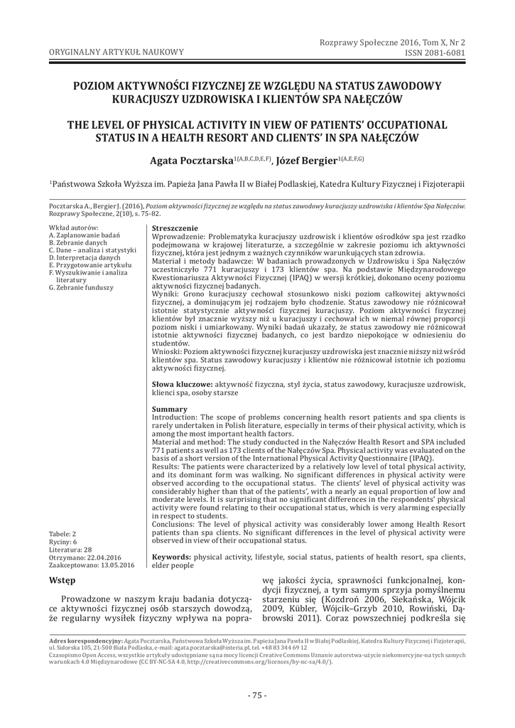 Rozprawy Społeczne 2016, Tom X, Nr 2 ISSN 2081-6081 ORYGINALNY ARTYKUŁ NAUKOWY POZIOM AKTYWNOŚCI FIZYCZNEJ ZE WZGLĘDU NA STATUS ZAWODOWY KURACJUSZY UZDROWISKA I KLIENTÓW SPA NAŁĘCZÓW THE LEVEL OF PHYSICAL ACTIVITY IN VIEW OF PATIENTS’ OCCUPATIONAL STATUS IN A HEALTH RESORT AND CLIENTS’ IN SPA NAŁĘCZÓW 1 Agata Pocztarska1(A,B,C,D,E,F), Józef Bergier1(A,E,F,G) Państwowa Szkoła Wyższa im. Papieża Jana Pawła II w Białej Podlaskiej, Katedra Kultury Fizycznej i Fizjoterapii Pocztarska A., Bergier J. (2016), Poziom aktywności fizycznej ze względu na status zawodowy kuracjuszy uzdrowiska i klientów Spa Nałęczów. Rozprawy Społeczne, 2(10), s. 75-82. Wkład autorów: A. Zaplanowanie badań B. Zebranie danych C. Dane – analiza i statystyki D. Interpretacja danych E. Przygotowanie artykułu F. Wyszukiwanie i analiza literatury G. Zebranie funduszy Streszczenie Wprowadzenie: Problematyka kuracjuszy uzdrowisk i klientów ośrodków spa jest rzadko podejmowana w krajowej literaturze, a szczególnie w zakresie poziomu ich aktywności fizycznej, która jest jednym z ważnych czynników warunkujących stan zdrowia. Materiał i metody badawcze: W badaniach prowadzonych w Uzdrowisku i Spa Nałęczów uczestniczyło 771 kuracjuszy i 173 klientów spa. Na podstawie Międzynarodowego Kwestionariusza Aktywności Fizycznej (IPAQ) w wersji krótkiej, dokonano oceny poziomu aktywności fizycznej badanych. Wyniki: Grono kuracjuszy cechował stosunkowo niski poziom całkowitej aktywności fizycznej, a dominującym jej rodzajem było chodzenie. Status zawodowy nie różnicował istotnie statystycznie aktywności fizycznej kuracjuszy. Poziom aktywności fizycznej klientów był znacznie wyższy niż u kuracjuszy i cechował ich w niemal równej proporcji poziom niski i umiarkowany. Wyniki badań ukazały, że status zawodowy nie różnicował istotnie aktywności fizycznej badanych, co jest bardzo niepokojące w odniesieniu do studentów. Wnioski: Poziom aktywności fizycznej kuracjuszy uzdrowiska jest znacznie niższy niż wśród klientów spa. Status zawodowy kuracjuszy i klientów nie różnicował istotnie ich poziomu aktywności fizycznej. Słowa kluczowe: aktywność fizyczna, styl życia, status zawodowy, kuracjusze uzdrowisk, klienci spa, osoby starsze Tabele: 2 Ryciny: 6 Literatura: 28 Otrzymano: 22.04.2016 Zaakceptowano: 13.05.2016 Wstęp Summary Introduction: The scope of problems concerning health resort patients and spa clients is rarely undertaken in Polish literature, especially in terms of their physical activity, which is among the most important health factors. Material and method: The study conducted in the Nałęczów Health Resort and SPA included 771 patients as well as 173 clients of the Nałęczów Spa. Physical activity was evaluated on the basis of a short version of the International Physical Activity Questionnaire (IPAQ). Results: The patients were characterized by a relatively low level of total physical activity, and its dominant form was walking. No significant differences in physical activity were observed according to the occupational status. The clients’ level of physical activity was considerably higher than that of the patients’, with a nearly an equal proportion of low and moderate levels. It is surprising that no significant differences in the respondents’ physical activity were found relating to their occupational status, which is very alarming especially in respect to students. Conclusions: The level of physical activity was considerably lower among Health Resort patients than spa clients. No significant differences in the level of physical activity were observed in view of their occupational status. Keywords: physical activity, lifestyle, social status, patients of health resort, spa clients, elder people Prowadzone w naszym kraju badania dotyczące aktywności fizycznej osób starszych dowodzą, że regularny wysiłek fizyczny wpływa na popra- wę jakości życia, sprawności funkcjonalnej, kondycji fizycznej, a tym samym sprzyja pomyślnemu starzeniu się (Kozdroń 2006, Siekańska, Wójcik 2009, Kübler, Wójcik–Grzyb 2010, Rowiński, Dąbrowski 2011). Coraz powszechniej podkreśla się Adres korespondencyjny: Agata Pocztarska, Państwowa Szkoła Wyższa im. Papieża Jana Pawła II w Białej Podlaskiej, Katedra Kultury Fizycznej i Fizjoterapii, ul. Sidorska 105, 21-500 Biała Podlaska, e-mail: [email protected], tel. +48 83 344 69 12 Czasopismo Open Access, wszystkie artykuły udostępniane są na mocy licencji Creative Commons Uznanie autorstwa-użycie niekomercyjne-na tych samych warunkach 4.0 Międzynarodowe (CC BY-NC-SA 4.0, http://creativecommons.org/licenses/by-nc-sa/4.0/). - 75 - Rozprawy Społeczne 2016, Tom X, Nr 2 Poziom aktywności fizycznej ze względu na status zawodowy... rolę aktywności fizycznej w każdym etapie ontogenezy człowieka. Takie badania przeprowadzono m. in. w latach 2000-2010 wśród 29 krajów Azji i Pacyfiku podkreślając znaczenie aktywności fizycznej w zapobieganiu chorób (Macniven i in. 2012). Na przykładzie badań mieszkańców Południowej Australii, zwraca się uwagę na podejmowanie mniejszej aktywności fizycznej wraz z wiekiem i na rolę spacerów jako głównej formy wysiłku fizycznego (Thomas i in. 2012). Niepokojącym jest fakt, że uczestnictwo dorosłych Polaków w rekreacji ruchowej jest znikome w porównaniu z mieszkańcami innych krajów europejskich i dotyczy zaledwie 10% dorosłych (Drygas i in. 2001, Główny Urząd Statystyczny 2009). Badania prowadzone wśród mieszkańców państw Europy wykazały najniższy poziom aktywności fizycznej wśród Polaków a najkorzystniejszy u Finów (Kałucka i in. 2002). Pocieszające jest to, że wśród osób związanych z instytucjami promującymi zdrowy styl życia – słuchacze m.in. uniwersytetów trzeciego wieku - wzrasta zainteresowanie aktywnością fizyczną (Duda 2008, Kübler, Wójcik–Grzyb 2010). Wiedza na temat promocji zdro