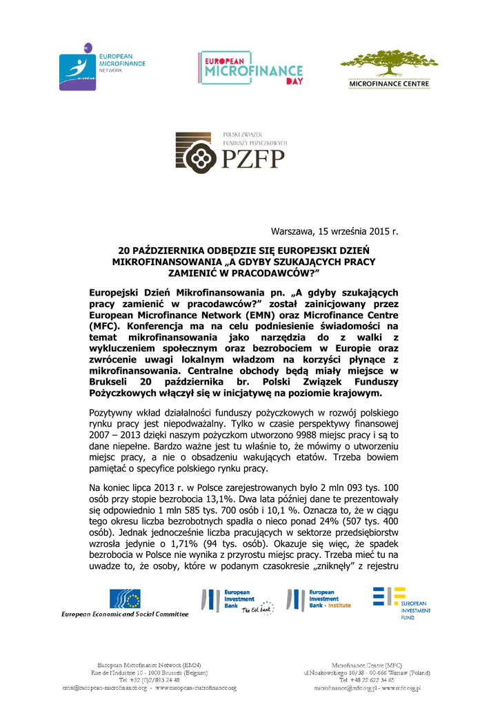 Warszawa, 15 września 2015 r. 20 PAŹDZIERNIKA ODBĘDZIE SIĘ EUROPEJSKI DZIEŃ MIKROFINANSOWANIA „A GDYBY SZUKAJĄCYCH PRACY ZAMIENIĆ W PRACODAWCÓW?” Europejski Dzień Mikrofinansowania pn. „A gdyby szukających pracy zamienić w pracodawców?” został zainicjowany przez European Microfinance Network (EMN) oraz Microfinance Centre (MFC). Konferencja ma na celu podniesienie świadomości na temat mikrofinansowania jako narzędzia do z walki z wykluczeniem społecznym oraz bezrobociem w Europie oraz zwrócenie uwagi lokalnym władzom na korzyści płynące z mikrofinansowania. Centralne obchody będą miały miejsce w Brukseli 20 października br. Polski Związek Funduszy Pożyczkowych włączył się w inicjatywę na poziomie krajowym. Pozytywny wkład działalności funduszy pożyczkowych w rozwój polskiego rynku pracy jest niepodważalny. Tylko w czasie perspektywy finansowej 2007 – 2013 dzięki naszym pożyczkom utworzono 9988 miejsc pracy i są to dane niepełne. Bardzo ważne jest tu właśnie to, że mówimy o utworzeniu miejsc pracy, a nie o obsadzeniu wakujących etatów. Trzeba bowiem pamiętać o specyfice polskiego rynku pracy. Na koniec lipca 2013 r. w Polsce zarejestrowanych było 2 mln 093 tys. 100 osób przy stopie bezrobocia 13,1%. Dwa lata później dane te prezentowały się odpowiednio 1 mln 585 tys. 700 osób i 10,1 %. Oznacza to, że w ciągu tego okresu liczba bezrobotnych spadła o nieco ponad 24% (507 tys. 400 osób). Jednak jednocześnie liczba pracujących w sektorze przedsiębiorstw wzrosła jedynie o 1,71% (94 tys. osób). Okazuje się więc, że spadek bezrobocia w Polsce nie wynika z przyrostu miejsc pracy. Trzeba mieć tu na uwadze to, że osoby, które w podanym czasokresie „zniknęły” z rejestru bezrobotnych zostały z niego wypisane przymusowo, znalazły pracę w administracji publicznej, założyły własną firmę lub po prostu wyemigrowały. Część osób z pierwszej kategorii pracuje w szarej strefie i nie płaci podatków. Emigracja to także zjawisko niekorzystne z punktu widzenia rozwoju kraju. Bez wątpienia konieczne jest więc wspieranie procesów ukierunkowanych na wzrost liczby osób pracujących lub prowadzących własną działalność gospodarczą. Może się to odbywać na dwa sposoby – stymulowanie rozwoju już istniejących firm lub pomoc w otwieraniu nowych. Jedno i drugie działanie jest dobre – tylko wtedy gdy rośnie liczba pracujących i funkcjonujących firm możemy mówić o trwałej poprawie sytuacji na rynku pracy. Jak wykazaliśmy powyżej, same, pojedyncze dane statystyczne nie odzwierciedlają rzeczywistości w jakiej funkcjonuje polski rynek pracy. Trwały i dynamiczny wzrost gospodarczy potrzebuje poprawy produktywności gospodarki. Do tego potrzebna jest nie tylko szeroko promowana (i słusznie) innowacyjność, lecz także stały wzrost liczby osób mających swój bezpośredni wkład w produkcję dób i usług, tj. przedsiębiorców i pracowników. W przypadku Polski kluczowe wydaje się zatrzymanie procesu emigracji. Opisanie działań potrzebnych do spełnienie tego postulatu wymagałoby oddzielnego opracowania. Bez wątpienia jednak jednym z potrzebnych elementów jest zapewnienie dostępu przedsiębiorcom już działającym i potencjalnym dostępu do finansowania zewnętrznego. Bez wątpienia polski sektor mikrofinansowy wspiera polski rynek pracy w taki sposób, który daje najlepsze ekonomicznie efekty. Dzięki funduszom pożyczkowym tylko w 7 lat powstało prawie 10 tys. miejsc pracy, a trzeba pamiętać o tym, że działamy na rzecz rozwoju przedsiębiorczości już ponad 20 lat. Tylko w latach 2010 – 2014 sfinansowaliśmy start ponad 11 tys. nowych firm. Możemy więc z pełnym przekonaniem powiedzieć, że nasza działalność pomaga walczyć z wykluczeniem społecznym i bezrobociem. Polski Związek Funduszy Pożyczkowych zwraca także uwagę na to, że powyższe opiera się w oparciu o dostarczanie kapitału niskooprocentowanego, na jasnych zasadach oraz ze wsparciem szkoleniowym. Nasze badania pokazują to, że z każdym rokiem fundusze pożyczkowe są coraz ważniejszym uczestnikiem rynku finansowego. Co ważne uczestnikiem transparentnym i godnym zaufania. ************* Polski Związek Funduszy Pożyczkowych reprezentuje na szczeblu ogólnokrajowym interesy funduszy pożyczkowych z całej Polski, wspierając ich działania w celu rozwoju regionów i sektora mikro, małych i średnich przedsiębiorstw. Jednym z naszych podstawowych celów statutowych jest także podejmowanie i wspieranie działań na rzecz rozwoju polskiej gospodarki. PZFP został zarejestrowany w 2010 r. w miejsce Polskiego Stowarzyszenia Funduszy Pożyczkowych które w 2002 roku zostało powołane przez reprezentantów pięćdziesięciu Funduszy Pożyczkowych z całej Polski, działających jako organizacje pozarządowe o charakterze nonprofit. Naszym celem jest tworzenie i rozwój silnego i niezależnego systemu funduszy pożyczkowych w Polsce, umożliwiającego efektywne finansowanie startu i rozwoju mikro, małych i średnich przedsiębiorstw. European Microfinance Network to europejska organizacja zajmująca się promocją mikrofinansowania w Unii Europejskiej, wspieraniem walki z wykluczeniem społecznym i finansowym. ESM działa w zakresie wspierania mikroprzedsiębiorstw i samozatrudnienia, poprzez swoich członków, w lobbingu na poziomie UE oraz w podnoszeniu świadomości o potrzebie budowania europejskich ram legislacyjnych i regulacyjnych, które będą wspierać rynek mikrofinansowy. Microfinance Centre jest regionalnym centrum mikrofinansowania. Łączy 104 organizacje w 32 krajach Europy Środkowej i Azji. Misją Organizacji jest przyczynianie się do zmniejszania ubóstwa i rozwoju potencjału ludzkiego poprzez promowanie i zrównoważonego sektora mikrofinansowania, który zapewnia odpowiednie usługi dla mikroprzedsiębiorców.