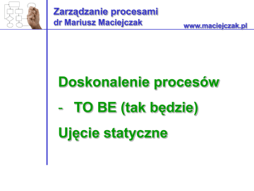Zarządzanie procesami dr Mariusz Maciejczak www.maciejczak.pl Doskonalenie procesów - TO BE (tak będzie) Ujęcie statyczne Modelowanie procesów biznesowych Modelowanie procesów biznesowych (ang. business process modeling) – jest to zbiór czynności wykonywanych przez analityków procesów biznesowych w przedsiębiorstwie. Modelowanie procesów ma na celu ustalenie w jaki sposób działa dana organizacja (tak zwany stan AS-IS) i może służyć do określenia docelowego sposobu postępowania (procesy TO-BE). Przykład analizy AS IS i TO BE Podczas wizyty w hotelu, musiałem wypożyczyć żelazko. Udałem się do recepcji. Pytam, czy jest taka możliwość? Padła odpowiedź, że tak, ale trzeba zapłacić depozyt. Powiedziałem ok. Jak się okazało, najpierw trzeba było zapłacić, podać numer pokoju, poczekać na odnotowanie w papierach wypożyczenia żelazka, założenie oznaczenia na żelazku Potem przy zwrocie żelazka trzeba było złożyć podpis, że nastąpił zwrot depozytu i żelazka. Natomiast przy oddawaniu klucza sprawdzają czy nastąpiło rozliczenie pokoju. Dlaczego wypożyczenia żelazka i jego zwrotu nie odnotują w systemie? Podczas wymeldowania, można byłoby sprawdzić czy nastąpił zwrot żelazka. Doskonalenie procesów Trzy poziomy doskonalenia procesów: 1. Doskonalenie (incremental improvement) - zmiana pojedynczych działań w ramach ustalonego procesu 2. Przeprojektowywanie (redesign) – zmiana procesu 3. Transformacja (rethink) – zmiana architektury proesów Przeprojektowanie 1.Dlaczego dany krok jest ważny dla procesu? 2.Co się stanie jeżeli nie wykonamy danego kroku? 3.Czy miałoby sens, gdyby inny uczestnik procesu go wykonał? 4.Czy istnieją procedury lub regulacje, których wymaga dany krok do wypełnienia przez tego uczestnika? 5.Jeżeli procedury decydują o pełnym wykonaniu kroku, czy mogą zostać zmodyfikowane? 6.Jeżeli krok zostanie zautomatyzowany, co jeszcze musi zostać wykonane, aby mieć pewność, że krok jest poprawnie zakończony? Przypadek: Zakup na kredyt kupiecki W firmie rodzinnej produkującej komputery w roku sprzedano 1.100 komputerów. Jeden klient zgłosił się z zamówieniem, chcąc kupić jednorazowo 100 komputerów (jednostka+peryferia) klasy A na tzw. kredyt kupiecki, tzn. z odroczonym terminem płatności (w tym wypadku o 60 dni). Pozostałe komputery, o nieco gorszych parametrach, tzw. klasy B, zamówiło 5 klientów, również korzystając z opcji kredytu kupieckiego. Przy każdorazowym zamówieniu w firmie mają miejsce następujące czynności: 1. Dział sprzedaży przyjmuje i kompletuje zamówienie (1godz), po określeniu jego treści przekazuje do Działu kredytów i fakturowania (KiF). 2. Dział kredytów i fakturowania przyjmuje zamówienie i wprowadza je do systemu komputerowego (5 min), a następnie sprawdza "zdolność kredytową" odbiorcy (5 min). – Jeśli dział KiF nie może określić, że klient jest wiarygodny (90% przypadków) to dokumenty przekazywane są do działu Sprzedaży, który sprawdza wiarygodność klienta (zajmuje mu to od 0 do 4 godz. pracy, ale czeka łącznie do 14 godz. na działania klienta i instytucji finansowych) – Jeśli weryfikacja w dziale Sprzedaży jest negatywna zamówienie (20% przypadków) jest wstrzymywane, a klient jest informowany o wstrzymaniu realizacji zamówienia i jego przyczynach. – Jeśli weryfikacja jest pozytywna dokumenty z odpowiednią adnotacją wracają do działu kredytu i fakturowania 3. Jeśli klient jest wiarygodny przechodzi się do fazy realizacji. Przebiega ona dwutorowo. – Produkcja i wysyłka produktu – Przygotowanie i wysyłka faktury 4. Produkcja i wysyłka produktu: – Dział kontroli produkcji wprowadza zamówienie do realizacji (5 min) – Następnie sprawdza, czy zamówiony produkt jest w magazynie. – Jeśli produktu nie ma (80% przypadków), planowana jest produkcja. – Zamówienie przekazywane jest do działu produkcji gdzie wykonuje się produkt. (1 godz.) – Gotowy produkt przekazuje się do działu pakowania i wysyłki, gdzie jest pakowany (3 min) – Po wyprodukowaniu produktu lub jeśli produkt jest w magazynie przygotowywane jest Zlecenie wysyłki (5 min) – Produkt wysyłany jest do klienta 5. Przygotowanie i wysyłka faktury – Dział kredytu i fakturowania przygotowuje fakturę (5 min) – Po otrzymaniu informacji z działu pakowania i wysyłki, że towar jest wysłany wysyłana jest faktura (4 min). Zadanie • W grupach 2 osobowych: – zidentyfikuj działania do doskonalenia – Narysuj udoskonaloną mapę procesów – Zweryfikuj prace innej grupy i przedyskutuj wasze pomysły Zadanie domowe Narysuj udoskonaloną mapę procesów Literatura uzupełniająca • Brad Power, Kiedy doskonalenie procesu jest istotne z punktu widzenia strategii? Harvard Business Review Polska • Waldemar Bojar, Jan Leszczyński, 2013: Doskonalenie procesów logistycznych w wybranym przedsiębiorstwie (studium przypadku). Polskie Towarzystwo Zarządzania Produkcją, Konferencja Innowacje w Zarządzaniu i Inżynierii Produkcji, Zakopane 2013 Dziękuję za uwagę