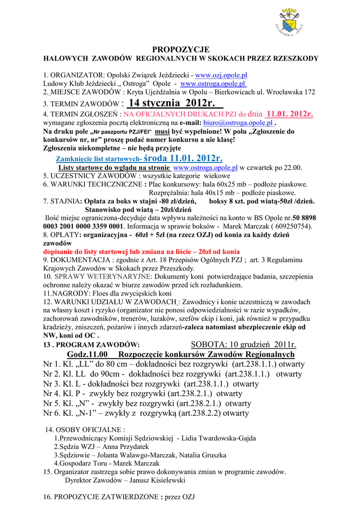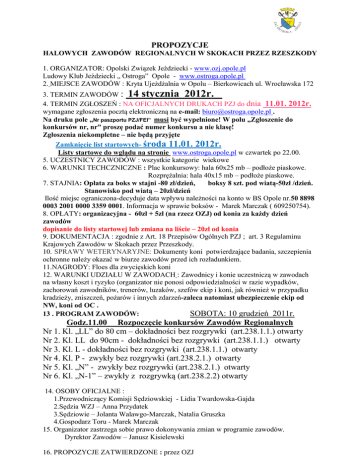 PROPOZYCJE HALOWYCH ZAWODÓW REGIONALNYCH W SKOKACH PRZEZ RZESZKODY 1. ORGANIZATOR: Opolski Związek Jeździecki - www.ozj.opole.pl Ludowy Klub Jeździecki „ Ostroga” Opole - www.ostroga.opole.pl 2. MIEJSCE ZAWODÓW : Kryta Ujeżdżalnia w Opolu – Bierkowicach ul. Wrocławska 172 3. TERMIN ZAWODÓW : 14 stycznia 2012r. 4. TERMIN ZGŁOSZEŃ : NA OFICJALNYCH DRUKACH PZJ do dnia 11.01. 2012r. wymagane zgłoszenia pocztą elektroniczną na e-mail: [email protected] . Na druku pole „Nr paszportu PZJ/FEI” musi być wypełnione! W polu „Zgłoszenie do konkursów nr, nr” proszę podać numer konkursu a nie klasę! Zgłoszenia niekompletne – nie będą przyjęte Zamknięcie list startowych- środa 11.01. 2012r. Listy startowe do wglądu na stronie www.ostroga.opole.pl w czwartek po 22.00. 5. UCZESTNICY ZAWODÓW : wszystkie kategorie wiekowe 6. WARUNKI TECHCZNICZNE : Plac konkursowy: hala 60x25 mb – podłoże piaskowe. Rozprężalnia: hala 40x15 mb – podłoże piaskowe. 7. STAJNIA: Opłata za boks w stajni -80 zł/dzień, boksy 8 szt. pod wiatą-50zł /dzień. Stanowisko pod wiatą – 20zł/dzień Ilość miejsc ograniczona-decyduje data wpływu należności na konto w BS Opole nr.50 8898 0003 2001 0000 3359 0001. Informacja w sprawie boksów - Marek Marczak ( 609250754). 8. OPŁATY: organizacyjna - 60zł + 5zł (na rzecz OZJ) od konia za każdy dzień zawodów dopisanie do listy startowej lub zmiana na liście – 20zł od konia 9. DOKUMENTACJA : zgodnie z Art. 18 Przepisów Ogólnych PZJ ; art. 3 Regulaminu Krajowych Zawodów w Skokach przez Przeszkody. 10. SPRAWY WETERYNARYJNE: Dokumenty koni potwierdzające badania, szczepienia ochronne należy okazać w biurze zawodów przed ich rozładunkiem. 11.NAGRODY: Floes dla zwycięskich koni 12. WARUNKI UDZIAŁU W ZAWODACH : Zawodnicy i konie uczestniczą w zawodach na własny koszt i ryzyko (organizator nie ponosi odpowiedzialności w razie wypadków, zachorowań zawodników, trenerów, luzaków, szefów ekip i koni, jak również w przypadku kradzieży, zniszczeń, pożarów i innych zdarzeń-zaleca natomiast ubezpieczenie ekip od NW, koni od OC . 13 . PROGRAM ZAWODÓW: SOBOTA: 10 grudzień 2011r. Godz.11.00 Rozpoczęcie konkursów Zawodów Regionalnych Nr 1. Kl. „LL” do 80 cm – dokładności bez rozgrywki (art.238.1.1.) otwarty Nr 2. Kl. LL do 90cm - dokładności bez rozgrywki (art.238.1.1.) otwarty Nr 3. Kl. L - dokładności bez rozgrywki (art.238.1.1.) otwarty Nr 4. Kl. P - zwykły bez rozgrywki (art.238.2.1.) otwarty Nr 5. Kl. „N” - zwykły bez rozgrywki (art.238.2.1.) otwarty Nr 6. Kl. „N-1” – zwykły z rozgrywką (art.238.2.2) otwarty 14. OSOBY OFICJALNE : 1.Przewodniczący Komisji Sędziowskiej - Lidia Twardowska-Gajda 2.Sędzia WZJ – Anna Przydatek 3.Sędziowie – Jolanta Walawgo-Marczak, Natalia Gruszka 4.Gospodarz Toru - Marek Marczak 15. Organizator zastrzega sobie prawo dokonywania zmian w programie zawodów. Dyrektor Zawodów – Janusz Kisielewski 16. PROPOZYCJE ZATWIERDZONE : przez OZJ 17. KODEKS POSTĘPOWANIA Z KONIEM: Polski Związek Jeździecki prosi wszystkie osoby zaangażowane w jakikolwiek sposób w sporty konne, o przestrzeganie poniżej przedstawionego kodeksu oraz zasady, że dobro konia jest najważniejsze. Dobro konia musi być zawsze i wszędzie uwzględniane w sportach konnych i nie może być podporządkowane współzawodnictwu sportowemu ani innym celom np. komercyjnym. I. Na wszystkich etapach treningu i przygotowań konia do startu w zawodach, dobro konia musi stać ponad wszelkimi innymi wymaganiami. Dotyczy to stałej opieki, metod treningu, starannego obrządku, kucia i transportu. II. Konie i jeźdźcy muszą być wytrenowani, kompetentni i zdrowi zanim wezmą udział w zawodach. Odnosi się to także do podawania leków i środków medycznych, zabiegów chirurgicznych zagrażających dobru konia lub ciąży klaczy, oraz do przypadków nadużywania pomocy. III. Zawody nie mogą zagrażać dobru konia. Wymaga to zwrócenia szczególnej uwagi na teren zawodów, powierzchnię podłoża, pogodę, warunki stajenne , kondycję koni i ich bezpieczeństwo także podczas podróży powrotnej z zawodów. IV. Należy dołożyć wszelkich starań, aby zapewnić koniom staranną opiekę po zakończeniu zawodów, a także humanitarne traktowanie po zakończeniu kariery sportowej. Dotyczy to właściwej opieki weterynaryjnej obrażeń odniesionych na zawodach, spokojnej starości, ewentualnie eutanazji. V. PZJ zachęca wszystkie osoby działające w sporcie jeździeckim do stałego podnoszenia swojej wiedzy oraz umiejętności dotyczących wszelkich aspektów współpracy z koniem. Opracował: Marek Marczak