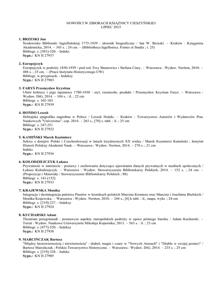 NOWOŚCI W ZBIORACH KSIĄŻNICY CIESZYŃSKIEJ LIPIEC 2015 1. BRZESKI Jan Środowisko Biblioteki Jagiellońskiej 1775-1939 : słownik biograficzny / Jan W. Brzeski. - Kraków : Księgarnia Akademicka, 2014. - 343 s. ; 24 cm. - (Bibliotheca Iagellonica. Fontes et Studia ; t. 25) Bibliogr. s. [301]-320. - Indeks Sygn.: KN II 27937 2. Europejczyk Europejczyk w podróży 1850-1939 / pod red. Ewy Ihnatowicz i Stefana Ciary. - Warszawa : Wydaw. Neriton, 2010. 488 s. ; 25 cm. - (Prace Instytutu Historycznego UW) Bibliogr. w przypisach. - Indeksy Sygn.: KN II 27903 3. FARYŚ Przemysław Krystian Ubiór kobiecy i jego tajemnice 1780-1930 : styl, rzemiosło, produkt / Przemysław Krystian Faryś. - Warszawa : Wydaw. DiG, 2014. - 104 s. : il. ; 22 cm Bibliogr. s. 102-103 Sygn.: KN II 27939 4. HOŃDO Leszek Hebrajska epigrafika nagrobna w Polsce / Leszek Hońdo. - Kraków : Towarzystwo Autorów i Wydawców Prac Naukowych "Universitas", cop. 2014. - 263 s., [70] s. tabl. : il. ; 25 cm Bibliogr. s. 247-251 Sygn.: KN II 27922 5. KAMIŃSKI Marek Kazimierz Szkice z dziejów Polski i Czechosłowacji w latach trzydziestych XX wieku / Marek Kazimierz Kamiński ; Instytut Historii Polskiej Akademii Nauk. - Warszawa : Wydaw. Neriton, 2014. - 278 s. ; 21 cm Indeks Sygn.: KN II 27936 6. KOŁODZIEJCZYK Łukasz Prywatność w internecie : postawy i zachowania dotyczące ujawniania danych prywatnych w mediach społecznych / Łukasz Kołodziejczyk. - Warszawa : Wydaw. Stowarzyszenia Bibliotekarzy Polskich, 2014. - 152 s. ; 24 cm. (Propozycje i Materiały / Stowarzyszenie Bibliotekarzy Polskich ; 88) Bibliogr. s. 141-[152] Sygn.: KN II 27933 7. KRAJEWSKA Monika Integracja i dezintegracja państwa Piastów w kronikach polskich Marcina Kromera oraz Marcina i Joachima Bielskich / Monika Krajewska. - Warszawa : Wydaw. Neriton, 2010. - 244 s., [8] k tabl. : il., mapa, wykr. ; 24 cm Bibliogr. s. [219]-227. - Indeksy Sygn.: KN II 27924 8. KUCHARSKI Adam Theatrum peregrinandi : poznawcze aspekty staropolskich podróży w epoce późnego baroku / Adam Kucharski. Toruń : Wydaw. Naukowe Uniwersytetu Mikołaja Kopernika, 2013. - 563 s. : il. ; 23 cm Bibliogr. s. [477]-520. - Indeksy Sygn.: KN II 27938 9. MARCIŃCZAK Bartosz "Między łacnowiernością i niewiernością" : diabeł, magia i czary w "Nowych Atenach" i "Diable w swojej postaci" / Bartosz Marcińczak ; Polskie Towarzystwo Historyczne. - Warszawa : Wydaw. DiG, 2014. - 235 s. ; 25 cm Bibliogr. s. [219]-228. - Indeks Sygn.: KN II 27905 10. "Nie "Nie należy dopuszczać do publikacji" : cenzura w PRL : zbiór studiów / pod red. Grażyny Gzelli i Jacka Gzelli. Toruń : Wydaw. Naukowe Uniwersytetu Mikołaja Kopernika, 2013. - 258 s. : il. ; 24 cm Sygn.: KN II 27930 11. NOWAK Janusz Tadeusz Szlak bojowy Legionów Polskich : wydanie pamiątkowe z okazji 100. rocznicy wymarszu I Kompanii Kadrowej 19142014 / Janusz Tadeusz Nowak. - Kraków : Wydaw. M, cop. 2014. - 201 s. : il. ; 25 cm Bibliogr. s. 189-[192] Sygn.: KN II 27897 12. Oblicza Oblicza współczesnej bibliologii : konteksty i transgresje / red. nauk. Grzegorz Czapnik, Zbigniew Gruszka, Jacek Ladorucki. - Łódź : Wydaw. Uniwersytetu Łódzkiego ; Warszawa : Stowarzyszenie Bibliotekarzy Polskich, 2014. 472 s. : il. ; 25 cm. - (Nauka, Dydaktyka, Praktyka ; 151) Tyt. równol. w jęz. ang. Bibliogr. s. 273-[289]. - Indeks Sygn.: KN II 27931 13. Śpiewnik Śpiewnik karpacki / koncepcja, wybór pieśni, komentarze i oprac. całości Władysław Motyka ; oprac. muz. Czesław Węglarz [i in.]. - Milówka : Beskidzkie Towarzystwo Oświatowe, 2013. - 552 s., [8] s. tabl. : il., nuty ; 22 cm Sygn.: KN II 27908 14. WOJCIECHOWSKI Jacek Biblioteki w nowym otoczeniu / Jacek Wojciechowski ; Stowarzyszenie Bibliotekarzy Polskich. - Warszawa : Wydaw. SBP, 2014. - 303 s. ; 25 cm. - (Nauka, Dydaktyka, Praktyka ; 153) Tyt. równol. w jęz. ang. Bibliogr. s. 273-[289]. - Indeks Sygn.: KN II 27921 15. WÓJCICKA Marta Pamięć zbiorowa a tekst ustny / Marta Wójcicka. - Lublin : Wydaw. Uniwersytetu Marii Curie-Skłodowskiej, 2014. 366 s. ; 24 cm Bibliogr. s. [325]-337. - Indeks Sygn.: KN II 27932 16. WYSOCKI Wiesław Jan Legiony Polskie 1914-1918 / Wiesław Wysocki, Wiktor Cygan, Jan Józef Kasprzyk. - Warszawa : Oficyna Wydawnicza Volumen : Rada Ochrony Pamięci Walk i Męczeństwa ; Katowice : Stowarzyszenie Pokolenie, cop. 2014. - 863 s. : il. ; 30 cm Indeks Sygn.: KN III 27928 17. ZENDEROWSKI Radosław Kwestie narodowościowe w Europie Środkowo-Wschodniej / Radosław Zenderowski, Jakub Pieńkowski ; Instytut Politologii Uniwersytetu Kardynała Stefana Wyszyńskiego w Warszawie. T. 1 : Zagadnienia teoretyczne. - Warszawa : Dom Wydawniczy "Elipsa", 2014. - 227 s. ; 24 cm Bibliogr. s. [217]-227 Sygn.: KN II 27927/01 -2-