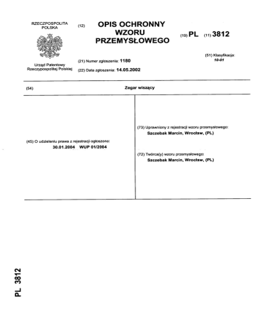 (12) OPI S OCHRONN Y WZORU PRZEMYSŁOWEGO (19) PL (11) 381 2 (51) Klasyfikacja: 10-01 (21) Numer zgłoszenia: 1 1 8 0 (22) Data zgłoszenia: 1 4 . 0 5 . 2 0 0 2 (54) Zega r wisząc y (73) Uprawniony z rejestracji wzoru przemysłowego : Szczebak Marcin , Wrocław , (PL ) (45) O udzieleniu prawa z rejestracji ogłoszono: 30.01.2004 WU P 01/200 4 (72) Twórca(y) wzoru przemysłowego : Szczebak Marcin , Wrocław , (PL ) Zegar wisząc y Przedmiotem wzoru przemysłowego jest zegar wiszący przeznaczony w szczególności jako element wyposażenia pomieszczeń określonych firm, stanowiąc jednocześnie element promocji produktów i usług danej firmy. W porównaniu do znanych i używanych zegarów wiszących utworzenie tarczy zegara z tworzywa sztucznego imitującego odcinek perforowanej blachy chromoniklowej, przy jednoczesnym osłonięciu wskazówek zegara bezbarwną płytę osłonową usytuowaną na dystans od tarczy zegara i osadzenie na tarczy zegara dwóch drewnianych listew wzdłuż i obok pionowych boków osłonowej płyty pozwoliło stworzyć estetyczny, prosty w budowie produkt, wyraziście odróżniający się od rynkowych produktów. Zestawienie pionowych, drewnianych listew, korzystnie chromoniklowej blachy pozwala na stworzenie swoistej „linii zdobniczej" w wyposażeniu pomieszczeń, służące określonym celom marketingowym. Umieszczenie logo określonej firmy w obszarze wyznaczonym perforacją tarczy zegara pozwala na uzyskanie dodatkowych efektów reklamowych. Przedmiot wzoru przemysłowego jest przedstawiony na załączonym rysunku, na którym fig. 1 przedstawia go w widoku aksonometrycznym, z odsuniętymi poszczególnymi częściami, zaś fig. 2 przedstawia w stanie złożenia z zaznaczeniem innego możliwego miejsca usytuowanie logo firmy na tarczy zegara. Zegar wiszący zgłaszany do rejestracji ma tarczę T zegara w kolorze chromoniklowej blachy z perforacją, utworzoną z tworzywa sztucznego, w której centralnie jest osadzony mechanizm M Z zegara. Od czoła tarcza T jest osłonięta bezbarwną, osłonową płytą P O połączoną śrubami S przechodzącymi przez maskującą płytę PM . tarczę T zegara, dystansowe tuleje D usytuowane między tarczą T zegara a osłonowa płytę P O i wkręcanymi w ozdobne nakrętki N wpuszczane w osłonową płytę PO . Od czoła, na tarczy T zegara z obu stron pionowych krawędzi osłonowej płyty PO . są osadzone ozdobne, drewniane listwy Li i L2 z odsłoniętymi słojami drzewa. Listwy Li i L2 są mocowane za pomocą wkrętów W przechodzących przez dystansowe klocki K , maskującą płytę P M i tarczę T zegara. Obszar tarczy T zegara bez perforacji wyznacza powierzchnię mocowania listew Lj i L2 oraz obszar usytuowania logo firmy. Obszarem tym może być część centralna G j tarczy T zegara zaznaczona na fig. 1 lub część narożna G2 zaznaczona na fig. 2. Cechy istotne wzoru przemysłowego Zegar wiszący według wzoru przemysłowego ma tarczę (T ) zegara utworzoną z tworzywa w kolorze imitującym chromoniklową blachę, przy czym ta tarcza (T ) zegara ma utworzoną perforację i jest od czoła osłonięta bezbarwną, osłonową płytą (PO ) usytuowaną na dystans względem tarczy (T) , natomiast wzdłuż i obok pionowych boków osłonowej płyty (PO ) są osadzone na tarczy (T ) zegara drewniane listwy (Li i L2) z odsłoniętymi słojami drewna.