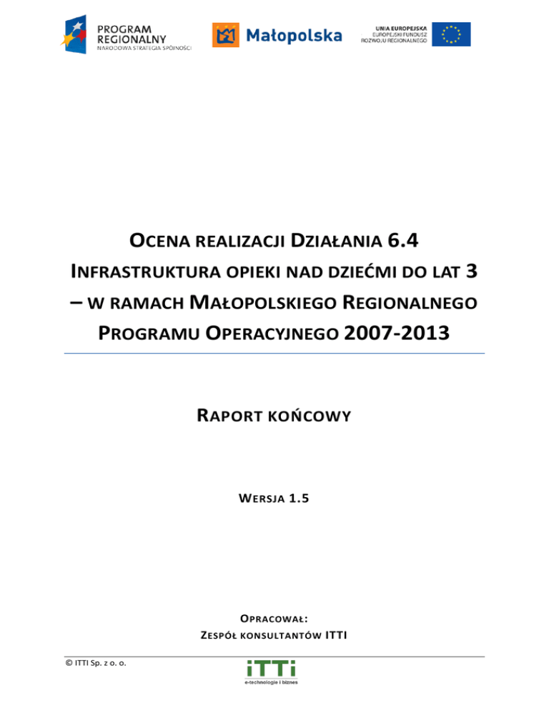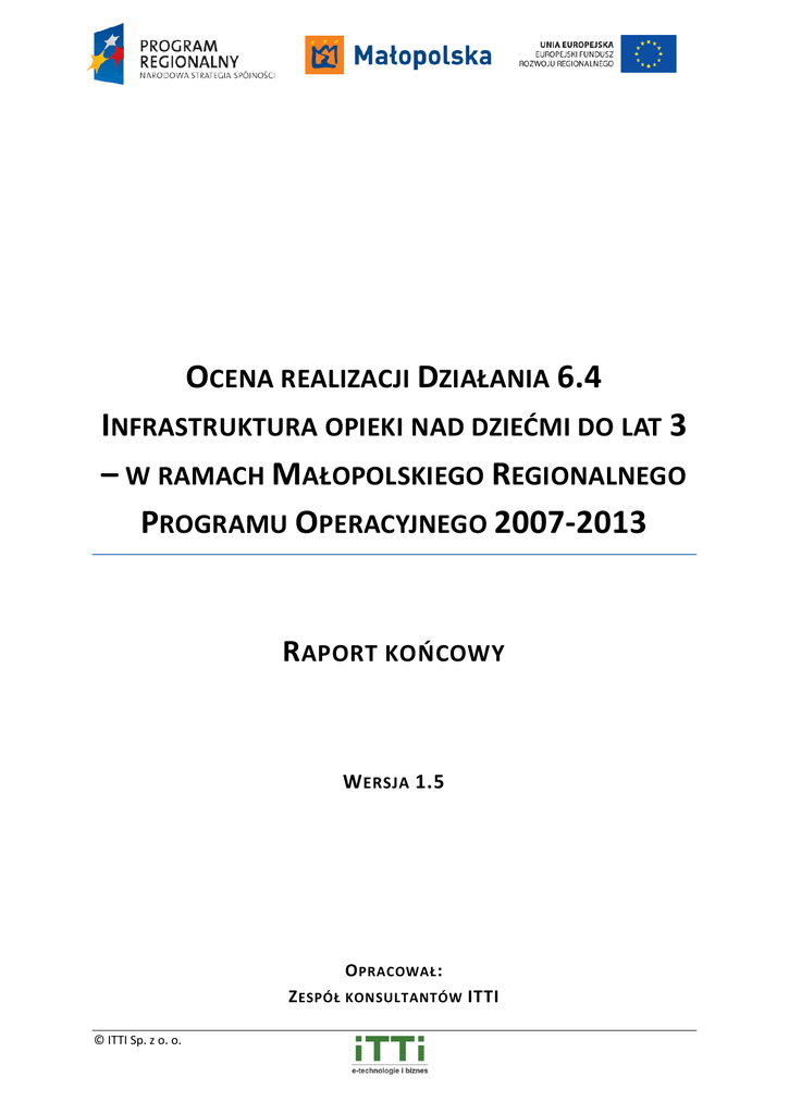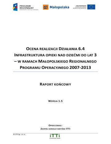 OCENA REALIZACJI DZIAŁANIA 6.4 INFRASTRUKTURA OPIEKI NAD DZIEĆMI DO LAT 3 – W RAMACH MAŁOPOLSKIEGO REGIONALNEGO PROGRAMU OPERACYJNEGO 2007-2013 R APORT KOŃCOWY W ERSJA 1.5 O PRACOWAŁ : Z ESPÓŁ KONSULTANTÓW ITTI © ITTI Sp. z o. o. Spis treści 1. 2. Streszczenie raportu ........................................................................................................... 3 1.1. Wersja polska............................................................................................................... 3 1.2. Wersja angielska .......................................................................................................... 5 Wprowadzenie ................................................................................................................... 8 2.1. Cel badania .................................................................................................................. 8 2.2. Istotne okoliczności towarzyszące badaniu ................................................................. 8 3. Narzędzia i techniki badawcze ......................................................................................... 10 4. Wyniki badania ................................................................................................................. 11 4.1. Wyniki badania metodą gabinetową - desk research ............................................... 11 4.2. Wyniki badania metodą Telefonicznego Wywiadu Pogłębionego (ITI) ..................... 15 4.2.1. Uczestnicy szkolenia zorganizowanego w ramach Działania 6.4 ....................... 15 4.2.2. Przedsiębiorcy .................................................................................................... 19 4.2.3. Osoby prowadzące żłobki ................................................................................... 23 4.2.4. Osoby prowadzące przedszkola ......................................................................... 26 4.2.5. Osoby prowadzące inną działalność związaną z zapewnieniem opieki nad dziećmi w wieku 0-6 lat .................................................................................................... 30 5. 4.3. Wyniki badania metodą Indywidualnego Wywiadu Pogłębionego (IDI) ................... 32 4.4. Wyniki badania z wykorzystaniem ankiet internetowych CAWI ............................... 35 4.5. Wyniki badania w ramach Panelu ekspertów ........................................................... 42 Wnioski i rekomendacje ................................................................................................... 50 5.1. 6. Tabela wniosków i rekomendacji .............................................................................. 54 Spis rysunków, tabel oraz wykresów ............................................................................... 57 6.1. Rysunki ....................................................................................................................... 57 6.2. Tabele ........................................................................................................................ 57 6.3. Wykresy ..................................................................................................................... 57 © ITTI Sp. z o. o. Strona 2 1. STRESZCZENIE RAPORTU 1.1. Wersja polska Województwo małopolskie ma wyższy od średniej krajowej poziom przyrostu naturalnego. Dane z 2012 roku wskazują, że Małopolska liczy 3346796 mieszkańców, z czego 256456 (7,7%), to dzieci w wieku 0-6 lat. W ciągu ostatnich kilku lat, można zaobserwować regularny wzrost liczby dzieci uczęszczających do żłobków i przedszkoli; od roku 2007 do 2011 liczba dzieci korzystających z tych placówek wzrosła o 10 punktów procentowych. Na popularność żłobków i przedszkoli ma wpływ miejsce zamieszkania rodziców dzieci – ogólnie mówiąc, największą popularnością cieszą się one w dużych miastach (im większe miasto, tym większa popularność korzystania z tych placówek). Najwięcej miejsc w placówkach zapewniających opiekę nad dziećmi do lat 3, w przeliczeniu na 1000 dzieci, oferowały największe miasta w kraju, w tym Kraków. Jednak na pozostałym obszarze województwa małopolskiego, liczba tego typu przedsiębiorstw jest dość niska. W zdecydowanej części regionu przeważa sytuacja, w której na 1000 dzieci dostępnych jest tylko od 4 do 15 miejsc. Podobnie jak w pozostałej części kraju, w Małopolsce co roku obserwuje się niedobór miejsc w żłobkach i przedszkolach. Pomimo danych mówiących o dużym popycie na usługi związane z zapewnieniem opieki nad dziećmi, liczba przedsiębiorców decydujących się na otwarcie takiej działalności jest niewielka. W ramach Małopolskiego Regionalnego Operacyjnego na lata 2007-2013, Województwo Małopolskie oferuje możliwość uzyskania wsparcia – dofinansowania dla osób, chcących inwestować w infrastrukturę opieki nad dziećmi do lat 3 (Działanie 6.4). Wysokość środków przeznaczonych na dofinansowanie Działania 6.4 – Infrastruktura opieki nad dziećmi do lat 3 w województwie małopolskim wynosi 11 086 182,93 PLN. Wsparciem obejmowane mogą być te projekty, które mają na celu budowę, przebudowę, rozbudowę oraz modernizację obiektów przeznaczonych do świadczenia usług opieki nad dziećmi do lat 3 i/lub zakup wyposażenia ww. obiektów. Minimalna kwota, o jaką można się ubiegać, wynosi 100 tys. złotych, natomiast maksymalna kwota dofinansowania to 800 tys. złotych. Dofinansowanie może wynosić maksymalnie 60% wydatków kwalifikowanych. Na dzień 10 maja 2013 roku, o środki w ramach Działania 6.4 aplikowało łącznie 5 podmiotów, z czego 1 wniosek o przyznanie dofinansowania je uzyskał, 1 wniosek został odrzucony, a pozostałe 3, w czasie powstawania niniejszego raportu, były w fazie rozpatrywania. © ITTI Sp. z o. o. Strona 3 Poszukując przyczyn tak niskiego zainteresowania potencjalnych beneficjentów pozysk