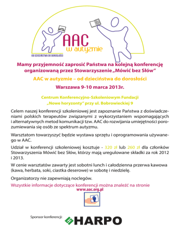 od dzieciństwa do dorosłości Mamy przyjemność zaprosić Państwa na kolejną konferencję organizowaną przez Stowarzyszenie „Mówić bez Słów” AAC w autyzmie – od dzieciństwa do dorosłości Warszawa 9-10 marca 2013r. Centrum Konferencyjno-Szkoleniowym Fundacji „Nowe horyzonty” przy ul. Bobrowieckiej 9 Celem naszej konferencji szkoleniowej jest zapoznanie Państwa z doświadczeniami polskich terapeutów związanymi z wykorzystaniem wspomagających i alternatywnych metod komunikacji tzw. AAC do rozwijania umiejętności porozumiewania się osób ze spektrum autyzmu. Warsztatom towarzyszyć będzie wystawa sprzętu i oprogramowania używanego w AAC. Udział w konferencji szkoleniowej kosztuje - 320 zł lub 260 zł dla członków Stowarzyszenia Mówić bez Słów, którzy mają uregulowane składki za rok 2012 i 2013. W cenie warsztatów zawarty jest sobotni lunch i całodzienna przerwa kawowa (kawa, herbata, soki, ciastka deserowe) w sobotę i niedzielę. Organizatorzy nie zapewniają noclegów. Wszystkie informacje dotyczące konferencji można znaleźć na stronie www.aac.org.pl Sponsor konferencji: HARPO
