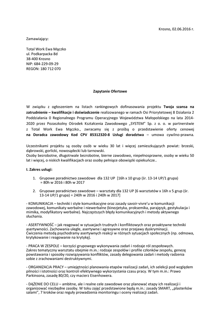Krosno, 02.06.2016 r. Zamawiający: Total Work Ewa Mączko ul