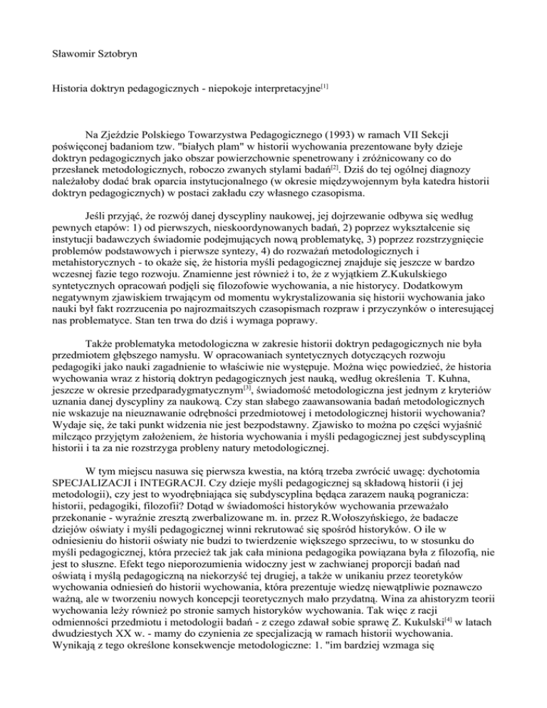 Sławomir Sztobryn Historia doktryn pedagogicznych - niepokoje interpretacyjne[1] Na Zjeździe Polskiego Towarzystwa Pedagogicznego (1993) w ramach VII Sekcji poświęconej badaniom tzw. "białych plam" w historii wychowania prezentowane były dzieje doktryn pedagogicznych jako obszar powierzchownie spenetrowany i zróżnicowany co do przesłanek metodologicznych, roboczo zwanych stylami badań[2]. Dziś do tej ogólnej diagnozy należałoby dodać brak oparcia instytucjonalnego (w okresie międzywojennym była katedra historii doktryn pedagogicznych) w postaci zakładu czy własnego czasopisma. Jeśli przyjąć, że rozwój danej dyscypliny naukowej, jej dojrzewanie odbywa się według pewnych etapów: 1) od pierwszych, nieskoordynowanych badań, 2) poprzez wykształcenie się instytucji badawczych świadomie podejmujących nową problematykę, 3) poprzez rozstrzygnięcie problemów podstawowych i pierwsze syntezy, 4) do rozważań metodologicznych i metahistorycznych - to okaże się, że historia myśli pedagogicznej znajduje się jeszcze w bardzo wczesnej fazie tego rozwoju. Znamienne jest również i to, że z wyjątkiem Z.Kukulskiego syntetycznych opracowań podjęli się filozofowie wychowania, a nie historycy. Dodatkowym negatywnym zjawiskiem trwającym od momentu wykrystalizowania się historii wychowania jako nauki był fakt rozrzucenia po najrozmaitszych czasopismach rozpraw i przyczynków o interesującej nas problematyce. Stan ten trwa do dziś i wymaga poprawy. Także problematyka metodologiczna w zakresie historii doktryn pedagogicznych nie była przedmiotem głębszego namysłu. W opracowaniach syntetycznych dotyczących rozwoju pedagogiki jako nauki zagadnienie to właściwie nie występuje. Można więc powiedzieć, że historia wychowania wraz z historią doktryn pedagogicznych jest nauką, według określenia T. Kuhna, jeszcze w okresie przedparadygmatycznym[3], świadomość metodologiczna jest jednym z kryteriów uznania danej dyscypliny za naukową. Czy stan słabego zaawansowania badań metodologicznych nie wskazuje na nieuznawanie odrębności przedmiotowej i metodologicznej historii wychowania? Wydaje się, że taki punkt widzenia nie jest bezpodstawny. Zjawisko to można po części wyjaśnić milcząco przyjętym założeniem, że historia wychowania i myśli pedagogicznej jest subdyscypliną historii i ta za nie rozstrzyga probleny natury metodologicznej. W tym miejscu nasuwa się pierwsza kwestia, na którą trzeba zwrócić uwagę: dychotomia SPECJALIZACJI i INTEGRACJI. Czy dzieje myśli pedagogicznej są składową historii (i jej metodologii), czy jest to wyodrębniająca się subdyscyplina będąca zarazem nauką pogranicza: historii, pedagogiki, filozofii? Dotąd w świadomości historyków wychowania przeważało przekonanie - wyraźnie zresztą zwerbalizowane m. in. przez R.Wołoszyńskiego, że badacze dziejów oświaty i myśli pedagogicznej winni rekrutować się spośród historyków. O ile w odniesieniu do historii oświaty nie budzi to twierdzenie większego sprzeciwu, to w stosunku do myśli pedagogicznej, która przecież tak jak cała miniona pedagogika powiązana była z filozofią, nie jest to słuszne. Efekt tego nieporozumienia widoczny jest w zachwianej proporcji badań nad oświatą i myślą pedagogiczną na niekorzyść tej drugiej, a także w unikaniu przez teoretyków wychowania odniesień do historii wychowania, która prezentuje wiedzę niewątpliwie poznawczo ważną, ale w tworzeniu nowych koncepcji teoretycznych mało przydatną. Wina za ahistoryzm teorii wychowania leży również po stronie samych historyków wychowania. Tak więc z racji odmienności przedmiotu i metodologii badań - z czego zdawał sobie sprawę Z. Kukulski[4] w latach dwudziestych XX w. - mamy do czynienia ze specjalizacją w ramach historii wychowania. Wynikają z tego określone konsekwencje metodologiczne: 1. "im bardziej wzmaga się specjalizacja, tym bardziej czyni konieczną pracę syntetyczną, która jest możliwa do wykonania tylko w ramach bardziej ogólnej formuły historii"[5]. Pojawia się więc potrzeba znacznie silniejszego oparcia badań na świadomie przyjętych przesłankach teoretycznych. Przyjęte założenie, swoisty punkt zerowy badań, decyduje o kierunku ich rozwoju. Synteza dziejów myśli pedagogicznej wymaga takiego dialogu z przeszłością, by uchwycić w dziejach myśli to, co wartościowe, trwałe, aktualne - prowadzi więc do posługiwania się w narracji metodą retrogresywną, ta zaś pociąga za sobą konieczność trafnej oceny współczesnej teorii pedagogicznej[6]; 2. "niematerialność" myśli i jej dynamika w przeciwieństwie do "zmaterializowanych" i statystycznych faktów z dziedziny oświaty prowadzi do innego spojrzenia na kwestię periodyzacji (cezur chronologicznych). Myśl wyprzedza akt i o ile nie zostanie wyparta przez inną trwa jako żywy składnik kolejnych pokoleń. Ikontrologia jest tu propozycją metodologiczną dla takich badań[7]. Tę myśl można postrzegać albo 1. jako myśl rzeczywistą, albo 2. jako myśl istotną. W każdym z tych dwóch przypadków postępowanie badawcze będzie odmienne. W pierwszym będzie chodziło bardziej o wierne oddanie badanej myśli, jej pozytywistyczny opis, w drugim o uchwycenie tego co stanowi istotę wypowiedzi, jej sens, wewnętrzną logikę. Wartość teorii pedagogicznych, tych współczesnych i tych minionych zależy od wewnętrznej koherencji tworzących je struktur. Stąd też dla dziejów myśli pedagogicznej ogromne znaczenie ma metoda strukturalna. Podejście do historii doktryn pedagogicznych może być dwojakie: 1. można skoncentrować się na oryginalnych źródłach i osiągnąć zrozumienie (w sensie Diltheyowskim) danej myśli w momencie jej tworzenia - będzie to wówczas pierwszy poziom badań nad doktryną, oraz 2. można penetrować cudze badania nad doktrynami pedagogicznymi i wydobyć z tej analizy ocenę jakości tej myśli, uchwycić ciąg