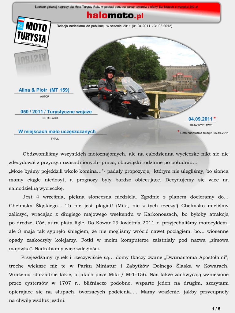 Sponsor głównej nagrody dla Moto-Turysty Roku w postaci bonu na zakup towarów z oferty Sw-Motech o wartości 300 zł. Relacja nadesłana do publikacji w sezonie 2011 (01.04.2011 - 31.03.2012) Alina & Piotr (MT 159) AUTOR 050 / 2011 / Turystyczne wojaże NR RELACJI 04.09.2011 * DATA WYPRAWY W miejscach mało uczęszczanych * Data nadesłania relacji: 05.10.2011 TYTUŁ Obdzwoniliśmy wszystkich motoznajomych, ale na całodzienną wycieczkę nikt się nie zdecydował z przyczyn uzasadnionych- praca, obowiązki rodzinne po południu… „Może byśmy pojeździli wkoło komina…”- padały propozycje, którym nie ulegliśmy, bo słońca mamy ciągle niedosyt, a prognozy były bardzo obiecujące. Decydujemy się więc na samodzielną wycieczkę. Jest 4 września, piękna słoneczna niedziela. Zgodnie z planem docieramy do… Chełmska Śląskiego… To nie jest plagiat! (Miki, nic z tych rzeczy!) Chełmsko mieliśmy zaliczyć, wracając z długiego majowego weekendu w Karkonoszach, bo byłoby atrakcją po drodze. Cóż, aura płata figle. Do Kowar 29 kwietnia 2011 r. przyjechaliśmy motocyklem, ale 3 maja tak sypnęło śniegiem, że nie mogliśmy wrócić nawet pociągiem, bo… wiosenne opady zaskoczyły kolejarzy. Fotki w moim komputerze zaistniały pod nazwą „zimowa majówka”. Nadrabiamy więc zaległości. Przejeżdżamy rynek i rzeczywiście są… domy tkaczy zwane „Dwunastoma Apostołami”, trochę większe niż te w Parku Miniatur i Zabytków Dolnego Śląska w Kowarach. Wrażenia -dokładnie takie, o jakich pisał Miki / M-T-156. Nas także zachwycają wzniesione przez cystersów w 1707 r., bliźniaczo podobne, wsparte jeden na drugim, szczytami opierające się na słupach, tworzących podcienia…. Mamy wrażenie, jakby przycupnęły na chwilę wzdłuż jezdni. 1/5 Domy przeznaczone były dla producentów płótna. W pierwszej izbie znajdowała się kuchnia, z tyłu warsztat i pokoje dla rodziny. Za domkami i dziś płynie strumień niezbędny do produkcji płótna lnianego. Wstępujemy do „Apostoła” (lub chełmskiego Don Kichota)... Może zmieniły się realia, bo w czasie naszej wizyty jego kawiarnia nazywa się już „Wiejską Chatą u Apostoła”. Reszta zgadza się dokładnie z opisem Mikiego. Nastrój niepowtarzalny, „Apostoł” bardzo towarzyski. Oczarowani miejscem zostajemy „na kawę i bombę”. 2/5 Okazuje się, że owa „Bomba Apostołów” jest pieczona w 4 częściach, 4 ewangelistów. Kiedy docieramy tutaj, na cześć „św. Marek jest już… zjedzony”. Możemy sobie wybrać apostoła godnego naszego podniebienia… Wybieram Jana… Jemy więc „bombę z Jana apostoła”. Wychodzimy do ogrodu. Z tej strony domy nie wyróżniają się niczym szczególnym, są zupełnie współczesne. My także zostajemy uraczeni „historią wierszem”. Zapłatą są rzęsiste brawa od wszystkich gości. Gospodarz ma tu pełne ręce (i usta) roboty… Ledwie skończył recytować, przybyła spora wycieczka z Czech i już pobiegł zabawiać nowych gości. My jeszcze zaglądamy do płynącego z tyłu strumienia. Znajdujemy także źródełko. „Apostoł” obiecał, że jeśli zanurzy się w nim jakąkolwiek całą część ciała, to wróci się tu całym i zdrowym. Czynimy wiec, jak zalecił. Przeciwko powrotowi, zaniedbania, „bombę” w albumie nie mamy oglądamy stare mimo tutejszego nic. Spożywając też fotografie zgromadzone i pocztówki z Chełmska. 3/5 Najbardziej żałuję, że do naszych czasów (to tylko 100 lat!) nie dotrwała regionalna kiełbasa, wędzona na szyszkach jodłowych. Ci, którzy mnie znają, wiedzą, ze z ciasta najbardziej lubię kiełbaskę. Spacerkiem jeszcze przemierzamy rynek. Piękne byłyby te kamienice z podcieniami… Dochodzimy do kościoła, ale zerknąć można tylko przez kraty. Podoba nam się tutaj bardzo, mimo wyzierającego zewsząd zaniedbania. Pogoda dopisuje, więc w drodze powrotnej kierujemy się w stronę Pilchowic. Wydawało nam się, że w tych rejonach nie ma już dla nas, stałych bywalców Karkonoszy, atrakcji. O Pilchowicach dowiadujemy się z czyjejś relacji … Naszym oczom ukazuje się potężna zapora na Bobrze. To druga co do wielkości (po Solinie) i druga co do czasu powstania (starsza jest tylko Leśna z 1907r.) zapora w Polsce. Spacerujemy długą na 290 m koroną, z niedowierzaniem spoglądając w dół. U naszych stóp, 62 m niżej (wg niektórych źródeł 69 m), stoją pokryte czerwoną dachówką budynki elektrowni wodnej. Decyzja o powstaniu tego niesamowitego obiektu zapadła po katastrofalnej w skutkach powodzi w 1897 r. Budowana w latach 1904-1912 zapora została oficjalnie otwarta przez cesarza Wilhelma II. Powstałe w ten sposób Jezioro Pilchowickie ma 240 ha powierzchni i pojemność ponad 50 mln m3. Przy parkingu, takim pożal się Boże, ale płatnym oczywiście, także dla nas, stoi budynek przyzwoicie się prezentujący. Pora popołudniowa, więc rozbudza naszą wyobraźnię „karczma” w nazwie. 4/5 Jednak szybko schodzimy na ziemię. W ofercie, bo nie nazwałabym tego menu, same fast foodowe propozycje. Szybciutko się wycofujemy. Nic tu po nas. Zjeżdżamy w dół, na z góry upatrzoną pozycję… Jest nią mostek na Bobrze. Znajdujemy go bez trudu. Stąd dopiero cały kompleks: i zapora, i przycupnięta w jej cieniu, niczym okazałe muchomory, elektrownia, wyglądają imponująco. Drewniany mostek ma nośność 1 t, więc z pewną taką nieśmiałością Piotr wjeżdża z miną dość niepewną… Udało się! To był bardzo udany dzień. Program na szóstkę z plusem, bo oglądaliśmy same nowe miejsca. Wielkim plusem była znikoma ilość turystów. Tak więc wszystko dopisało: atrakcje, pogoda i święty spokój. Pokonaliśmy 404 km, skutecznie ładując akumulatorki na najbliższy tydzień. Pozdrawiamy, Alina & Piotr (MT 159) 5/5