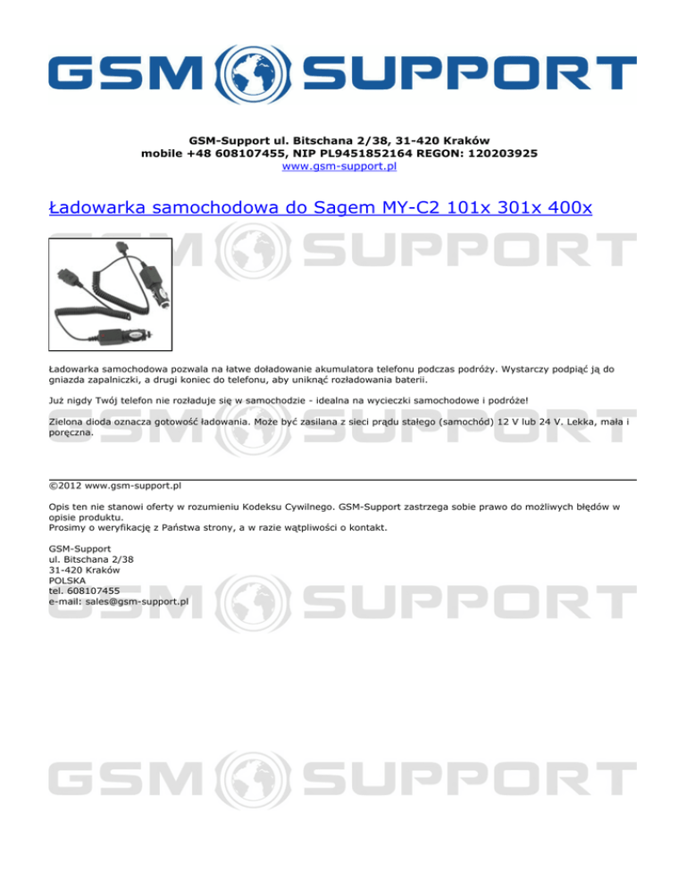 GSM-Support ul. Bitschana 2/38, 31-420 Kraków mobile +48 608107455, NIP PL9451852164 REGON: 120203925 www.gsm-support.pl Ładowarka samochodowa do Sagem MY-C2 101x 301x 400x Ładowarka samochodowa pozwala na łatwe doładowanie akumulatora telefonu podczas podróży. Wystarczy podpiąć ją do gniazda zapalniczki, a drugi koniec do telefonu, aby uniknąć rozładowania baterii. Już nigdy Twój telefon nie rozładuje się w samochodzie - idealna na wycieczki samochodowe i podróże! Zielona dioda oznacza gotowość ładowania. Może być zasilana z sieci prądu stałego (samochód) 12 V lub 24 V. Lekka, mała i poręczna. ©2012 www.gsm-support.pl Opis ten nie stanowi oferty w rozumieniu Kodeksu Cywilnego. GSM-Support zastrzega sobie prawo do możliwych błędów w opisie produktu. Prosimy o weryfikację z Państwa strony, a w razie wątpliwości o kontakt. GSM-Support ul. Bitschana 2/38 31-420 Kraków POLSKA tel. 608107455 e-mail: [email protected] Powered by TCPDF (www.tcpdf.org)