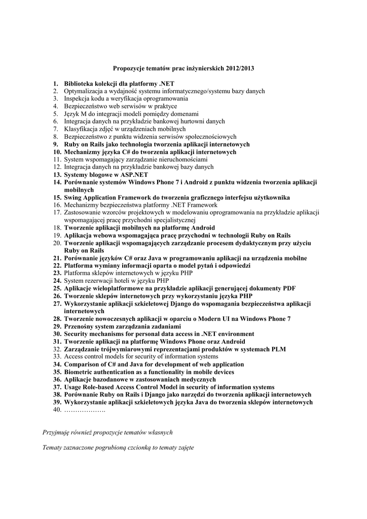 Propozycje tematów prac inżynierskich 2012/2013 1. 2. 3. 4. 5. 6. 7. 8. 9. 10. 11. 12. 13. 14. 15. 16. 17. 18. 19. 20. 21. 22. 23. 24. 25. 26. 27. 28. 29. 30. 31. 32. 33. 34. 35. 36. 37. 38. 39. 40. Biblioteka kolekcji dla platformy .NET Optymalizacja a wydajność systemu informatycznego/systemu bazy danych Inspekcja kodu a weryfikacja oprogramowania Bezpieczeństwo web serwisów w praktyce Język M do integracji modeli pomiędzy domenami Integracja danych na przykładzie bankowej hurtowni danych Klasyfikacja zdjęć w urządzeniach mobilnych Bezpieczeństwo z punktu widzenia serwisów społecznościowych Ruby on Rails jako technologia tworzenia aplikacji internetowych Mechanizmy języka C# do tworzenia aplikacji internetowych System wspomagający zarządzanie nieruchomościami Integracja danych na przykładzie bankowej bazy danych Systemy blogowe w ASP.NET Porównanie systemów Windows Phone 7 i Android z punktu widzenia tworzenia aplikacji mobilnych Swing Application Framework do tworzenia graficznego interfejsu użytkownika Mechanizmy bezpieczeństwa platformy .NET Framework Zastosowanie wzorców projektowych w modelowaniu oprogramowania na przykładzie aplikacji wspomagającej pracę przychodni specjalistycznej Tworzenie aplikacji mobilnych na platformę Android Aplikacja webowa wspomagająca pracę przychodni w technologii Ruby on Rails Tworzenie aplikacji wspomagających zarządzanie procesem dydaktycznym przy użyciu Ruby on Rails Porównanie języków C# oraz Java w programowaniu aplikacji na urządzenia mobilne Platforma wymiany informacji oparta o model pytań i odpowiedzi Platforma sklepów internetowych w języku PHP System rezerwacji hoteli w języku PHP Aplikacje wieloplatformowe na przykładzie aplikacji generującej dokumenty PDF Tworzenie sklepów internetowych przy wykorzystaniu języka PHP Wykorzystanie aplikacji szkieletowej Django do wspomagania bezpieczeństwa aplikacji internetowych Tworzenie nowoczesnych aplikacji w oparciu o Modern UI na Windows Phone 7 Przenośny system zarządzania zadaniami Security mechanisms for personal data access in .NET environment Tworzenie aplikacji na platformę Windows Phone oraz Android Zarządzanie trójwymiarowymi reprezentacjami produktów w systemach PLM Access control models for security of information systems Comparison of C# and Java for development of web application Biometric authentication as a functionality in mobile devices Aplikacje bazodanowe w zastosowaniach medycznych Usage Role-based Access Control Model in security of information systems Porównanie Ruby on Rails i Django jako narzędzi do tworzenia aplikacji internetowych Wykorzystanie aplikacji szkieletowych języka Java do tworzenia sklepów internetowych ………………. Przyjmuję również propozycje tematów własnych Tematy zaznaczone pogrubioną czcionką to tematy zajęte