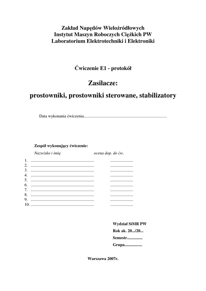 Zakład Napędów Wieloźródłowych Instytut Maszyn Roboczych CięŜkich PW Laboratorium Elektrotechniki i Elektroniki Ćwiczenie E1 - protokół Zasilacze: prostowniki, prostowniki sterowane, stabilizatory Data wykonania ćwiczenia................................................................................ Zespół wykonujący ćwiczenie: Nazwisko i imię ocena dop. do ćw. 1. ............................................................. 2. ............................................................. 3. ............................................................. 4. ............................................................. 5. ............................................................. 6. ............................................................. 7. ............................................................. 8. ............................................................. 9. ............................................................. 10. ............................................................. ...................... ...................... ...................... ...................... ...................... ...................... ...................... ...................... ...................... ...................... Wydział SiMR PW Rok ak. 20.../20... Semestr............... Grupa................. Warszawa 2007r. Spis treści 1. Cel i zakres ćwiczenia 2. Pomiary 3. Zagadnienia do opracowania 4. Literatura pomocnicza 1. Cel i zakres ćwiczenia Ćwiczenie ma na celu poznanie zasad działania i wielkości charakteryzujących: – Prostowniki: (prostowanie jest to proces, w wyniku którego z przebiegu mającego wartości dodatnie i ujemne otrzymuje się przebieg przybierający wartości tylko jednego znaku); – prostowniki sterowane:.(posiadają moŜliwość regulacji prądu i napięcia wyprostowanego, przez zmianę kąta otwarcia – przewodzenia – prostownika). i stabilizatory: (uniezaleŜniają – w ograniczonym zakresie – napięcie lub prąd od wahań napięcia zasilającego i prądu obciąŜenia). 2. Pomiary Pomiary mają na celu wyznaczenie charakterystyk wybranych prostowników jako podzespołów zasilaczy. PoniŜej zamieszczono blokowe schematy oraz tabele pomiarowe. 2.1. Prostowniki niesterowane Pomiary prostowania jedno i dwu połówkowego z obciąŜeniem rezystancyjnym i rezystancyjno – pojemnościowym (RC w układzie równoległym). Blokowy schemat pomiarowy przedstawiono na rysunku 1. Rys.1. Blokowy schemat pomiarowy gdzie: At – autotransformator 0 ÷ 250V, V1 – woltomierz elektromagnetyczny (pomiar wartości skutecznej napięcia prostowanego – U1), V2 – woltomierz cyfrowy – pomiar wartości średniej napięcia wyprostowanego (U2śr – zakres DC) i wartości skutecznej napięcia wyprostowanego (U2sk – zakres AC), A – amperomierz (I – pomiar wartości średniej prądu wyprostowanego), O – oscyloskop (Uomx – pomiar wartości maksymalnej napięcia wyprostowanego – amplitudy). Pomiary w układzie prostowania jedno połówkowego – D1; w układzie prostowania dwu połówkowego – D1-4. Ro – rezystancja obciąŜenia, C – kondensator, w1,2 – wyłącznik kondensatorów 2 2.1.1. Prostowanie w układzie jedno połówkowym (D1) przy Ro = const. 1. ObciąŜenie rezystancyjne (wyłączniki w1 i w2 otwarte); 2. ObciąŜenie rezystancyjno – pojemnościowe (wyłącznik w1 lub w2 zamknięty, lub wyłączniki w1 i w2 zamknięte). Pomiary naleŜy wykonać dla pięciu wartości napięcia U1 Tabela 1 U1 V (Ro = R01 = const.) U2śr V U2sk V 1 I A Uo X (mm) Uomx Uosk Vomx Vosk U2śr V U2sk V 2 I A Uo Uomx Uosk X(mm) VomxVosk 1 2 3 4 5 Pomiary oscyloskopowe. W celu wyznaczenia wartości skutecznej napięcia pomierzonego oscyloskopem Uosk, naleŜy skorzystać z zaleŜności: U osk = 10Xk 2 gdzie: X – amplituda [mm], k = stała zakresowa oscyloskopu [V/mm], 10 – stała dzielnika napięcia. 2.1.2. Prostowanie w układzie dwu połówkowym (D1-4) przy Ro = const. 1. ObciąŜenie rezystancyjne (wyłączniki w1 i w2 otwarte); 2. ObciąŜenie rezystancyjno – pojemnościowe (wyłącznik w1 lub w2 zamknięty, lub wyłączniki w1 i w2 zamknięte). Pomiary naleŜy wykonać dla pięciu wartości napięcia U1 Tabela 2 U1 V (Ro = R01 = const.) U2śr V U2sk V 1 I A Uo X (mm) Uomx Uosk Vomx Vosk U2śr V U2sk V 2 I A Uo Uomx Uosk X(mm) VomxVosk 1 2 3 4 5 Pomiary oscyloskopowe. W celu wyznaczenia wartości skutecznej napięcia pomierzonego oscyloskopem Uosk, naleŜy skorzystać z zaleŜności: U osk = 10Xk 2 gdzie: X – amplituda [mm], k = stała zakresowa oscyloskopu [V/mm], 10 – stała dzielnika napięcia. 3 2.1.3. Prostowanie w układzie dwu połówkowym (D1-4) przy stałej wartości U1 1. ObciąŜenie rezystancyjne (wyłączniki w1 i w2 otwarte), 2. ObciąŜenie rezystancyjno – pojemnościowe (wyłącznik w1 zamknięty), 3. ObciąŜenie rezystancyjno – pojemnościowe (wyłącznik w1 i w2 zamknięte). Pomiary naleŜy wykonać dla pięciu wartości rezystora Ro. Tabela 3 R0 (U1 = ...... V) U2sr V U2sk V 1 I A Uo mm Uosk Vosk U2śr V 2 I A U2sk Vmx Uo Mm Uosk Vosk U2śr V U2sk V 3 I A Uo mm Uosk Vosk 1 2 3 4 5 Pomiary oscyloskopowe. W celu wyznaczenia wartości skutecznej napięcia pomierzonego oscyloskopem Uosk, naleŜy skorzystać z zaleŜności: U osk = 10Xk 2 Gdzie: X – amplituda [mm], k = stała zakresowa oscyloskopu [V/mm], 10 – stała dzielnika napięcia. Na podstawie uzyskanych wyników wykonać wykresy: U2, I = f(U1) przy Ro = const. i U2 = f(I2), przy U1 = const. z zaznaczeniem wpływu pojemności. Dla prostowania jedno i dwu połówkowego wyznaczyć współczynnik szczytu określony jako: Uomx/U2sk (dla przebiegów przemiennych sinusoidalnie zmiennych współczynnik ten jest równy 2 ). 2.2. Prostowniki sterowane 2.2.1. Skalowanie przesuwnika fazowego generującego impulsy wyzwalające tyrystory Korzystając z oscyloskopowego odczytu połoŜenia (na sinusoidzie wzorcowej) impulsu wyzwalającego, wyznaczyć zaleŜność kąt