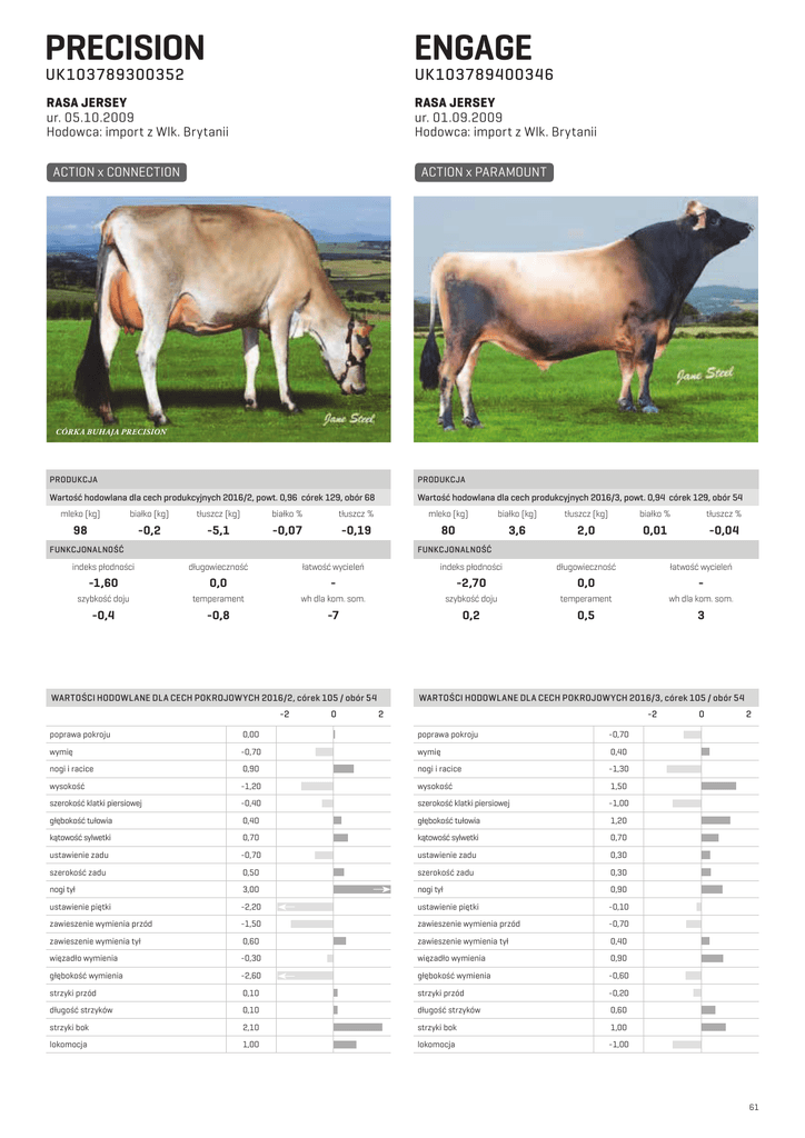 PRECISION ENGAGE UK103789300352 UK103789400346 RASA JERSEY ur. 05.10.2009 Hodowca: import z Wlk. Brytanii RASA JERSEY ur. 01.09.2009 Hodowca: import z Wlk. Brytanii ACTION x CONNECTION ACTION x PARAMOUNT CÓRK A BUHAJA PRECISION PRODUKCJA PRODUKCJA Wartość hodowlana dla cech produkcyjnych 2016/2, powt. 0,96 córek 129, obór 68 Wartość hodowlana dla cech produkcyjnych 2016/3, powt. 0,94 córek 129, obór 54 mleko (kg) białko (kg) tłuszcz (kg) białko % tłuszcz % mleko (kg) białko (kg) tłuszcz (kg) białko % tłuszcz % 98 -0,2 -5,1 -0,07 -0,19 80 3,6 2,0 0,01 -0,04 FUNKCJONALNOŚĆ FUNKCJONALNOŚĆ indeks płodności długowieczność łatwość wycieleń indeks płodności długowieczność -1,60 0,0 - -2,70 0,0 - szybkość doju temperament wh dla kom. som. szybkość doju temperament wh dla kom. som. -0,4 -0,8 -7 0,2 0,5 3 WARTOŚCI HODOWLANE DLA CECH POKROJOWYCH 2016/2, córek 105 / obór 54 -2 0 łatwość wycieleń WARTOŚCI HODOWLANE DLA CECH POKROJOWYCH 2016/3, córek 105 / obór 54 2 -2 poprawa pokroju 0,00 poprawa pokroju wymię -0,70 wymię 0,40 nogi i racice 0,90 nogi i racice -1,30 wysokość -1,20 wysokość 1,50 szerokość klatki piersiowej -0,40 szerokość klatki piersiowej -1,00 głębokość tułowia 0,40 głębokość tułowia 1,20 kątowość sylwetki 0,70 kątowość sylwetki 0,70 ustawienie zadu -0,70 ustawienie zadu 0,30 szerokość zadu 0,50 szerokość zadu 0,30 nogi tył 3,00 nogi tył 0,90 ustawienie piętki -2,20 ustawienie piętki -0,10 zawieszenie wymienia przód -1,50 zawieszenie wymienia przód -0,70 zawieszenie wymienia tył 0,60 zawieszenie wymienia tył 0,40 więzadło wymienia -0,30 więzadło wymienia 0,90 głębokość wymienia -2,60 głębokość wymienia -0,60 strzyki przód 0,10 strzyki przód -0,20 długość strzyków 0,10 długość strzyków 0,60 strzyki bok 2,10 strzyki bok 1,00 lokomocja 1,00 lokomocja -1,00 0 2 -0,70 61