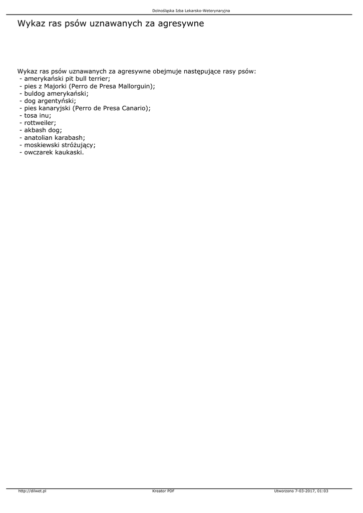 Dolnośląska Izba Lekarsko-Weterynaryjna Wykaz ras psów uznawanych za agresywne Wykaz ras psów uznawanych za agresywne obejmuje następujące rasy psów: - amerykański pit bull terrier; - pies z Majorki (Perro de Presa Mallorguin); - buldog amerykański; - dog argentyński; - pies kanaryjski (Perro de Presa Canario); - tosa inu; - rottweiler; - akbash dog; - anatolian karabash; - moskiewski stróżujący; - owczarek kaukaski. http://dilwet.pl Kreator PDF Utworzono 7-03-2017, 01:03
