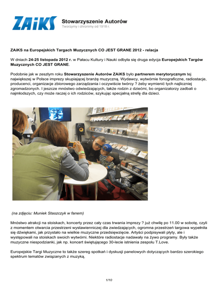 ZAiKS na Europejskich Targach Muzycznych CO JEST GRANE 2012 - relacja W dniach 24-25 listopada 2012 r. w Pałacu Kultury i Nauki odbyła się druga edycja Europejskich Targów Muzycznych CO JEST GRANE. Podobnie jak w zeszłym roku Stowarzyszenie Autorów ZAiKS było partnerem merytorycznym tej największej w Polsce imprezy skupiającej branżę muzyczną. Wydawcy, wytwórnie fonograficzne, radiostacje, producenci, organizacje zbiorowego zarządzania i oczywiście twórcy ? żeby wymienić tych najliczniej zgromadzonych. I jeszcze mnóstwo odwiedzających, także rodzin z dziećmi, bo organizatorzy zadbali o najmłodszych, czy może raczej o ich rodziców, szykując specjalną strefę dla dzieci. (na zdjęciu: Muniek Staszczyk w fanem) Mnóstwo atrakcji na stoiskach, koncerty przez cały czas trwania imprezy ? już chwilę po 11.00 w sobotę, czyli z momentem otwarcia przestrzeni wystawienniczej dla zwiedzających, ogromna przestrzeń targowa wypełniła się dźwiękami, jak przystało na wielkie muzyczne przedsięwzięcie. Artyści podpisywali płyty, ale i występowali na stoiskach swoich wytwórni. Niektóre radiostacje nadawały na żywo programy. Były także muzyczne niespodzianki, jak np. koncert świętującego 30-lecie istnienia zespołu T.Love. Europejskie Targi Muzyczne to także szereg spotkań i dyskusji panelowych dotyczących bardzo szerokiego spektrum tematów związanych z muzyką. 1/10 W sobotę o 12.00 w panelu otwarcia Gdzie są muzyczne orliki? wziął udział prezes ZAiKS-u Janusz Fogler. Wśród gości byli także: Marek Kraszewski (dyrektor Biura Kultury m.st. Warszawy), Anna Michalak (członek Rady Programowej Warszawskiego Programu Edukacji Kulturalnej), Agnieszka Wolak (rzecznik prasowy Narodowego Instytutu Audiowizualnego / Muzykoteka Szkolna), Viola Łabanow (Fundacja ,,Muzyka jest dla wszystkich''), Joanna Kiliszek (zastępca dyrektora Instytutu Adama Mickiewicza), Asi Mina (muzyk, animator kultury), Janusz Marynowski (Sinfonia Varsovia), Andrzej Kosowski (dyrektor Instytutu Muzyki i Tańca), Andrzej Puczyński (przewodniczący ZPAV), Jacek Strzemieczny (prezes Fundacji Centrum Edukacji Obywatelskiej). Spotkanie poprowadził Stanisław Trzciński (menadżer kultury i promotor koncertowy, Agencja STX Jamboree). Spotkanie dotyczyło kwestii edukacji muzycznej ? działań, jakie podjąć trzeba, by nie zaniedbać zupełnie tej sfery. Prezes Fogler przywołał projekt edukacyjny ZAiKS-u: ,,Poniedziałki pod Królami''. Dotyczy on edukacji w dziedzinie prawa autorskiego, którego znajomość jest istotna dla twórców czy osób wykorzystujących ich utwory. Wyraził też nadzieję na rozszerzenie owocnej, ale wymagającej intensyfikacji współpracy z urzędami miast. (na zdjęciu: Viola Łabanow, Andrzej Kosowski, Joanna Kiliszek, Janusz Fogler, Andrzej Puczyński i Jacek Strzemieczny) Andrzej Puczyński podkreślał, że zrozumienie dla prawa autorskiego będzie tym większe, im intensywniejsza będzie edukacja. Ważne jest wykształcenie odbiorcy, zwłaszcza przez aktywny udział w muzyce, ale równie ważne jest zrozumienie procesów prawa autorskiego. I tu istotna jest współpraca między organizacjami zbiorowego zarządzania, wzorem działań na świecie. Prowadzący panel Stanisław Trzciński dopytywał o klucz do poprawienia systemu edukacji muzycznej w Polsce. Zarzucał politykom, że interesują się tylko dofinansowaniem edukacji sportowej. Jest ona istotnym elementem rozwoju w myśl zasady ,,w zdrowym ciele zdrowy duch'', przekonywał, nie dba się jednak zbytnio o podstawową edukację muzyczną czy plastyczną, ignorując wpływ takiego wykształcenia na wzmiankowanego ducha. Przywoływał szereg badań, które dowodzą, że wykształcenie muzyczne ma wpływ na ogólny rozwój intelektualny dzieci. 2/10 Viola Łabanow przedstawiła owoce pracy ekspertów Polskiej Rady Muzycznej ? postulaty czy może recepty, co robić, by poprawić istniejącą sytuację edukacyjną. Mówiła między innymi o konieczności stworzenia sieci szkolnych i pozaszkolnych pracowni muzycznych, wprowadzenie do szkół indywidualnej i grupowej nauki gry na instrumentach, ale także z drugiej strony: poprawić system przygotowywania nauczycieli. Dobrym rozwiązaniem mogłoby być zaangażowanie znanych muzyków w edukację umuzykalniającą. Z panelem otwarcia zazębiło się niemal inne spotkanie, w którym pojawili się przedstawiciele ZAiKS-u: o 13.30 odbył się wspólny panel ZAiKS-u i ZPAV-u: Fonodżungla? Jak nie zginąć w gąszczu przepisów i ochronić twórczość ? poświęcony zagadnieniom praw autorskich i zasad działania organizacji zbiorowego zarządzania, funkcjonowania rynku fonograficznego. (na zdjęciu od lewej: Monika Małkowska, Marek Hojda, Marek Staszewski) Ze strony ZPAV-u wzięli w nim udział: Marek Staszewski ? pełnomocnik prawny ZPAV i Andrzej Puczyński ? przewodniczący Zarządu ZPAV. ZAiKS reprezentowali: Marek Hojda ? kompozytor, członek Zarządu Stowarzyszenia Autorów ZAiKS i Krzysztof Lewandowski ? dyrektor generalny ZAiKS-u. Spotkanie poprowadziła Monika Małkowska. Moderatorka wykorzystała czas maksymalnie, sprawnie wypytując panelistów najpierw o zasady działania i historyczne zaplecze reprezentowanych przez nich organizacji, a następnie przechodząc do pytań bardziej praktycznych. Dopytywała o członkostwo i zasadność dbania o prawa autorskie. Marek Staszewski odwoływał się do naszych codziennych doświadczeń ? dziś chyba każdy ma odtwarzacz muzyki, czy to tradycyjny, czy też ukryty w telefonie, zatem każdy jest przez to związany z prawami autorskimi. Bardzo ważne jest bezpieczeństwo prawne i finansowe dla producentów, wykonawców i autorów. ZAiKS i ZPAV starają się to zapewnić. Ale kluczowy jest także nacisk na tych, którzy twórczość eksploatują. Krzysztof Lewandowski podkreślał demokratyczny charakter działalności organizacji zbiorowego zarządzania ? wielcy kompozytorzy i początkujący twórcy