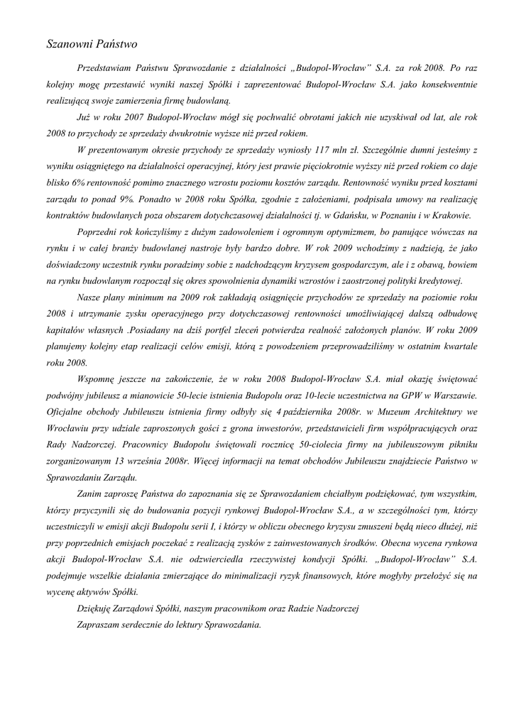 Szanowni Państwo Przedstawiam Państwu Sprawozdanie z działalności „Budopol-Wrocław” S.A. za rok 2008. Po raz kolejny mogę przestawić wyniki naszej Spółki i zaprezentować Budopol-Wrocław S.A. jako konsekwentnie realizującą swoje zamierzenia firmę budowlaną. JuŜ w roku 2007 Budopol-Wrocław mógł się pochwalić obrotami jakich nie uzyskiwał od lat, ale rok 2008 to przychody ze sprzedaŜy dwukrotnie wyŜsze niŜ przed rokiem. W prezentowanym okresie przychody ze sprzedaŜy wyniosły 117 mln zł. Szczególnie dumni jesteśmy z wyniku osiągniętego na działalności operacyjnej, który jest prawie pięciokrotnie wyŜszy niŜ przed rokiem co daje blisko 6% rentowność pomimo znacznego wzrostu poziomu kosztów zarządu. Rentowność wyniku przed kosztami zarządu to ponad 9%. Ponadto w 2008 roku Spółka, zgodnie z załoŜeniami, podpisała umowy na realizację kontraktów budowlanych poza obszarem dotychczasowej działalności tj. w Gdańsku, w Poznaniu i w Krakowie. Poprzedni rok kończyliśmy z duŜym zadowoleniem i ogromnym optymizmem, bo panujące wówczas na rynku i w całej branŜy budowlanej nastroje były bardzo dobre. W rok 2009 wchodzimy z nadzieją, Ŝe jako doświadczony uczestnik rynku poradzimy sobie z nadchodzącym kryzysem gospodarczym, ale i z obawą, bowiem na rynku budowlanym rozpoczął się okres spowolnienia dynamiki wzrostów i zaostrzonej polityki kredytowej. Nasze plany minimum na 2009 rok zakładają osiągnięcie przychodów ze sprzedaŜy na poziomie roku 2008 i utrzymanie zysku operacyjnego przy dotychczasowej rentowności umoŜliwiającej dalszą odbudowę kapitałów własnych .Posiadany na dziś portfel zleceń potwierdza realność załoŜonych planów. W roku 2009 planujemy kolejny etap realizacji celów emisji, którą z powodzeniem przeprowadziliśmy w ostatnim kwartale roku 2008. Wspomnę jeszcze na zakończenie, Ŝe w roku 2008 Budopol-Wrocław S.A. miał okazję świętować podwójny jubileusz a mianowicie 50-lecie istnienia Budopolu oraz 10-lecie uczestnictwa na GPW w Warszawie. Oficjalne obchody Jubileuszu istnienia firmy odbyły się 4 października 2008r. w Muzeum Architektury we Wrocławiu przy udziale zaproszonych gości z grona inwestorów, przedstawicieli firm współpracujących oraz Rady Nadzorczej. Pracownicy Budopolu świętowali rocznicę 50-ciolecia firmy na jubileuszowym pikniku zorganizowanym 13 września 2008r. Więcej informacji na temat obchodów Jubileuszu znajdziecie Państwo w Sprawozdaniu Zarządu. Zanim zaproszę Państwa do zapoznania się ze Sprawozdaniem chciałbym podziękować, tym wszystkim, którzy przyczynili się do budowania pozycji rynkowej Budopol-Wrocław S.A., a w szczególności tym, którzy uczestniczyli w emisji akcji Budopolu serii I, i którzy w obliczu obecnego kryzysu zmuszeni będą nieco dłuŜej, niŜ przy poprzednich emisjach poczekać z realizacją zysków z zainwestowanych środków. Obecna wycena rynkowa akcji Budopol-Wrocław S.A. nie odzwierciedla rzeczywistej kondycji Spółki. „Budopol-Wrocław” S.A. podejmuje wszelkie działania zmierzające do minimalizacji ryzyk finansowych, które mogłyby przełoŜyć się na wycenę aktywów Spółki. Dziękuję Zarządowi Spółki, naszym pracownikom oraz Radzie Nadzorczej Zapraszam serdecznie do lektury Sprawozdania.