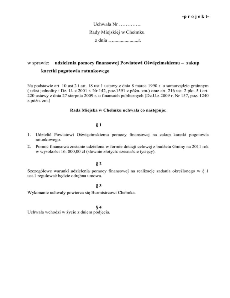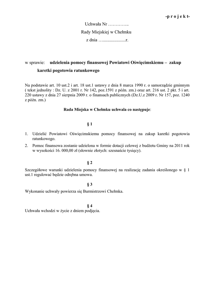 -p r o j e k tUchwała Nr ………….. Rady Miejskiej w Chełmku z dnia …....................r. w sprawie: udzielenia pomocy finansowej Powiatowi Oświęcimskiemu – zakup karetki pogotowia ratunkowego Na podstawie art. 10 ust.2 i art. 18 ust.1 ustawy z dnia 8 marca 1990 r. o samorządzie gminnym ( tekst jednolity : Dz. U. z 2001 r. Nr 142, poz.1591 z późn. zm.) oraz art. 216 ust. 2 pkt. 5 i art. 220 ustawy z dnia 27 sierpnia 2009 r. o finansach publicznych (Dz.U.z 2009 r. Nr 157, poz. 1240 z późn. zm.) Rada Miejska w Chełmku uchwala co następuje: §1 1. Udzielić Powiatowi Oświęcimskiemu pomocy finansowej na zakup karetki pogotowia ratunkowego. 2. Pomoc finansowa zostanie udzielona w formie dotacji celowej z budżetu Gminy na 2011 rok w wysokości 16. 000,00 zł (słownie złotych: szesnaście tysięcy). §2 Szczegółowe warunki udzielenia pomocy finansowej na realizację zadania określonego w § 1 ust.1 regulować będzie odrębna umowa. §3 Wykonanie uchwały powierza się Burmistrzowi Chełmka. §4 Uchwała wchodzi w życie z dniem podjęcia. Uzasadnienie: Zarząd Powiatu Oświęcimskiego zwrócił się do tut. Urzędu z prośbą o pomoc w zakupie karetki pogotowia ratunkowego przeznaczonej do udzielania pomocy medycznej mieszkańcom Powiatu Oświęcimskiego. Mając na uwadze dobro mieszkańców gminy Chełmek oraz w trosce o ich zdrowie postanowiono udzielić pomocy finansowej na zakup karetki pogotowia w kwocie 16.000,00 zł.