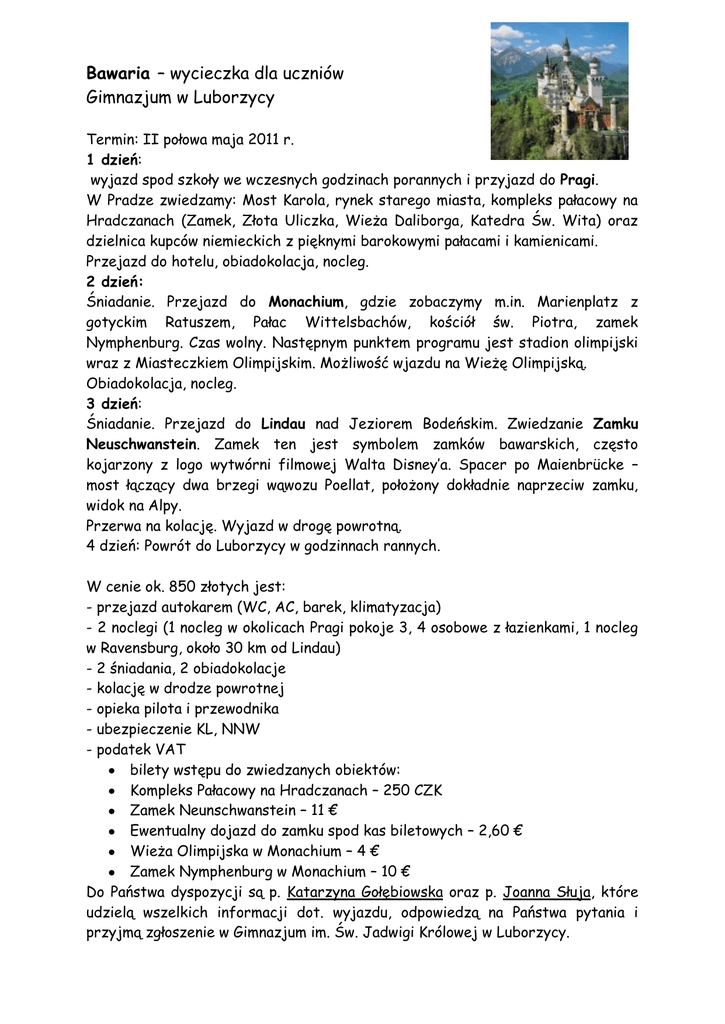 Bawaria – wycieczka dla uczniów Gimnazjum w Luborzycy Termin: II połowa maja 2011 r. 1 dzień: wyjazd spod szkoły we wczesnych godzinach porannych i przyjazd do Pragi. W Pradze zwiedzamy: Most Karola, rynek starego miasta, kompleks pałacowy na Hradczanach (Zamek, Złota Uliczka, Wieża Daliborga, Katedra Św. Wita) oraz dzielnica kupców niemieckich z pięknymi barokowymi pałacami i kamienicami. Przejazd do hotelu, obiadokolacja, nocleg. 2 dzień: Śniadanie. Przejazd do Monachium, gdzie zobaczymy m.in. Marienplatz z gotyckim Ratuszem, Pałac Wittelsbachów, kościół św. Piotra, zamek Nymphenburg. Czas wolny. Następnym punktem programu jest stadion olimpijski wraz z Miasteczkiem Olimpijskim. Możliwość wjazdu na Wieżę Olimpijską. Obiadokolacja, nocleg. 3 dzień: Śniadanie. Przejazd do Lindau nad Jeziorem Bodeńskim. Zwiedzanie Zamku Neuschwanstein. Zamek ten jest symbolem zamków bawarskich, często kojarzony z logo wytwórni filmowej Walta Disney’a. Spacer po Maienbrücke – most łączący dwa brzegi wąwozu Poellat, położony dokładnie naprzeciw zamku, widok na Alpy. Przerwa na kolację. Wyjazd w drogę powrotną. 4 dzień: Powrót do Luborzycy w godzinnach rannych. W cenie ok. 850 złotych jest: - przejazd autokarem (WC, AC, barek, klimatyzacja) - 2 noclegi (1 nocleg w okolicach Pragi pokoje 3, 4 osobowe z łazienkami, 1 nocleg w Ravensburg, około 30 km od Lindau) - 2 śniadania, 2 obiadokolacje - kolację w drodze powrotnej - opieka pilota i przewodnika - ubezpieczenie KL, NNW - podatek VAT bilety wstępu do zwiedzanych obiektów: Kompleks Pałacowy na Hradczanach – 250 CZK Zamek Neunschwanstein – 11 € Ewentualny dojazd do zamku spod kas biletowych – 2,60 € Wieża Olimpijska w Monachium – 4 € Zamek Nymphenburg w Monachium – 10 € Do Państwa dyspozycji są p. Katarzyna Gołębiowska oraz p. Joanna Słuja, które udzielą wszelkich informacji dot. wyjazdu, odpowiedzą na Państwa pytania i przyjmą zgłoszenie w Gimnazjum im. Św. Jadwigi Królowej w Luborzycy.