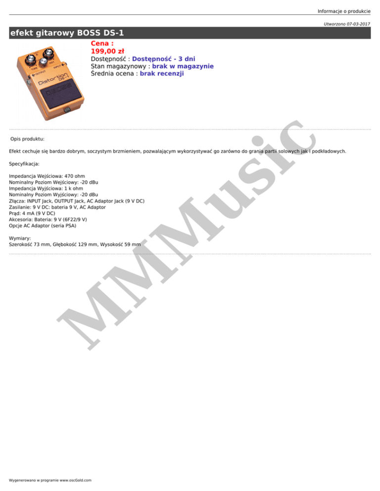 Informacje o produkcie Utworzono 07-03-2017 efekt gitarowy BOSS DS-1 Cena : 199,00 zł Dostępność : Dostępność - 3 dni Stan magazynowy : brak w magazynie Średnia ocena : brak recenzji ic Opis produktu: Efekt cechuje się bardzo dobrym, soczystym brzmieniem, pozwalającym wykorzystywać go zarówno do grania partii solowych jak i podkładowych. M Impedancja Wejściowa: 470 ohm Nominalny Poziom Wejściowy: -20 dBu Impedancja Wyjściowa: 1 k ohm Nominalny Poziom Wyjściowy: -20 dBu Złącza: INPUT Jack, OUTPUT Jack, AC Adaptor Jack (9 V DC) Zasilanie: 9 V DC: bateria 9 V, AC Adaptor Prąd: 4 mA (9 V DC) Akcesoria: Bateria: 9 V (6F22/9 V) Opcje AC Adaptor (seria PSA) us Specyfikacja: M M Wymiary: Szerokość 73 mm, Głębokość 129 mm, Wysokość 59 mm Wygenerowano w programie www.oscGold.com