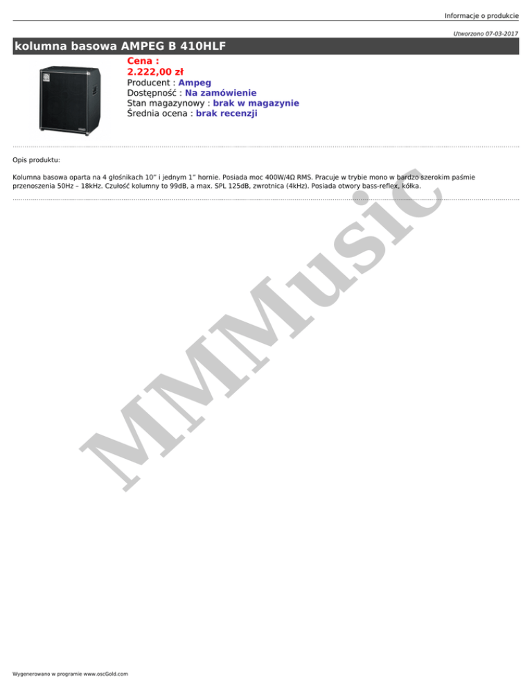 Informacje o produkcie Utworzono 07-03-2017 kolumna basowa AMPEG B 410HLF Cena : 2.222,00 zł Producent : Ampeg Dostępność : Na zamówienie Stan magazynowy : brak w magazynie Średnia ocena : brak recenzji Opis produktu: M M M us ic Kolumna basowa oparta na 4 głośnikach 10” i jednym 1” hornie. Posiada moc 400W/4Ω RMS. Pracuje w trybie mono w bardzo szerokim paśmie przenoszenia 50Hz – 18kHz. Czułość kolumny to 99dB, a max. SPL 125dB, zwrotnica (4kHz). Posiada otwory bass-reflex, kółka. Wygenerowano w programie www.oscGold.com
