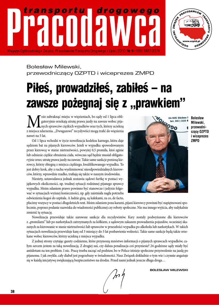 Pracodawca transportu drogowego Bolesław Milewski, przewodniczący OZPTD i wiceprezes ZMPD Piłeś, prowadziłeś, zabiłeś – na zawsze pożegnaj się z „prawkiem” M oże zabraknąć miejsc w więzieniach, bo sądy od 1 lipca obligatoryjnie orzekają utratę prawa jazdy na zawsze wobec pijanych sprawców ciężkich wypadków oraz tych, którzy uciekną z miejsca zdarzenia. „Dwugazowi” recydywiści mogą trafić do więzienia nawet na 5 lat. Od 1 lipca wchodzi w życie nowelizacja kodeksu karnego, która daje sędziom bat na pijanych kierowców. Jeżeli w wypadku spowodowanym przez kierowcę w stanie nietrzeźwości, powyżej 0,5 promila, ktoś zginie lub odniesie ciężkie obrażenia ciała, wówczas sąd będzie musiał obligatoryjnie orzec utratę prawa jazdy na zawsze. Takie same sankcje poniosą kierowcy, którzy zbiegną z miejsca ciężkiego, kwalifikowanego wypadku. To jest dobry krok, aby z ruchu wyeliminować nieodpowiedzialnych kierowców, którzy, wprawdzie rzadko, trafiają się także w naszym środowisku. Niestety, ustawodawca jednak zostawia sądowi furtkę w postaci wyjątkowych okoliczności, np. trudnej sytuacji rodzinnej pijanego sprawcy wypadku. Moim zdaniem prawo powinno być stanowcze i jedynie folgować w sytuacjach wyższej konieczności, np. gdy zaistniała nagła potrzeba odwiezienia kogoś do szpitala. A ludzie giną, są kalekami, za co, de facto, płacimy wszyscy w postaci długoletnich rent. Moim zdaniem poza karami, pijani kierowcy powinni być napiętnowani społecznie, poprzez podanie nazwiska do wiadomości publicznej czy roboty społeczne. Nie ma innego wyjścia, aby radykalnie zmienić tę sytuację. Nowelizacja przewiduje także surowsze sankcje dla recydywistów. Kary zostały podwyższone dla kierowców z „promilami” lub po narkotykach zatrzymanych za kółkiem, z sądowym zakazem prowadzenia pojazdów, wcześniej skazanych za kierowanie w stanie nietrzeźwości lub sprawców w przeszłości wypadku po alkoholu lub narkotykach. W takich sytuacjach nowelizacja przewiduje karę od 3 miesięcy do 5 lat pozbawienia wolności. Takie same sankcje będą także orzekane wobec kierowców, którzy uciekną z miejsca wypadku. Z jednej strony czytając gazety codzienne, które przynoszą mnóstwo informacji o pijanych sprawcach wypadków, całym sercem jestem za taką nowelizacją. Z drugiej zaś, czy dalsza penalizacja coś przyniesie? 24-godzinne sądy miały być antidotum na ten problem. I nic. Pracę trzeba zacząć od podstaw, bo w Polsce istnieje społeczne przyzwolenie na jazdę po pijanemu. I jak zwykle, cały diabeł jest pogrzebany w świadomości. Nasz Związek dokładnie o tym wie i czynnie angażuje się w każdą inicjatywę zwiększającą bezpieczeństwo na drodze. Przed nami jednak jeszcze długa droga… Bolesław Milewski 38 Bolesław Milewski, przewodniczący OZPTD i wiceprezes ZMPD Szkolenia, temat gorący Spotkanie OZPTD w Rzeszowie. Ponad 30 przewoźników z województwa podkarpackiego wzięło udział w cyklicznym spotkaniu regionalnym. Do Rzeszowa przybyli także dyrektor generalny OZPTD Piotr Grześ i Maciej Wroński, dyrektor Biura Prawnego OZPTD. Zebranie poprowadził Adam Łobaza – przewodniczący regionu podkarpackiego. O szkoleniach. Wiodącym tematem spotkania były szkolenia kierowców i przewoźników. Dyrektor Piotr Grześ w swoim wystąpieniu zwrócił szczególną uwagę na fakt, że ustawodawca podzielił kierowców samochodów ciężarowych i autobusów na dwie grupy – tych, którzy już wcześniej uzyskali uprawnienia do kierowania pojazdami oraz kierowców nowych, którzy w przypadku kat. D otrzymali prawo jazdy do 10 września 2008 roku, a w przypadku kat. C do 10 września 2009 roku. Kierowcy pierwszej grupy, zgodnie z zapisami ustawy, muszą przejść co 5 lat kwalifikację okresową. Jest to odrębny rodzaj szkolenia, obejmujący swoim cyklem 35 godzin zajęć teoretycznych. Ustawodawca wyznaczył obligatoryjne terminy ukończenia pierwszego takiego kursu. Są one uzależnione od daty uzyskania danego uprawnienia (patrz tabela). Kierowcy, którzy świeżo nabyli uprawnienia do prowadzenia samochodów ciężarowych i autobusów zobowiązani są do odbycia kwalifikacji wstępnej, która w zależności od wieku kierowcy (granicą jest ukończenie 21 roku życia) obejmuje w sumie 280, bądź 140 godzin zajęć teoretycznych i praktycznych. W spotkaniu uczestniczyło 30 przewoźników z regionu Podkarpacia Lepiej pospieszyć się. W przypadku kierowców zakwalifikowanych do kwalifikacji okresowej dyrektor Grześ zaleca ukończenie tego szkolenia odpowiednio wcześniej, uwzględniając czas na wydanie nowego dokumentu przez stosowne wydziały komunikacji. Zdaniem dyrektora Grzesia wydanie takiego dokumentu z wpisanym kodem 95, uprawniającym do wykonywania zawodu kierowcy, może zająć urzędowi nawet do miesiąca. Dla kierowców do 60 roku życia ustawodawca przewiduje także wykonanie badań lekarskich w okresie co 5 lat, a w przypadku kierowców powyżej 60 roku życia co 30 miesięcy. Kierowcy, którzy ukończą kurs kwalifikacji okresowej, a posiadali wcześniej aktualne badania lekarskie, będą niestety zmuszeni do ponownego poddania się tym badaniom, ponosząc dodatkowe koszty. W przypadku posiadania przez kierowcę 2 kategorii (np. C i D) do wpisania kodu 95 przy wszystkich potrzebnych kategoriach w prawie jazdy wystarczy, zda- niem dyrektora Wrońskiego, ukończenie tylko jednego kursu tematycznego. Związek przygotowany. W dalszej części dyrektor Grześ zaznaczył, że OZPTD jest przygotowane do przeprowadzenia wszelkich rodzajów szkoleń – kwalifikacji wstępnej, kwalifikacji okresowej, szkoleń CPC czy z zakresu czasu pracy kierowców. Te zadania mogą być realizowane przez sieć 126 ośrodków szkoleniowych, wpisanych w rejestrach poszczególnych wojewodów. Aby spełnić wymóg ustawowy, związek zakupił niezbędne pojazdy – autobus i samochód ciężarowy z odłączanymi sys